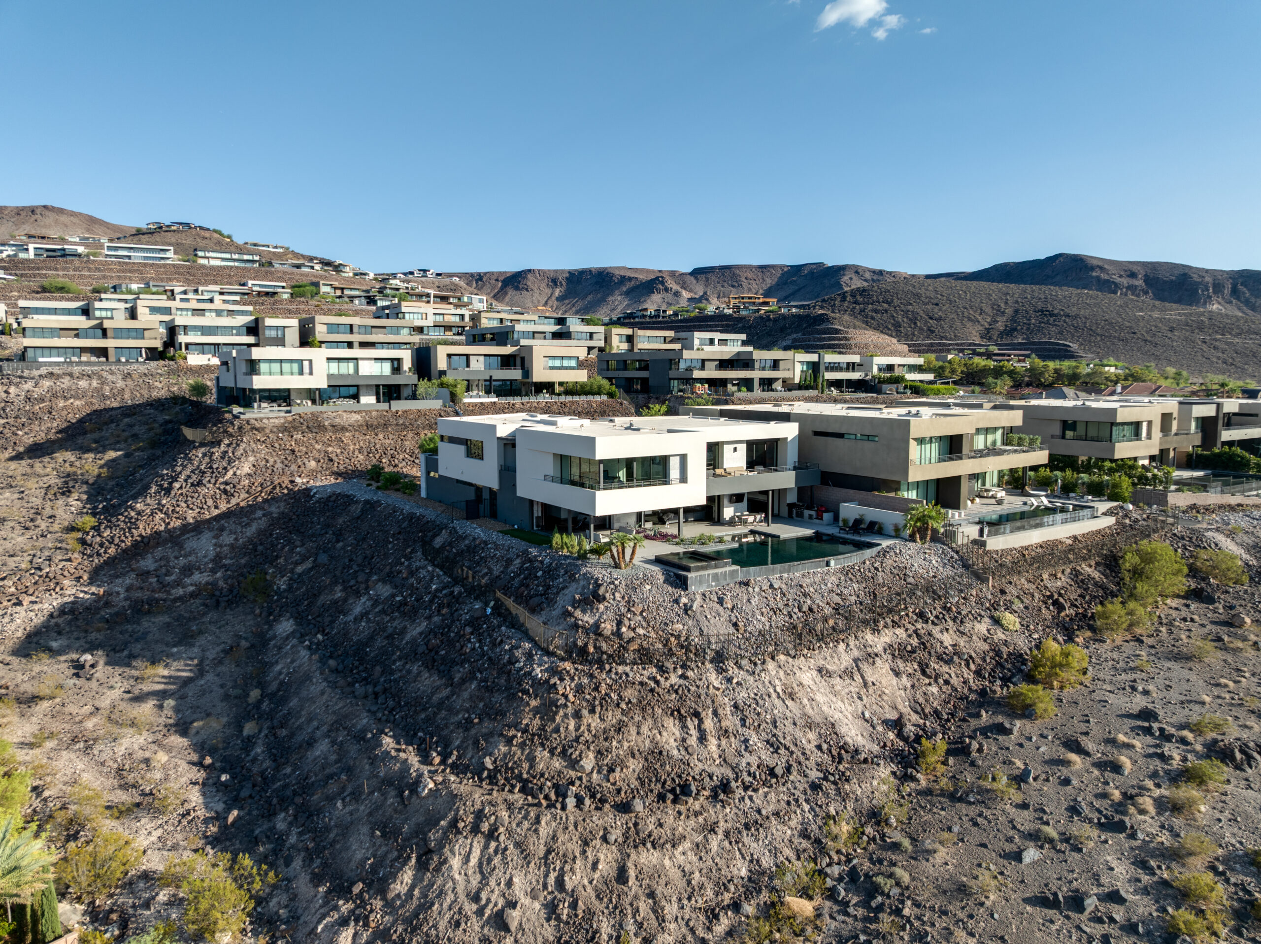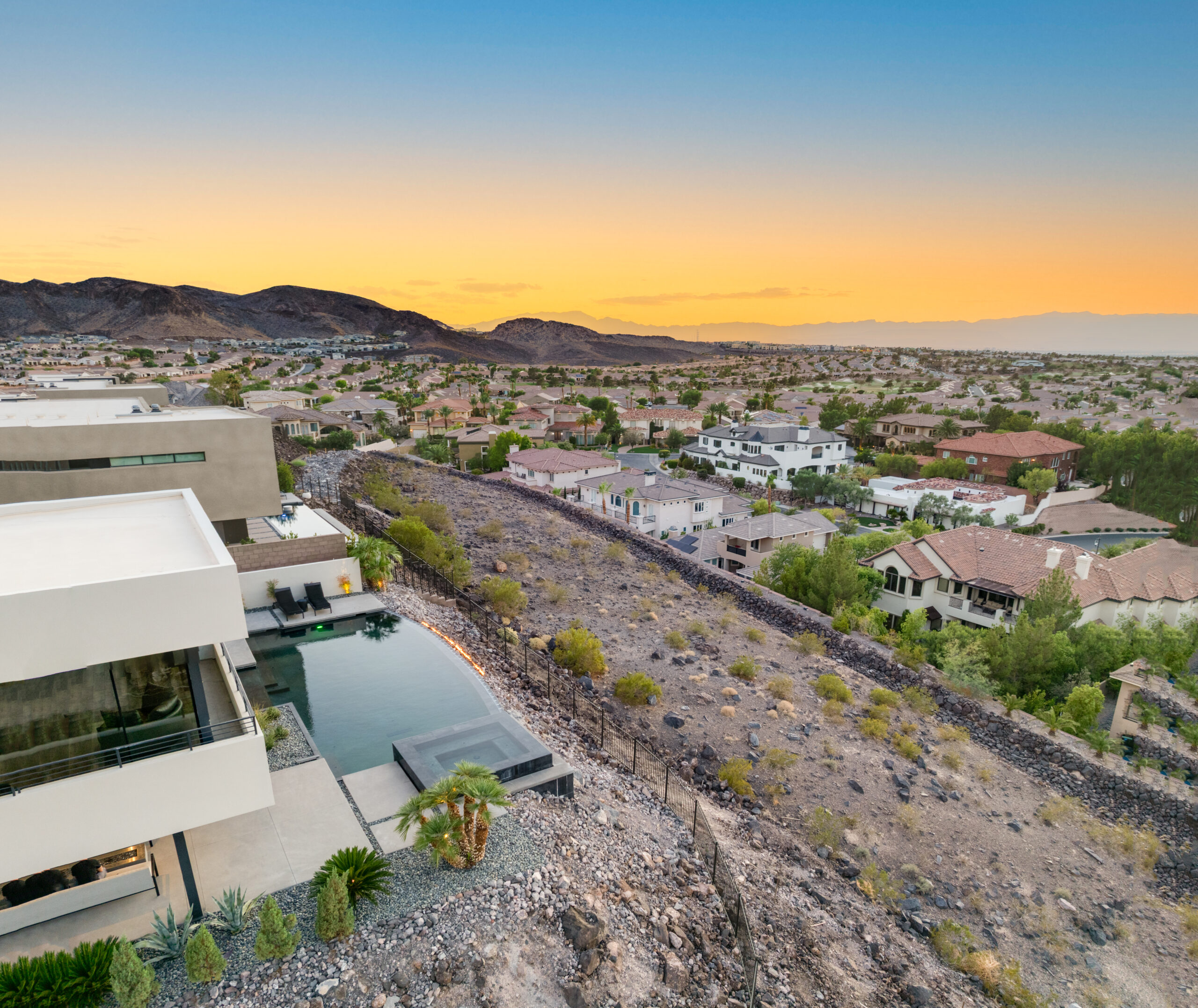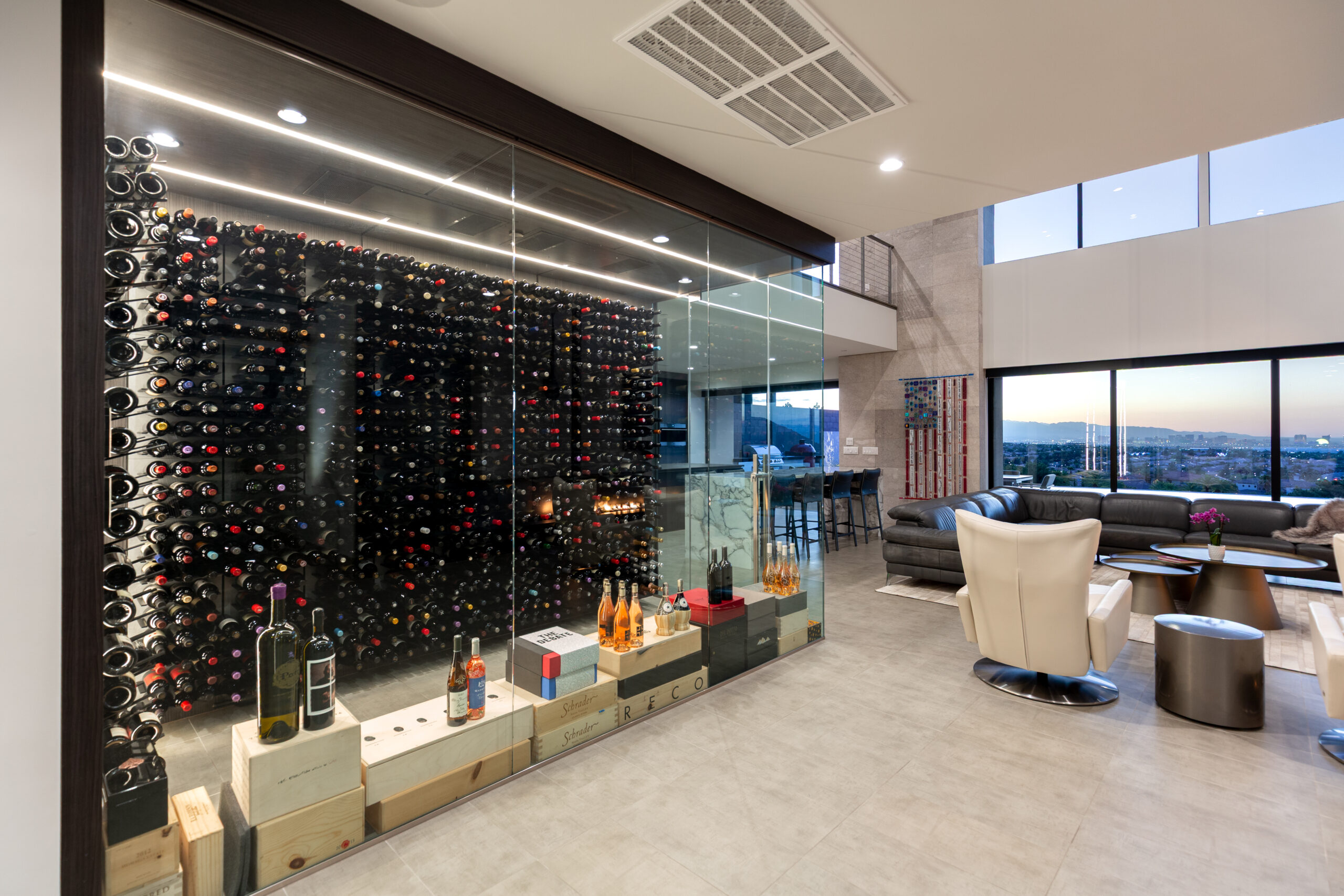 Perched on the prime corner lot of Roma Hills’ exclusive Obsidian enclave, this custom Blue Heron estate showcases forever Strip, valley, and mountain views. A private courtyard reveals a floating staircase and 1,200-bottle glass wine cellar with concrete STACT racking and dual temperature systems. Disappearing pocket doors and soaring ceilings create seamless indoor-outdoor living, anchored by a sleek linear fireplace and waterfall granite island.