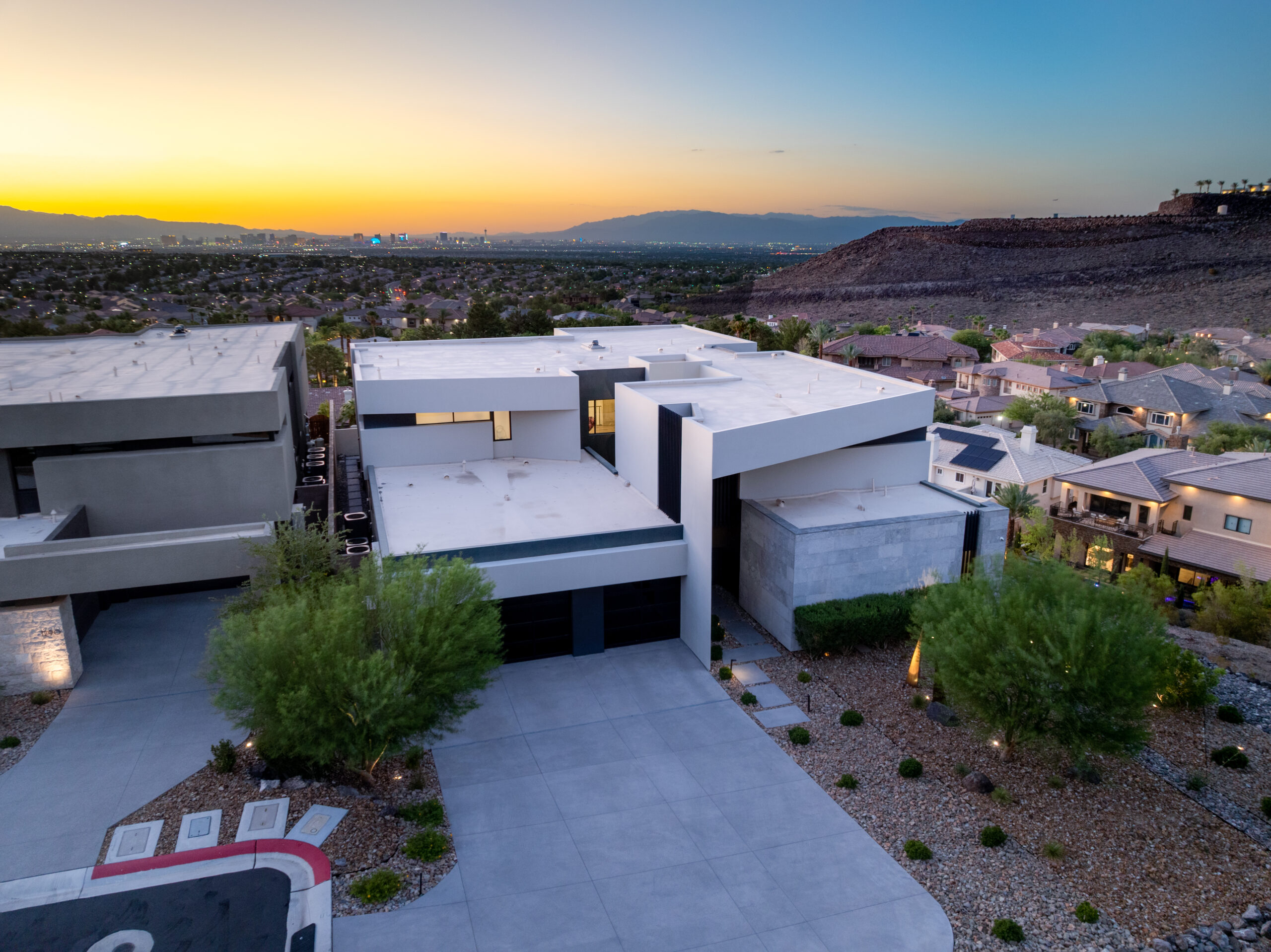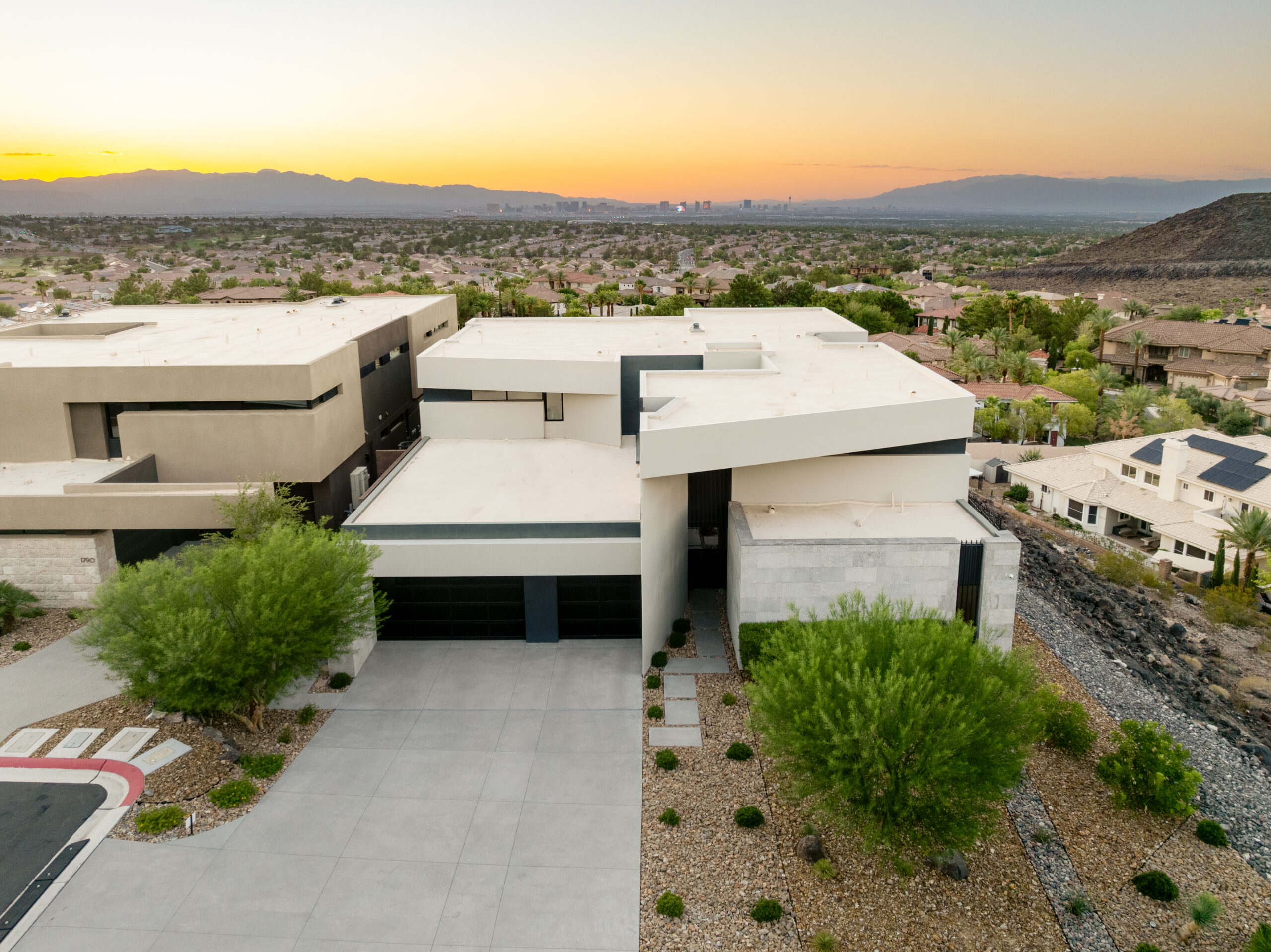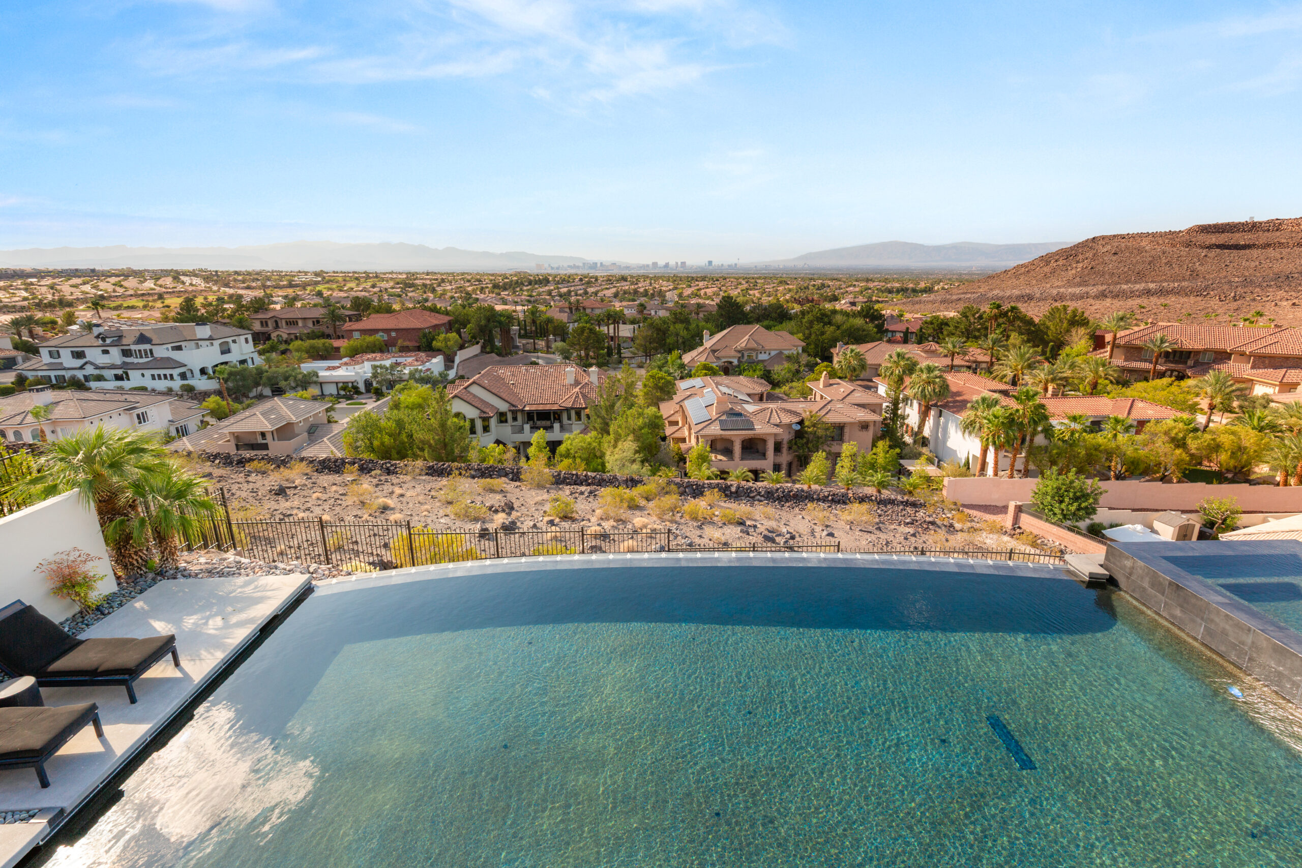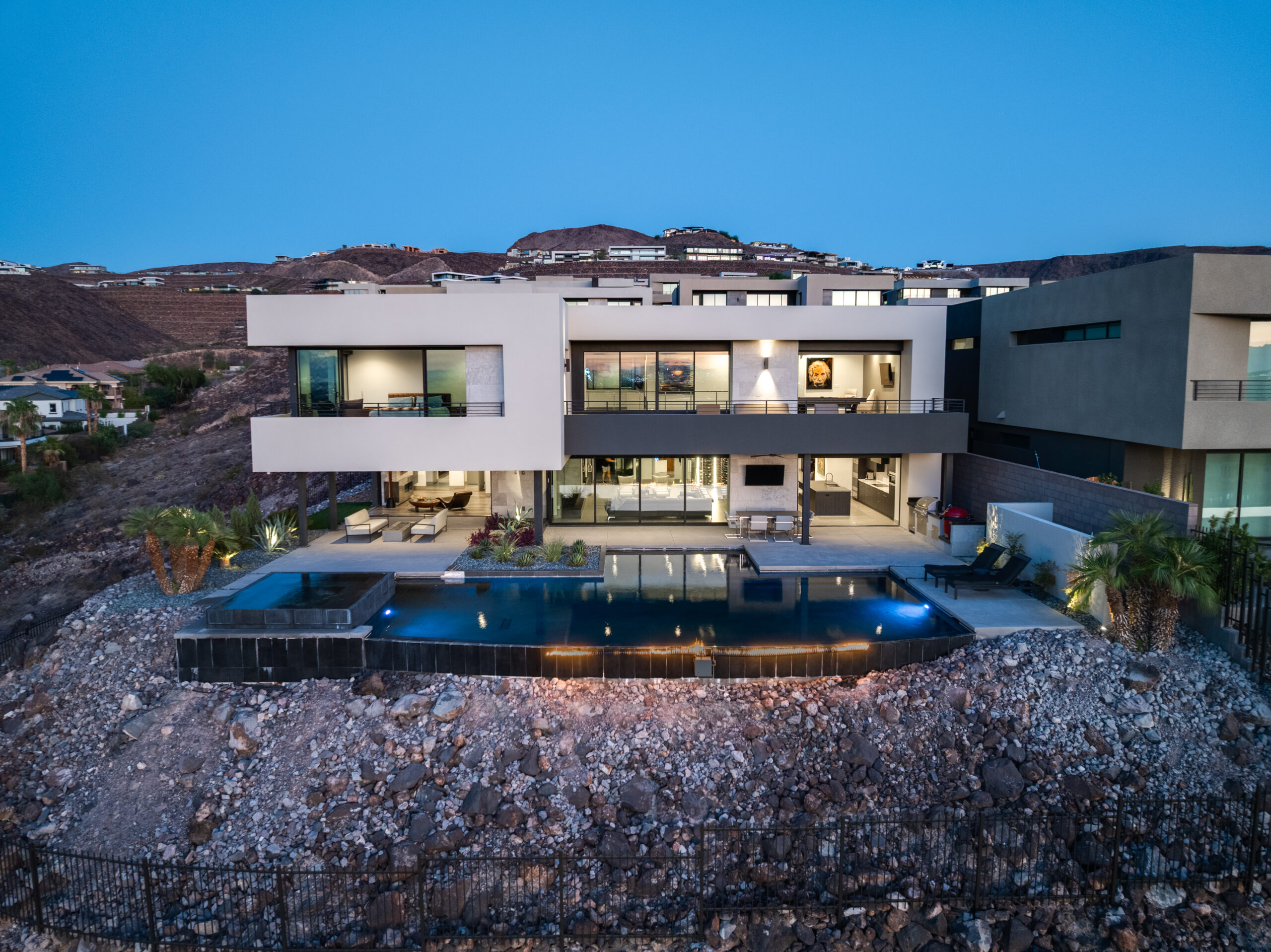 Perched on the prime corner lot of Roma Hills’ exclusive Obsidian enclave, this custom Blue Heron estate showcases forever Strip, valley, and mountain views. A private courtyard reveals a floating staircase and 1,200-bottle glass wine cellar with concrete STACT racking and dual temperature systems. Disappearing pocket doors and soaring ceilings create seamless indoor-outdoor living, anchored by a sleek linear fireplace and waterfall granite island.