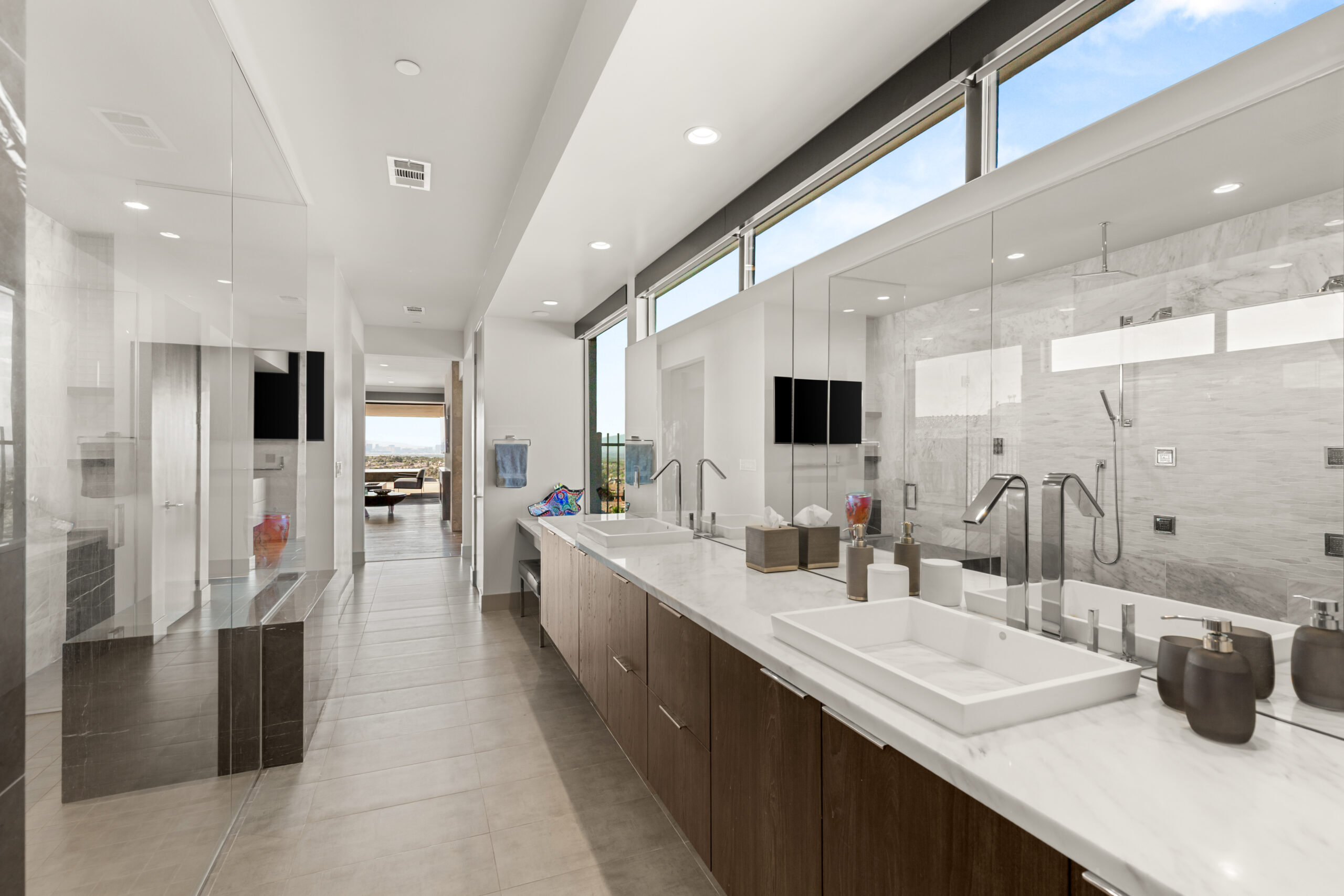 The chef’s kitchen combines functionality and visual impact, with custom cabinetry, professional-grade appliances, and a butler’s pantry. Framed by energy-efficient windows, every angle showcases breathtaking Strip and mountain views.