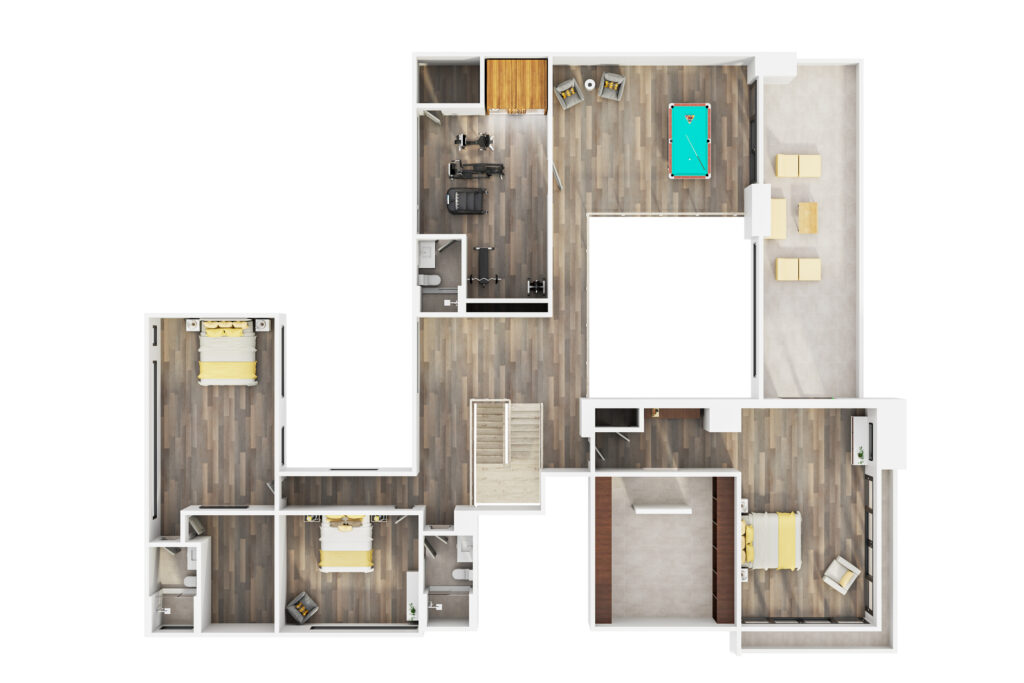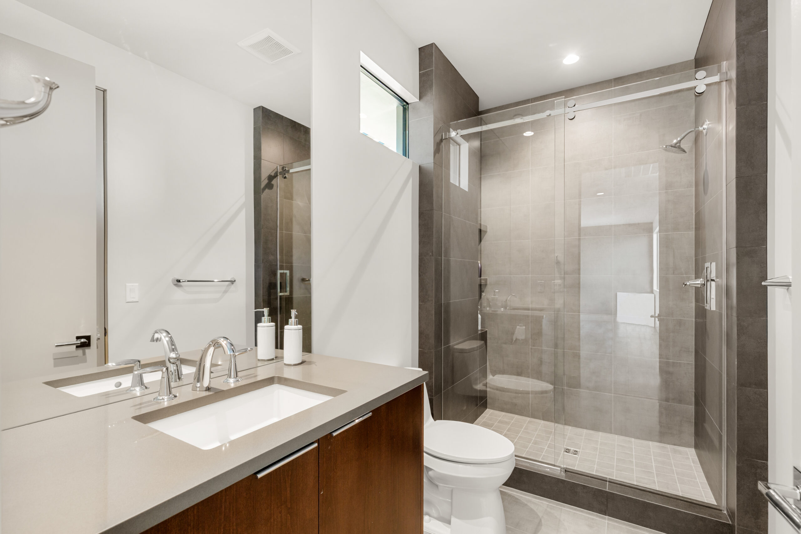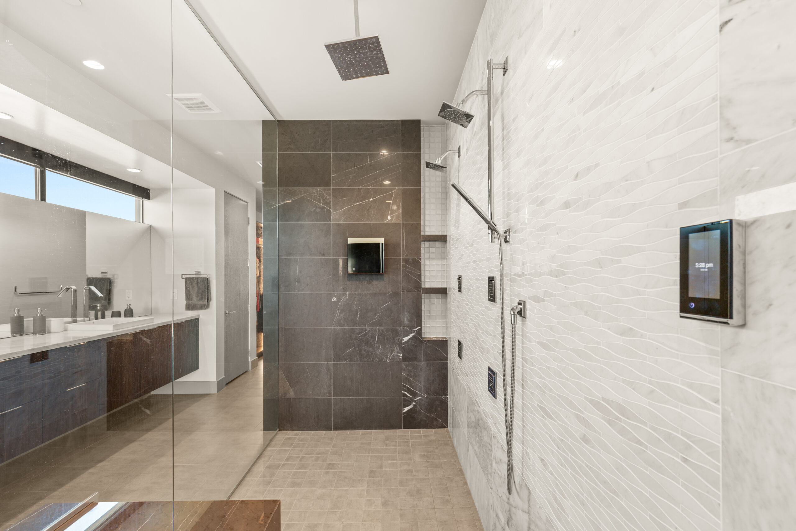 The main-level suite opens to a private patio with a fire feature, creating a personal haven of calm. Inside, a spa-inspired bath with dual vanities, body jets, and elegant finishes offers unmatched luxury and relaxation.