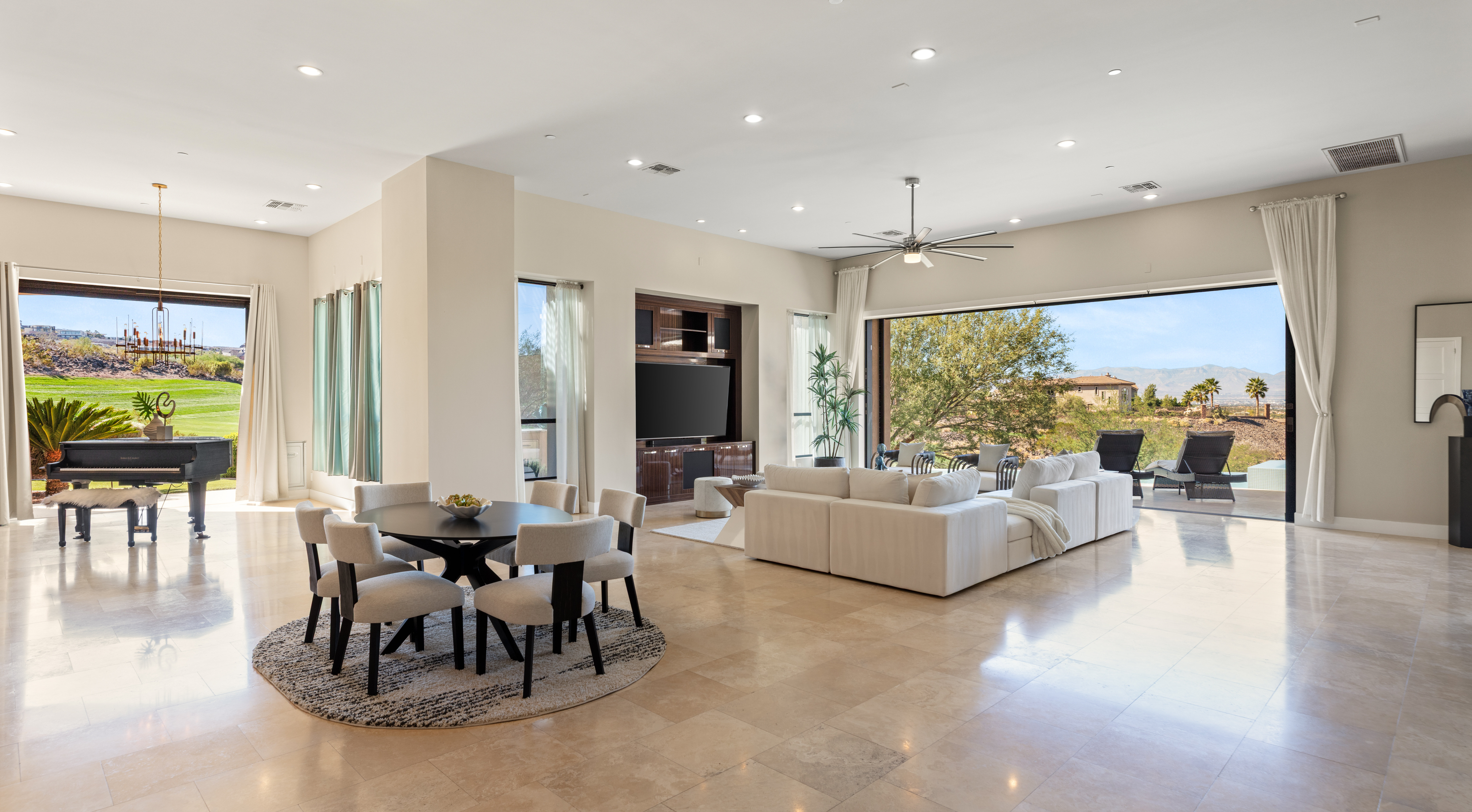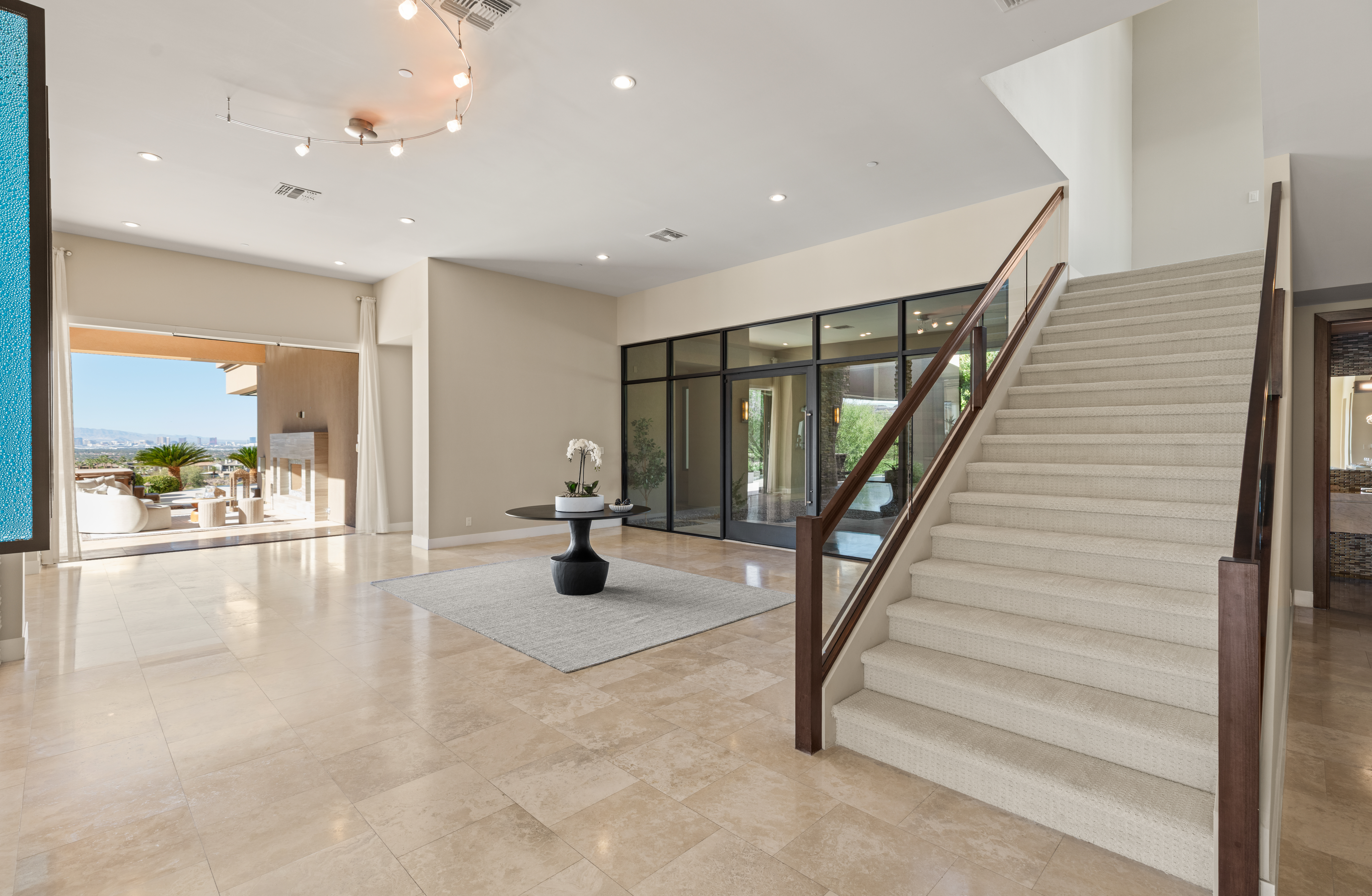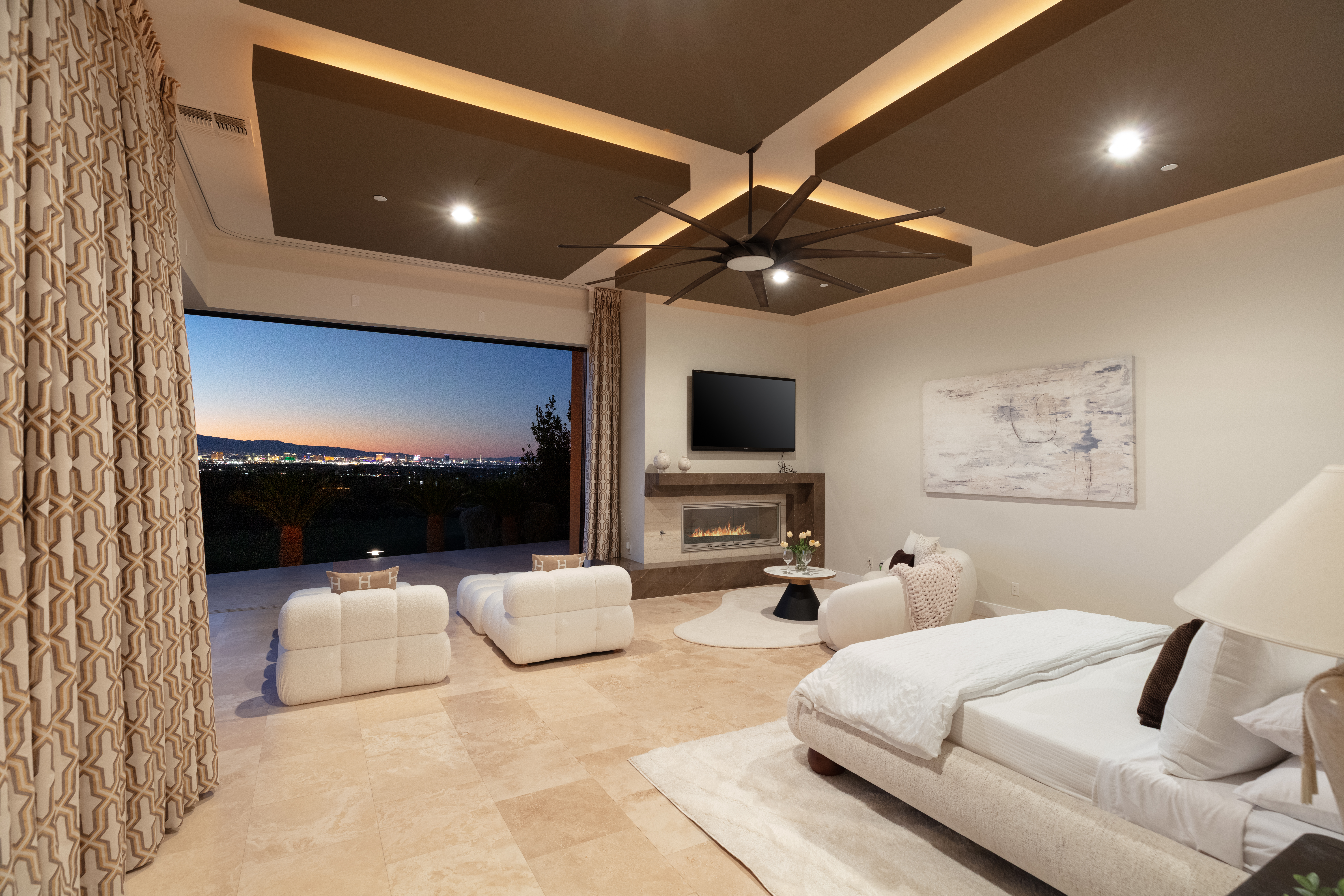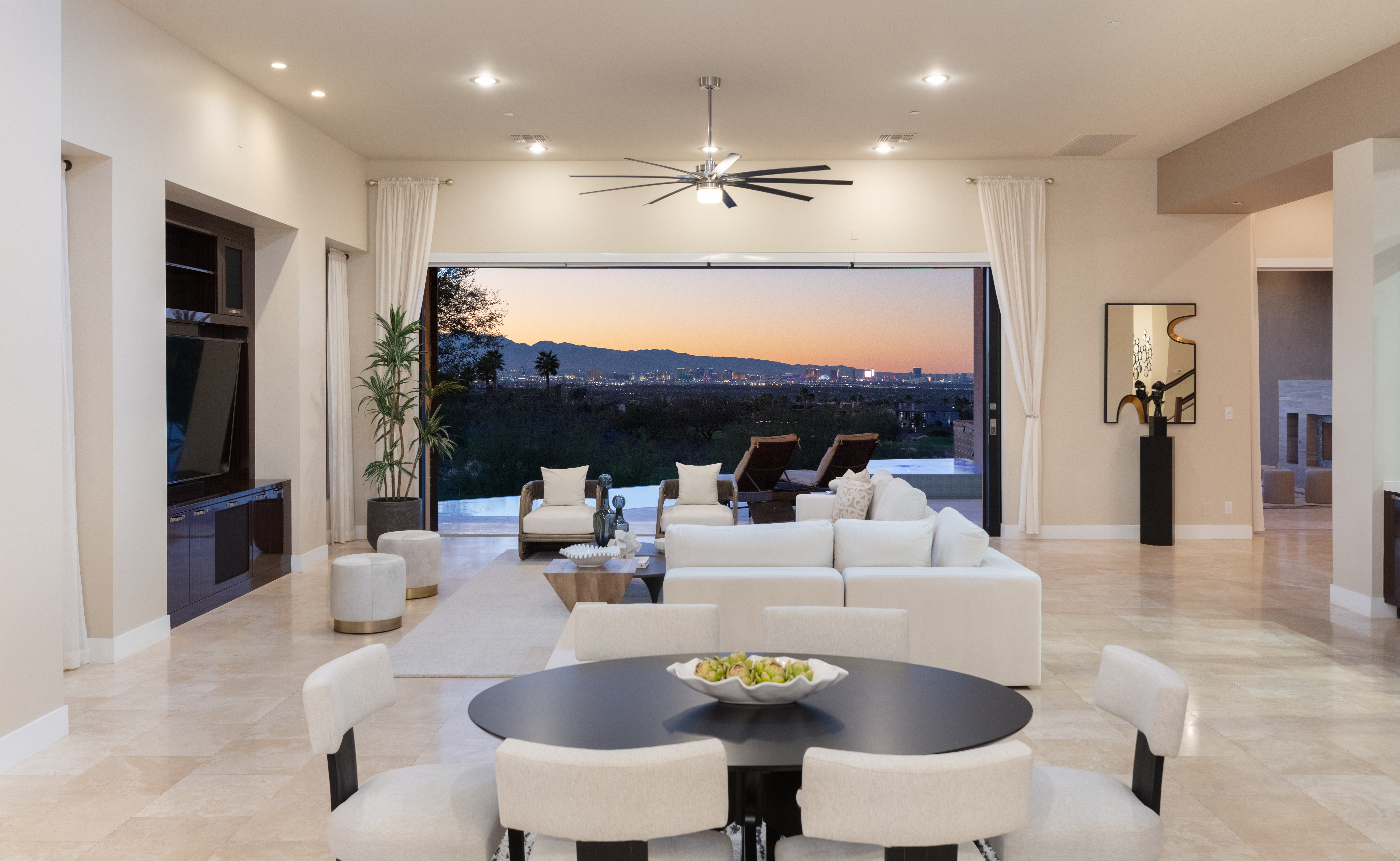 Expansive living unfolds across 9,614 square feet, with walls of glass that disappear to reveal sweeping Strip and mountain views. The great room flows effortlessly into the dining area and chef’s kitchen, while high ceilings, clean lines, and warm finishes balance modern design with livable elegance.
