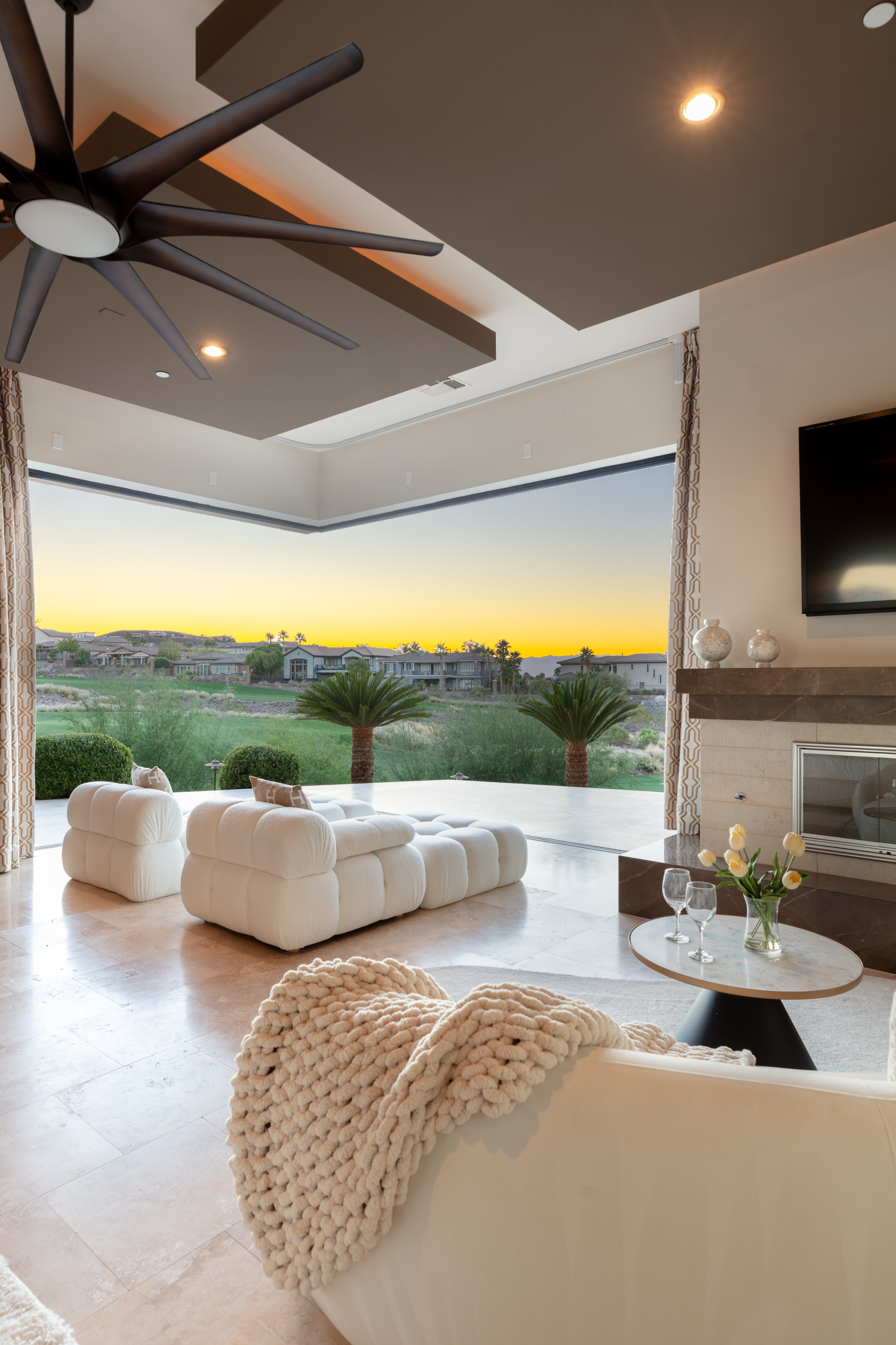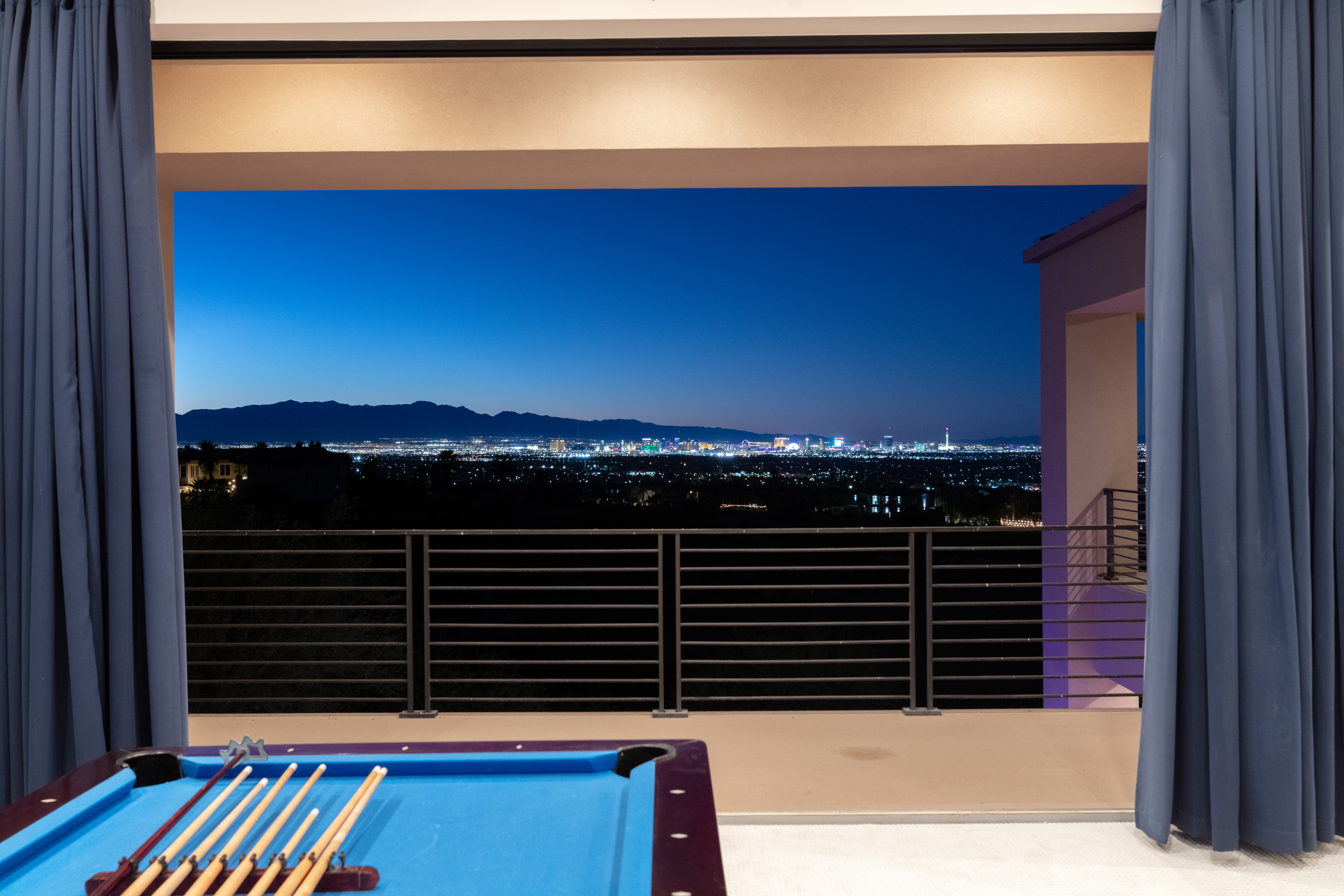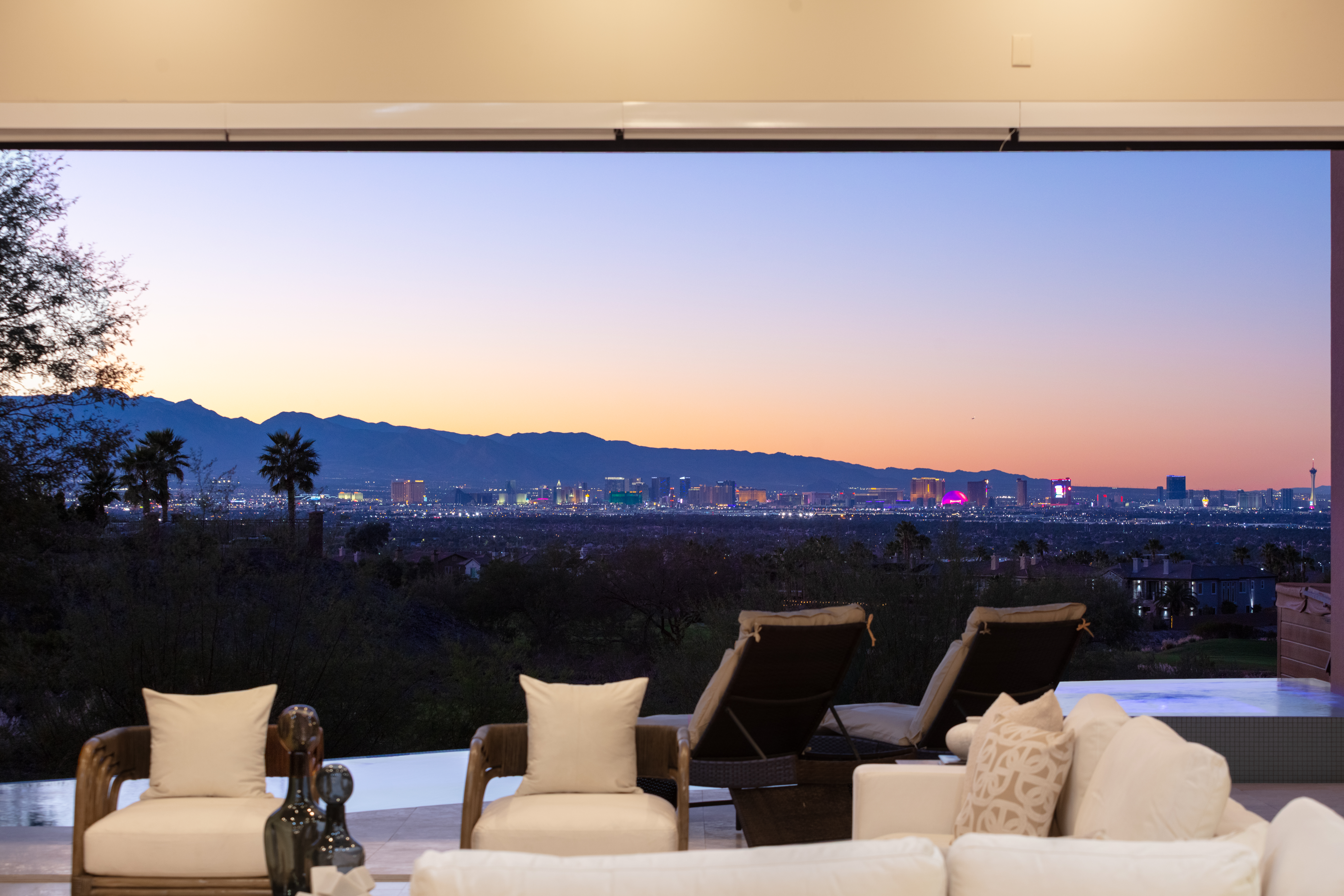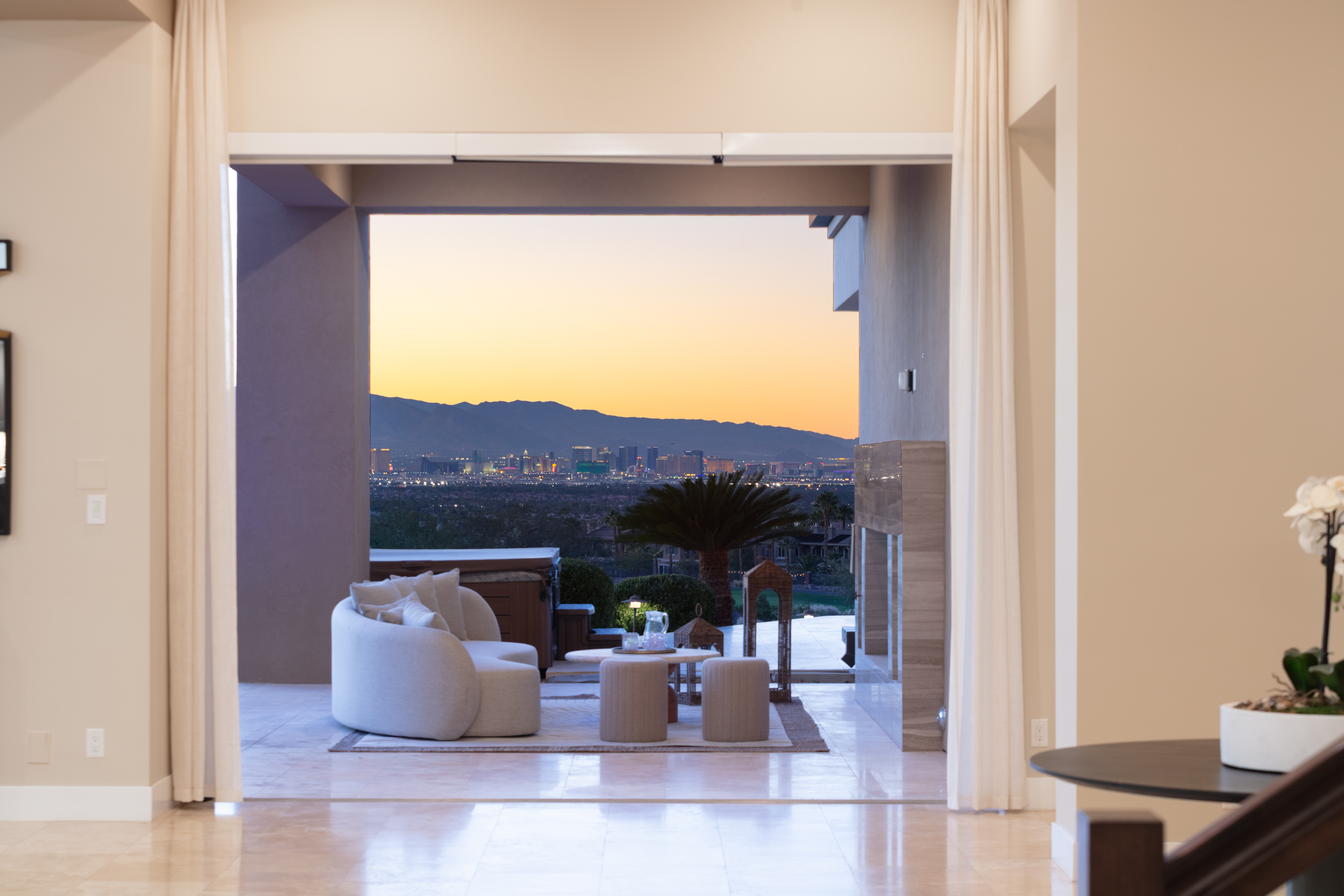 Expansive living unfolds across 9,614 square feet, with walls of glass that disappear to reveal sweeping Strip and mountain views. The great room flows effortlessly into the dining area and chef’s kitchen, while high ceilings, clean lines, and warm finishes balance modern design with livable elegance.