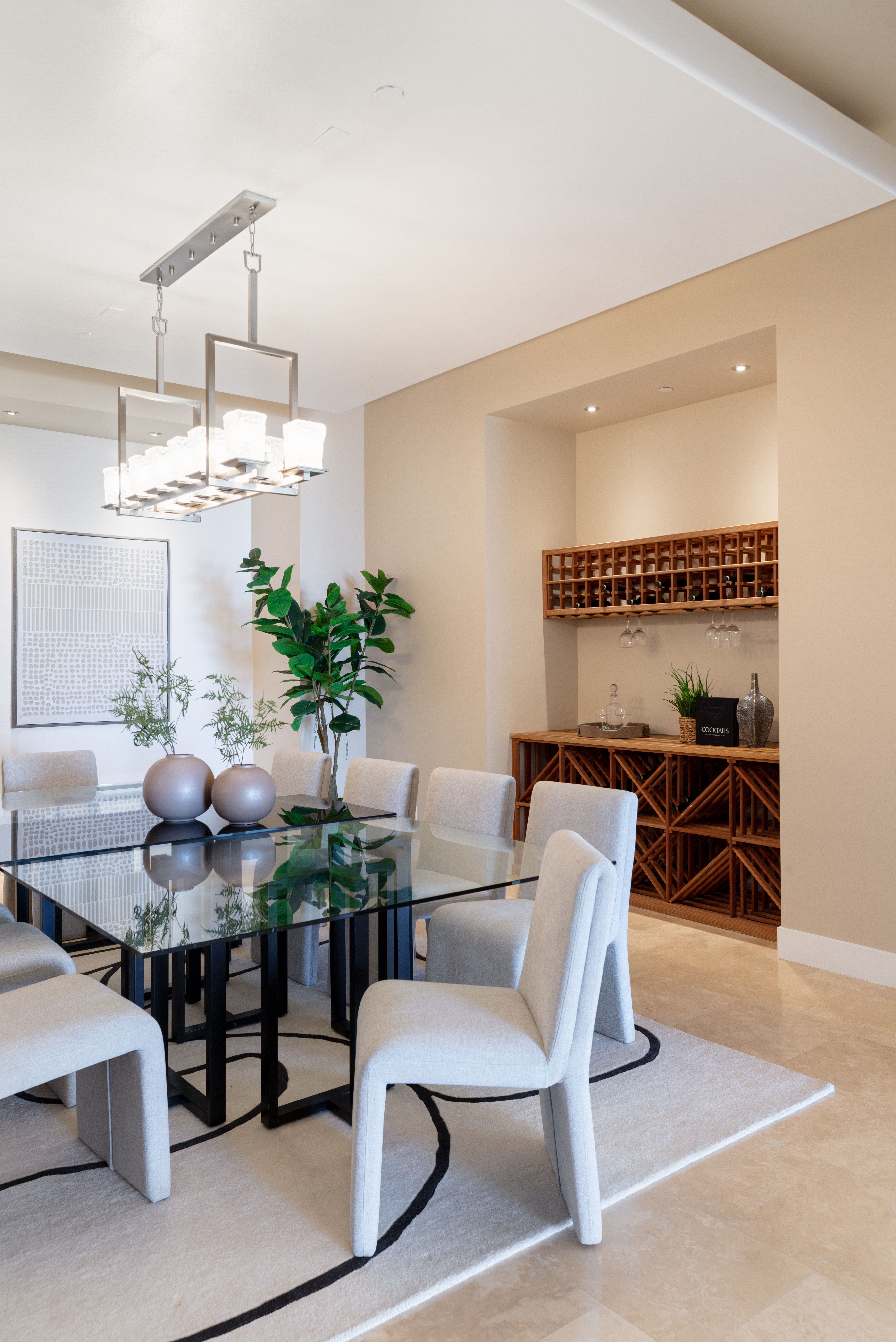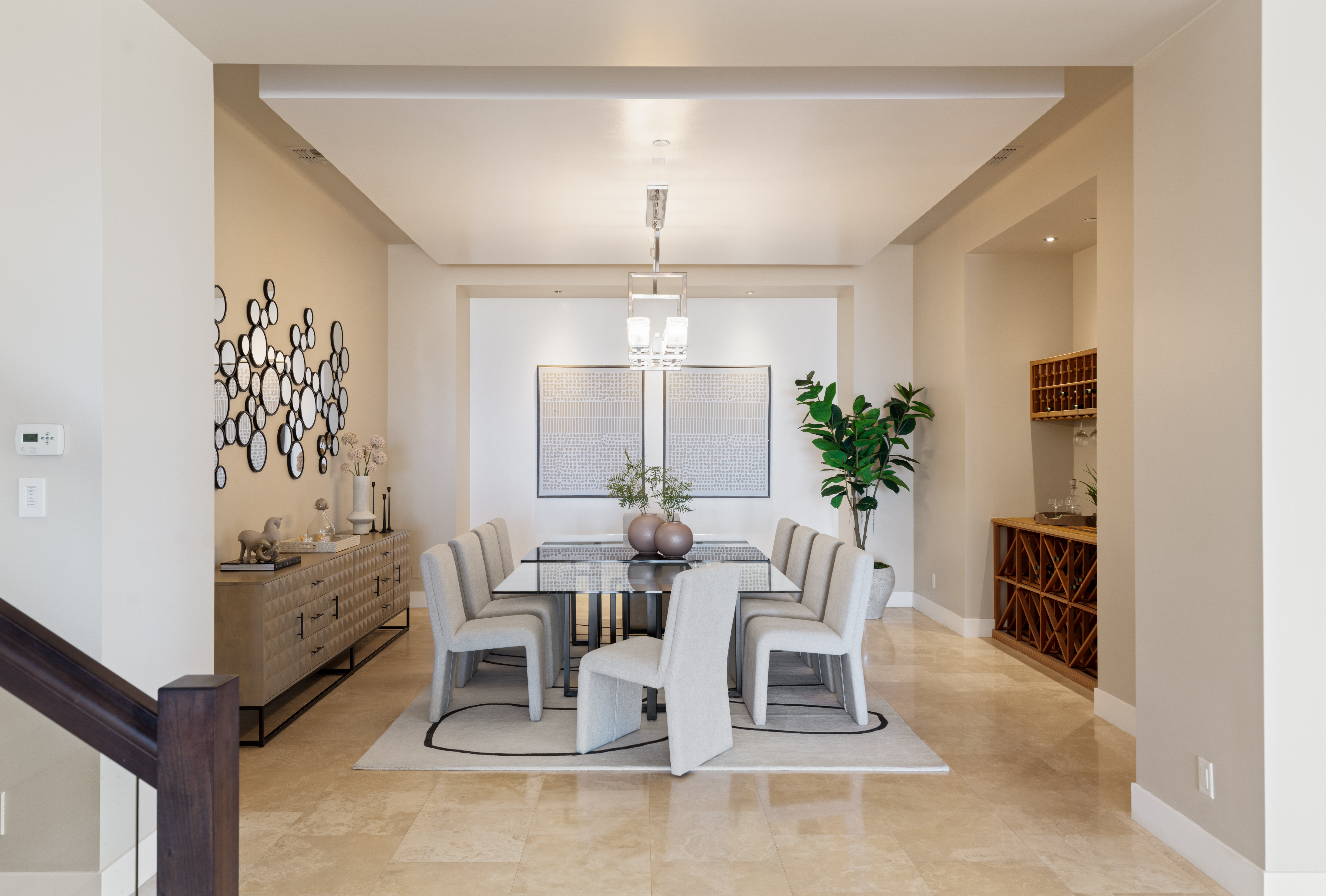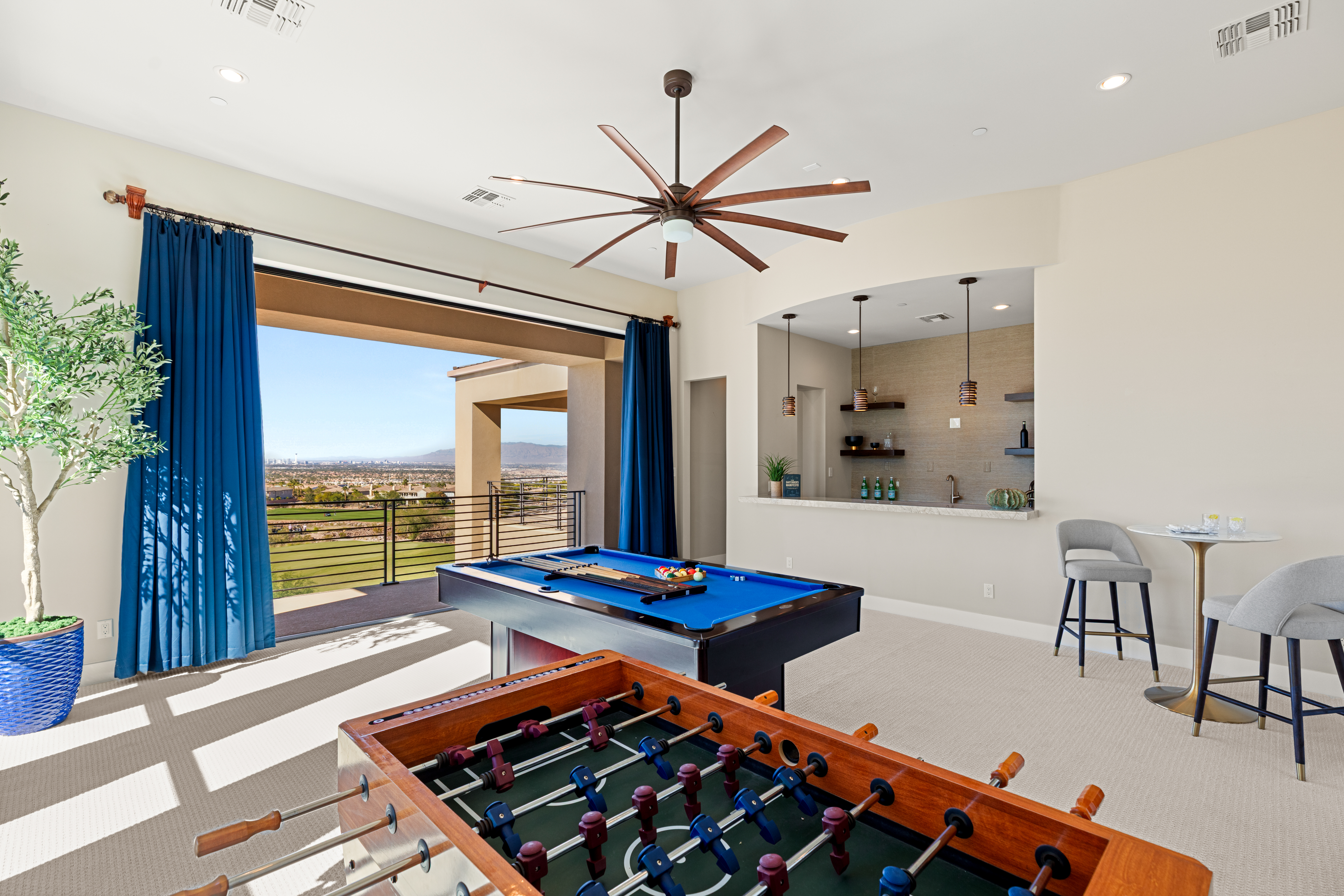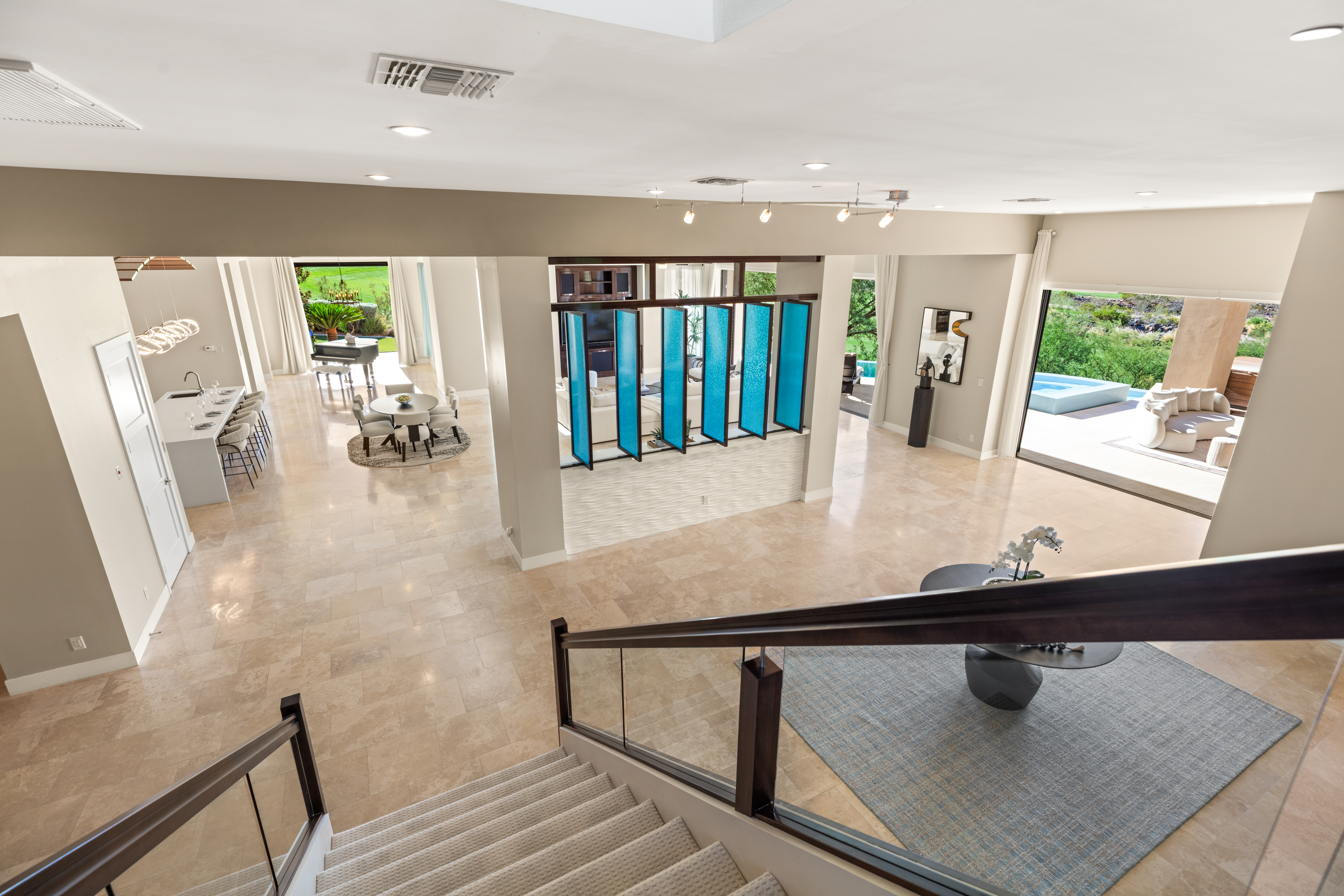 Expansive living unfolds across 9,614 square feet, with walls of glass that disappear to reveal sweeping Strip and mountain views. The great room flows effortlessly into the dining area and chef’s kitchen, while high ceilings, clean lines, and warm finishes balance modern design with livable elegance.