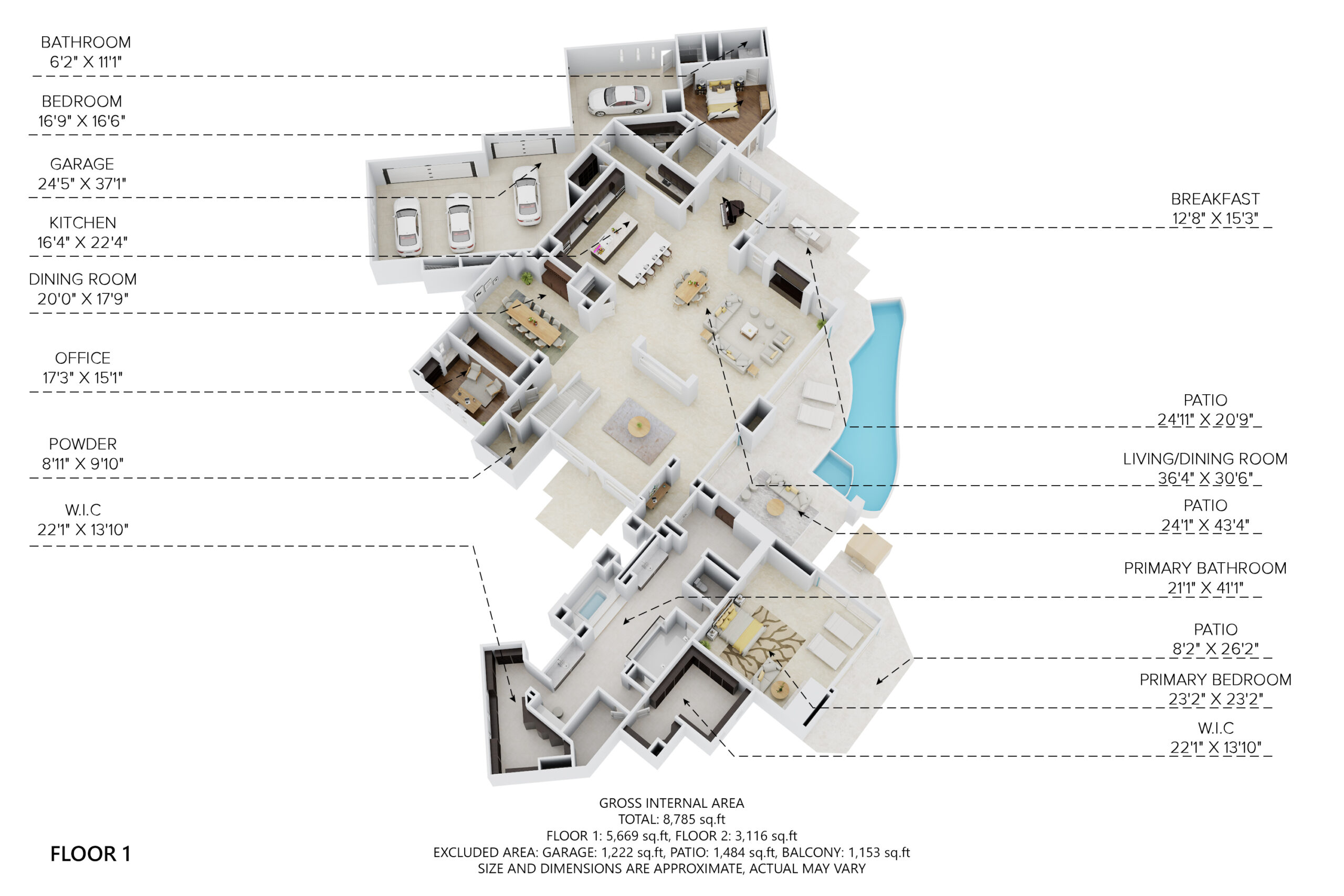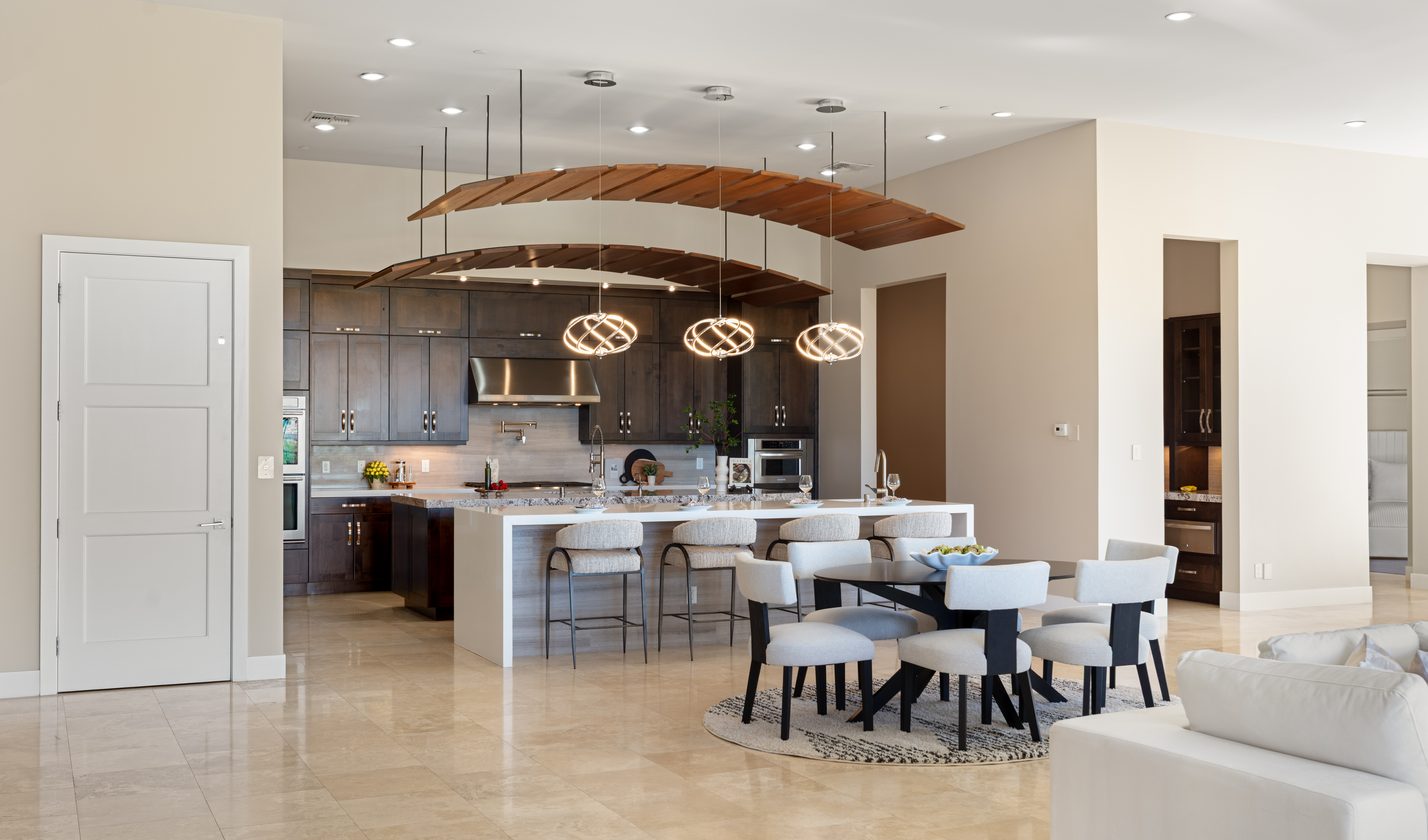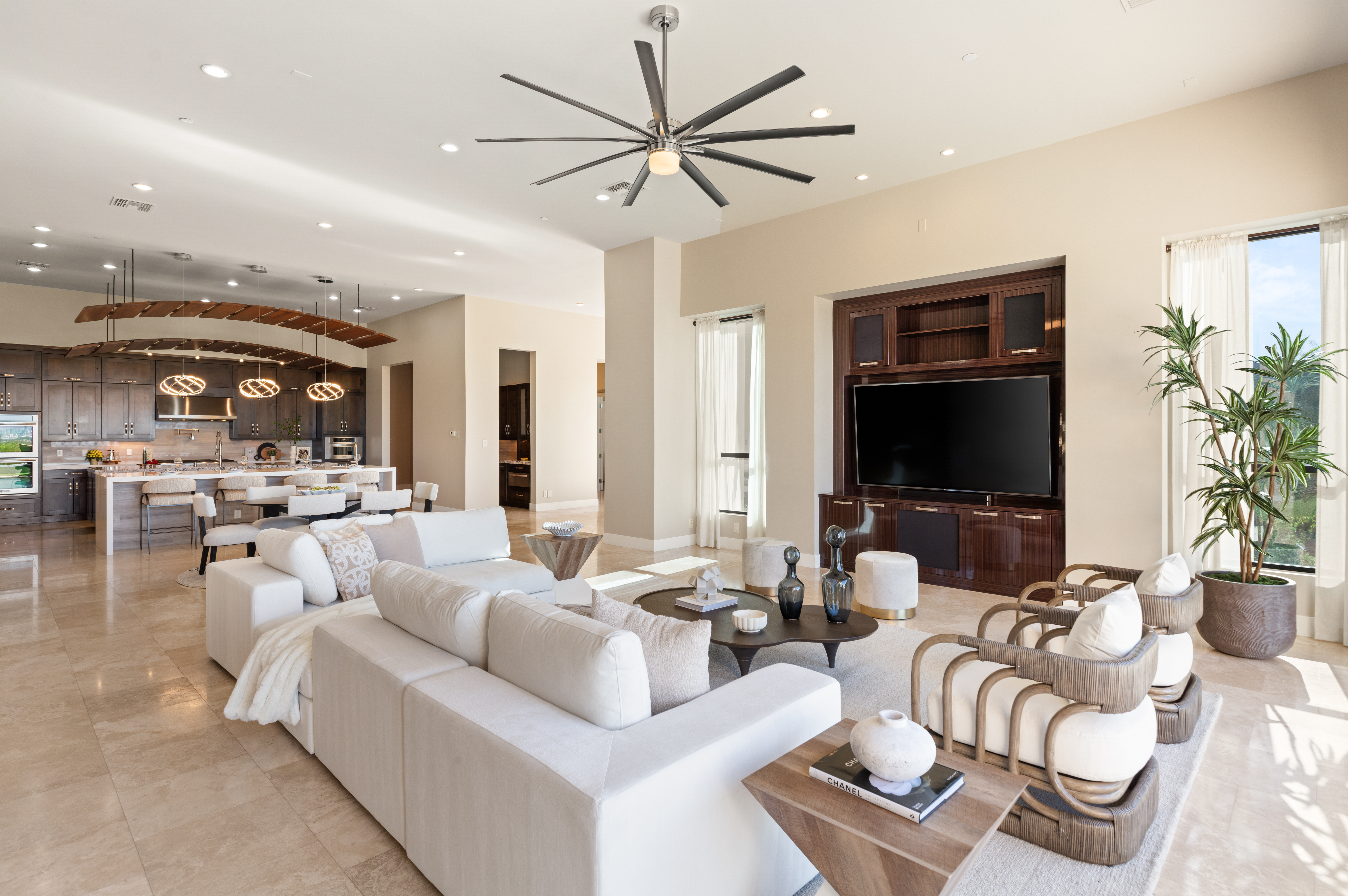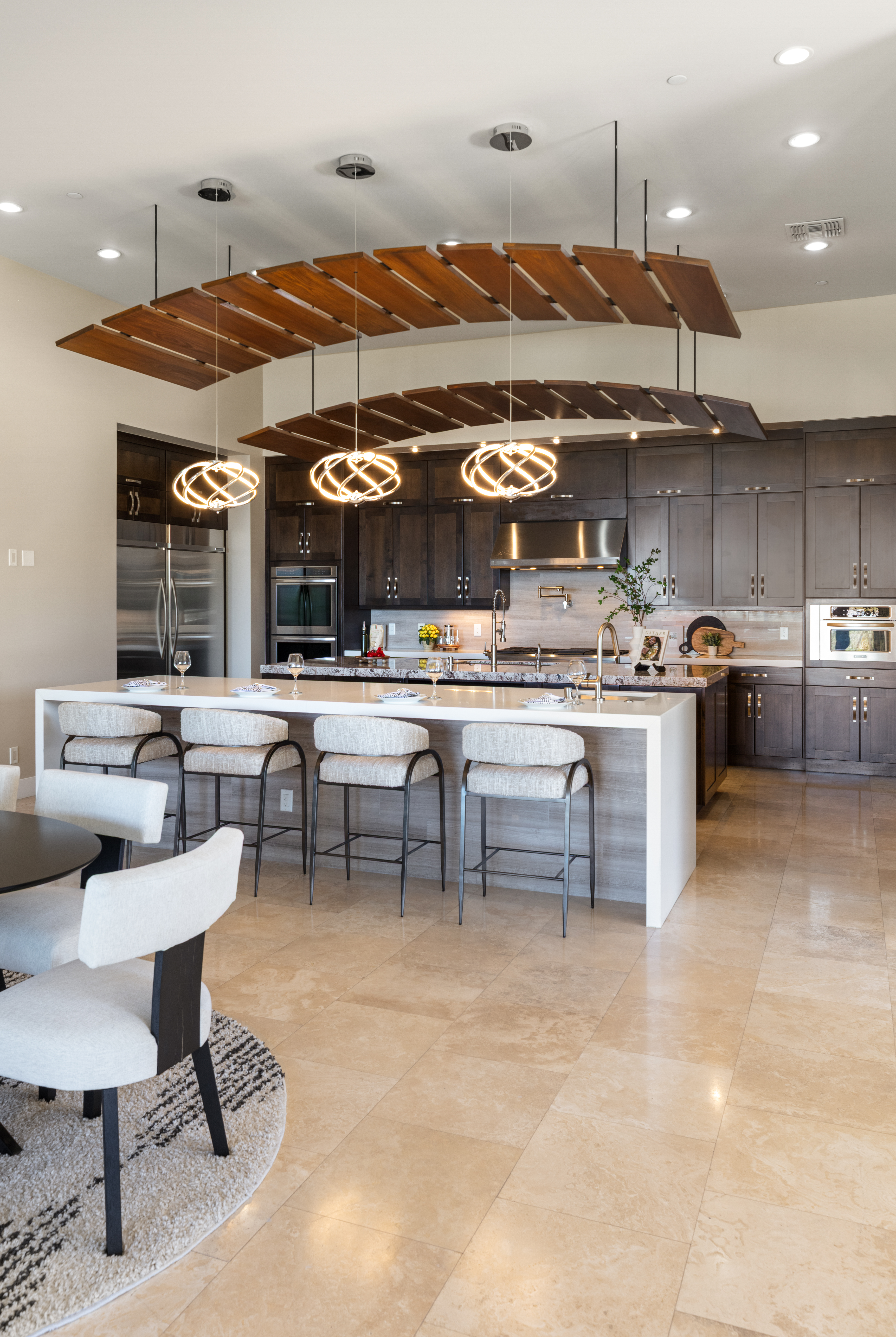 Expansive living unfolds across 9,614 square feet, with walls of glass that disappear to reveal sweeping Strip and mountain views. The great room flows effortlessly into the dining area and chef’s kitchen, while high ceilings, clean lines, and warm finishes balance modern design with livable elegance.