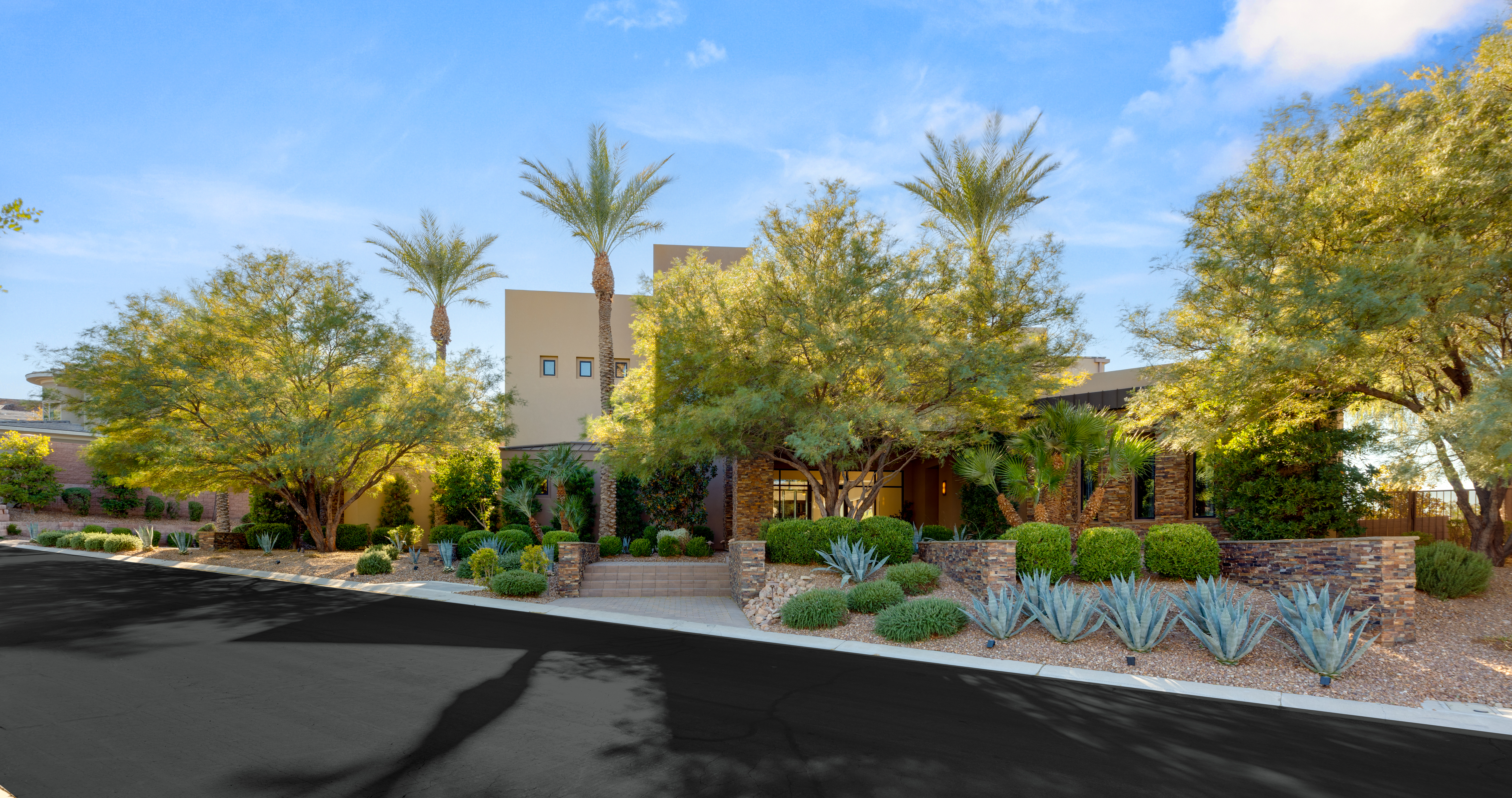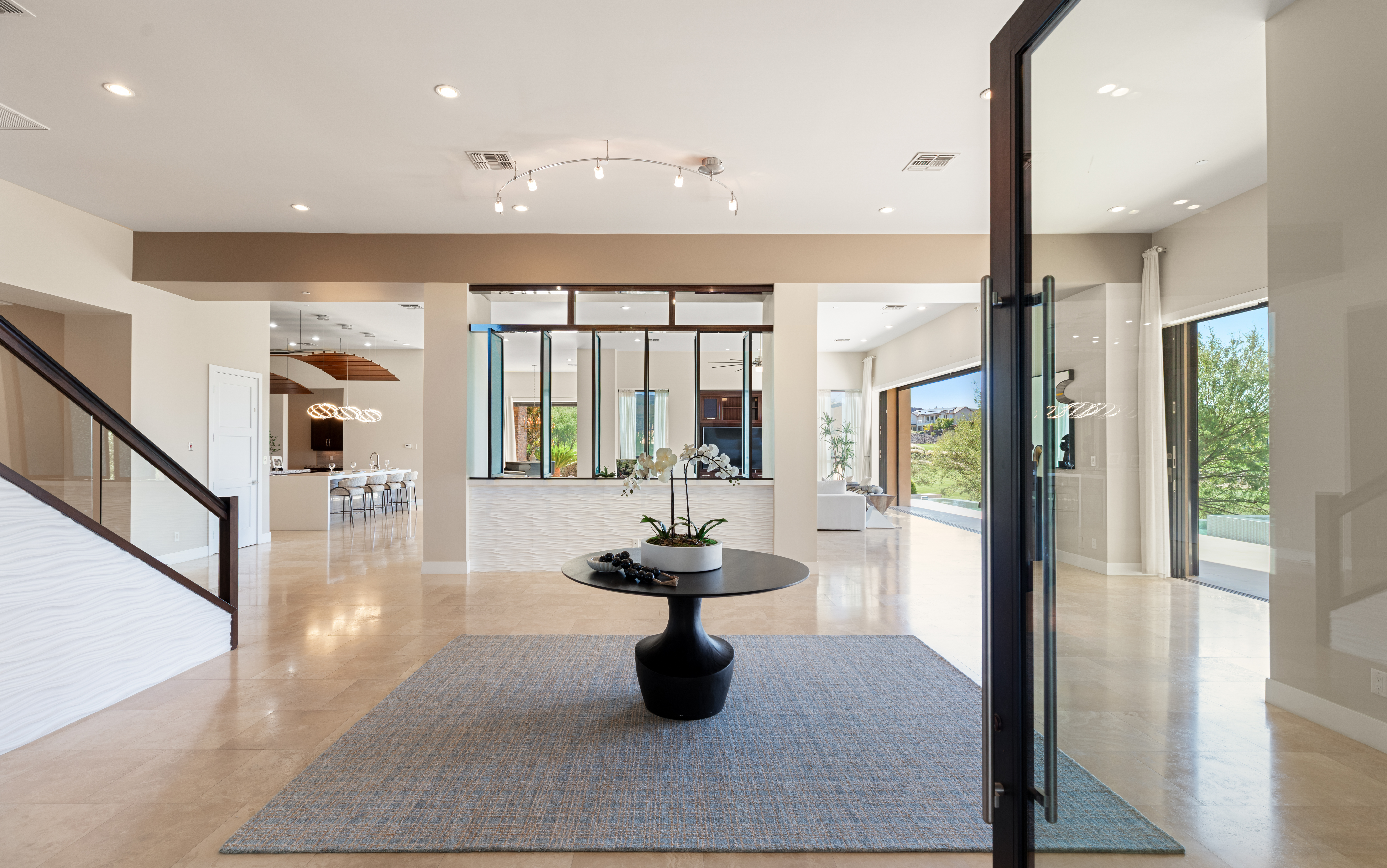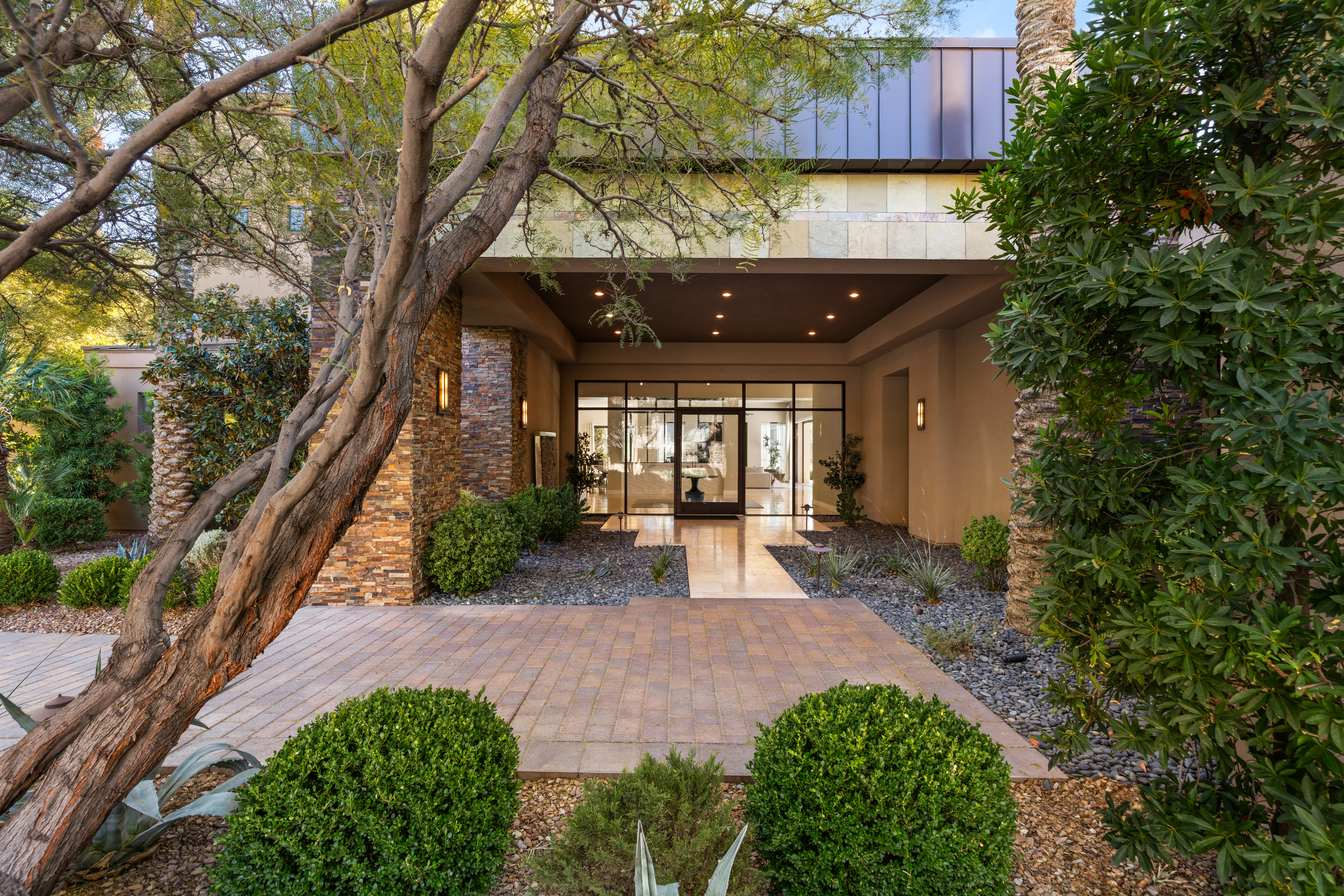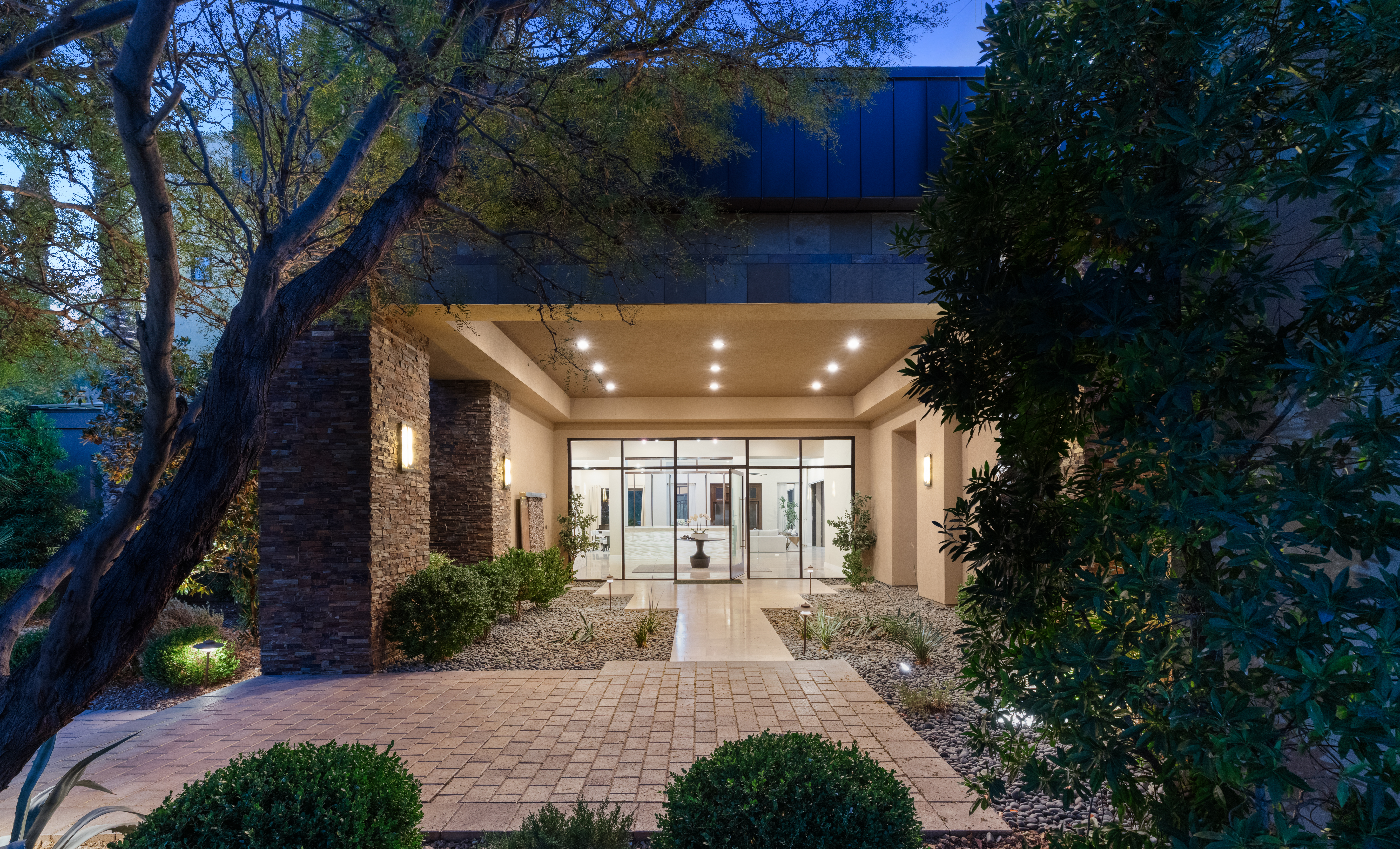 A striking contemporary entry framed by native greenery welcomes you into this custom estate perched above the Dragon Ridge Golf Course. Glass, stone, and light converge to create a sense of arrival—where architectural detail and nature coexist in harmony.