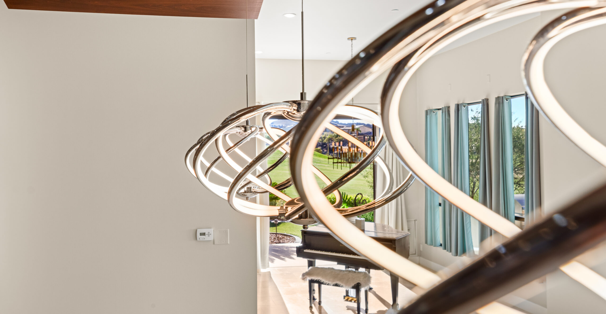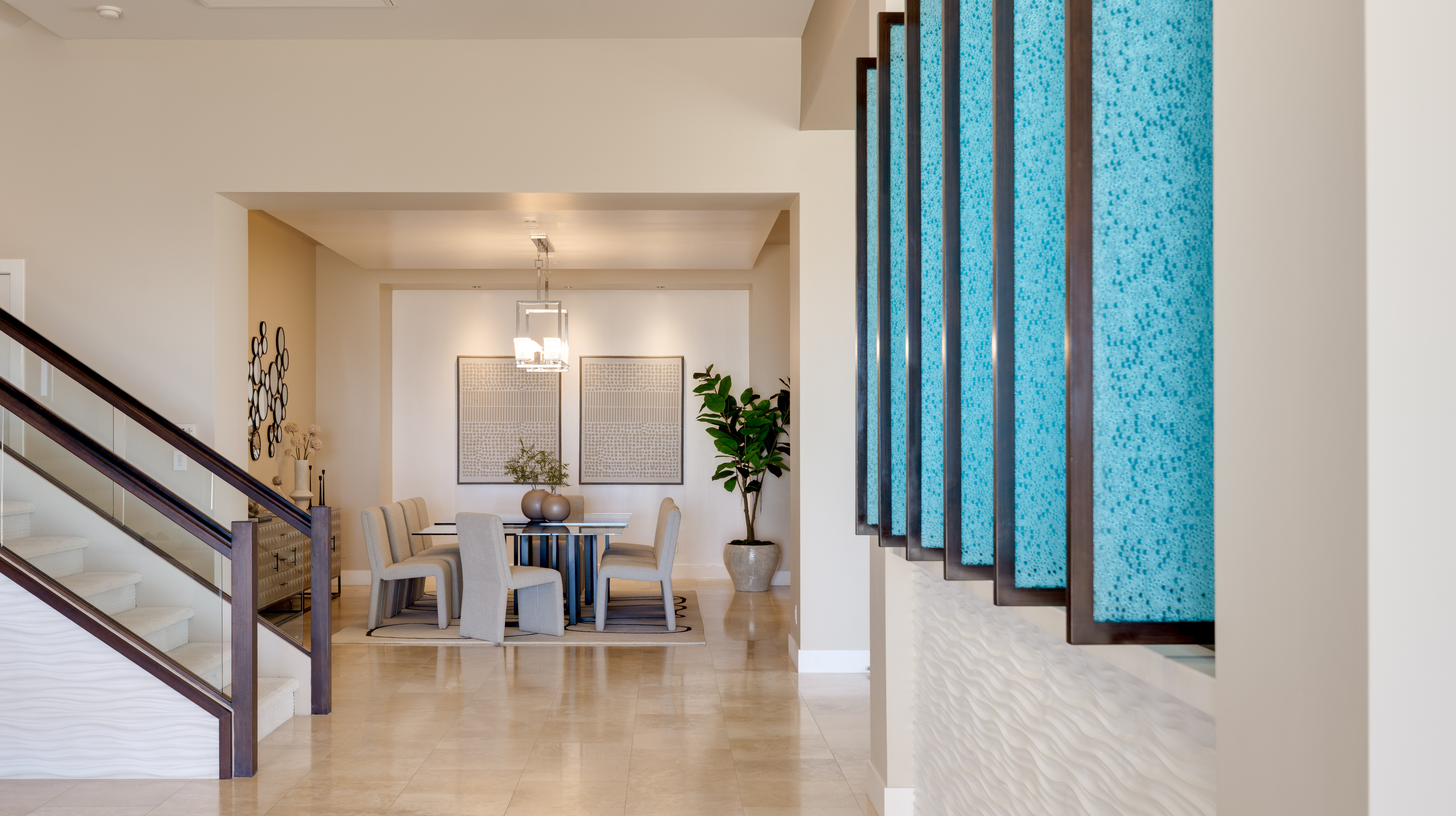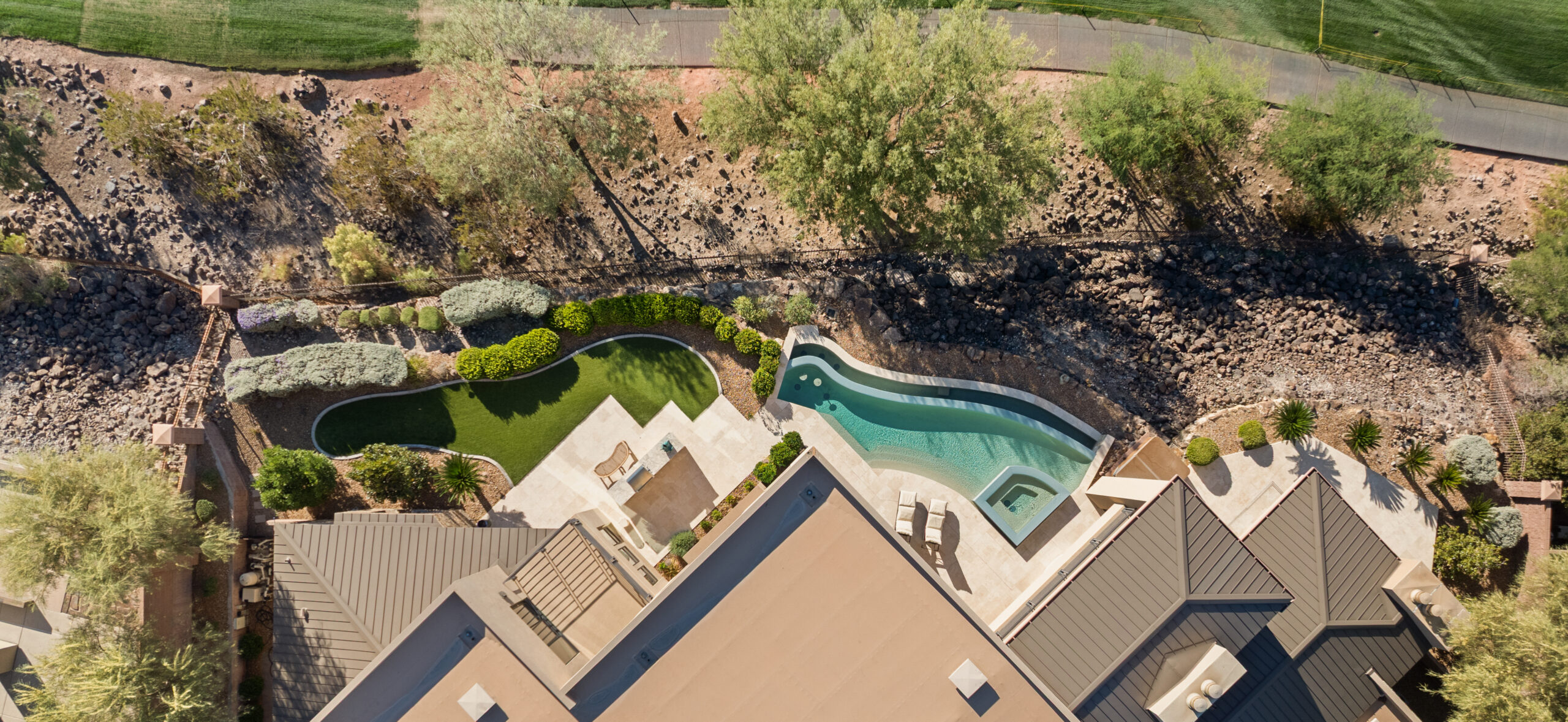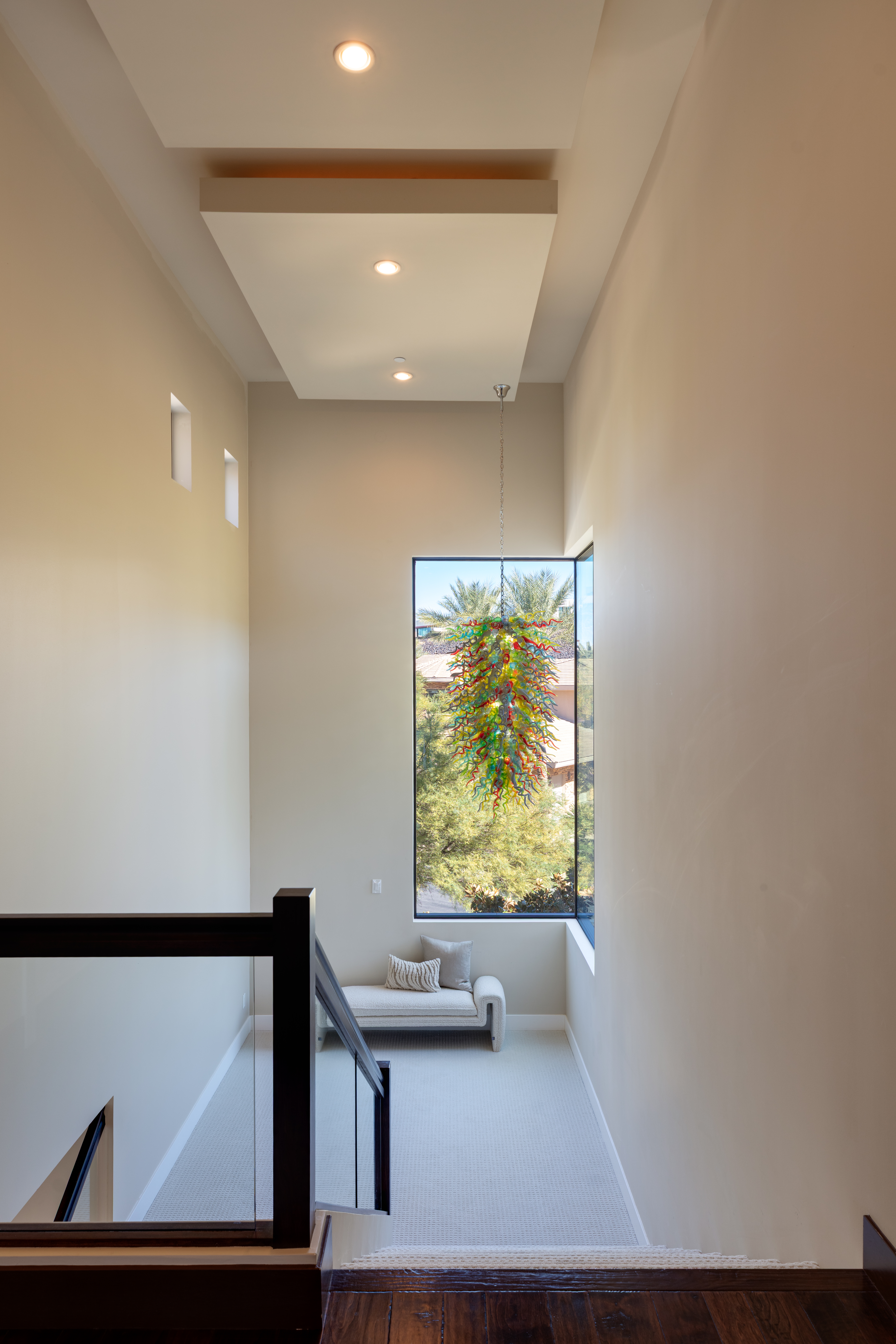 A striking contemporary entry framed by native greenery welcomes you into this custom estate perched above the Dragon Ridge Golf Course. Glass, stone, and light converge to create a sense of arrival—where architectural detail and nature coexist in harmony.