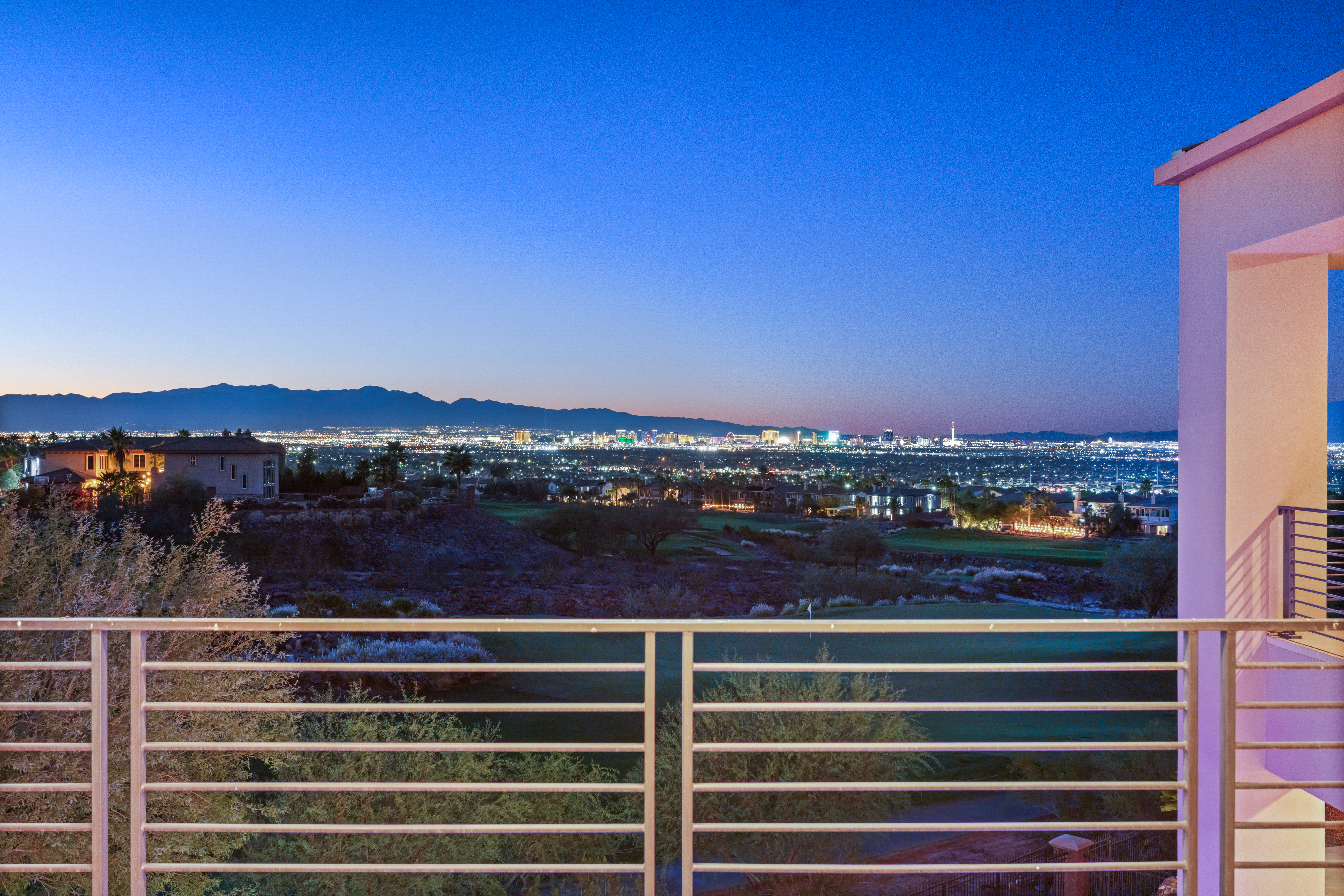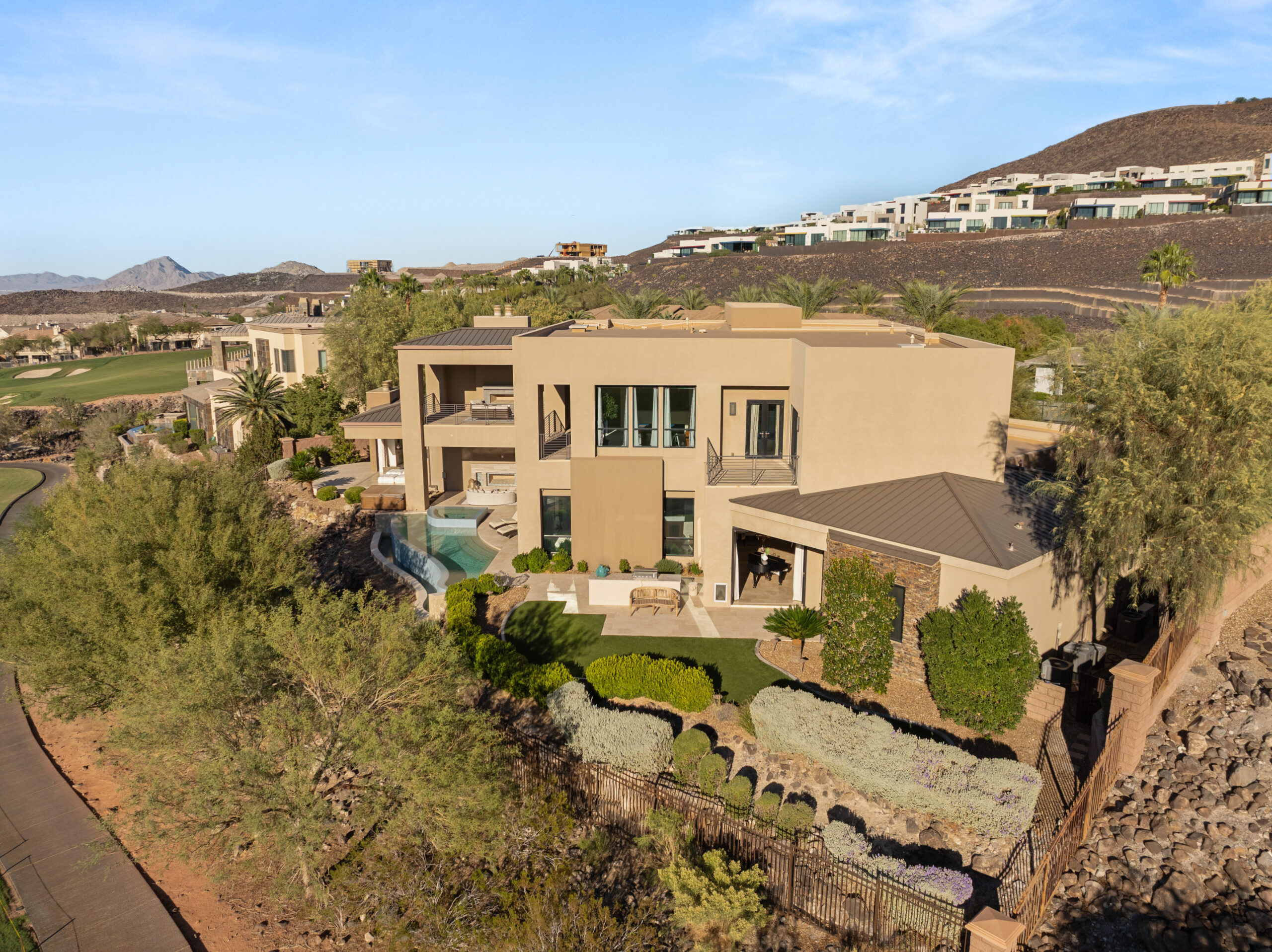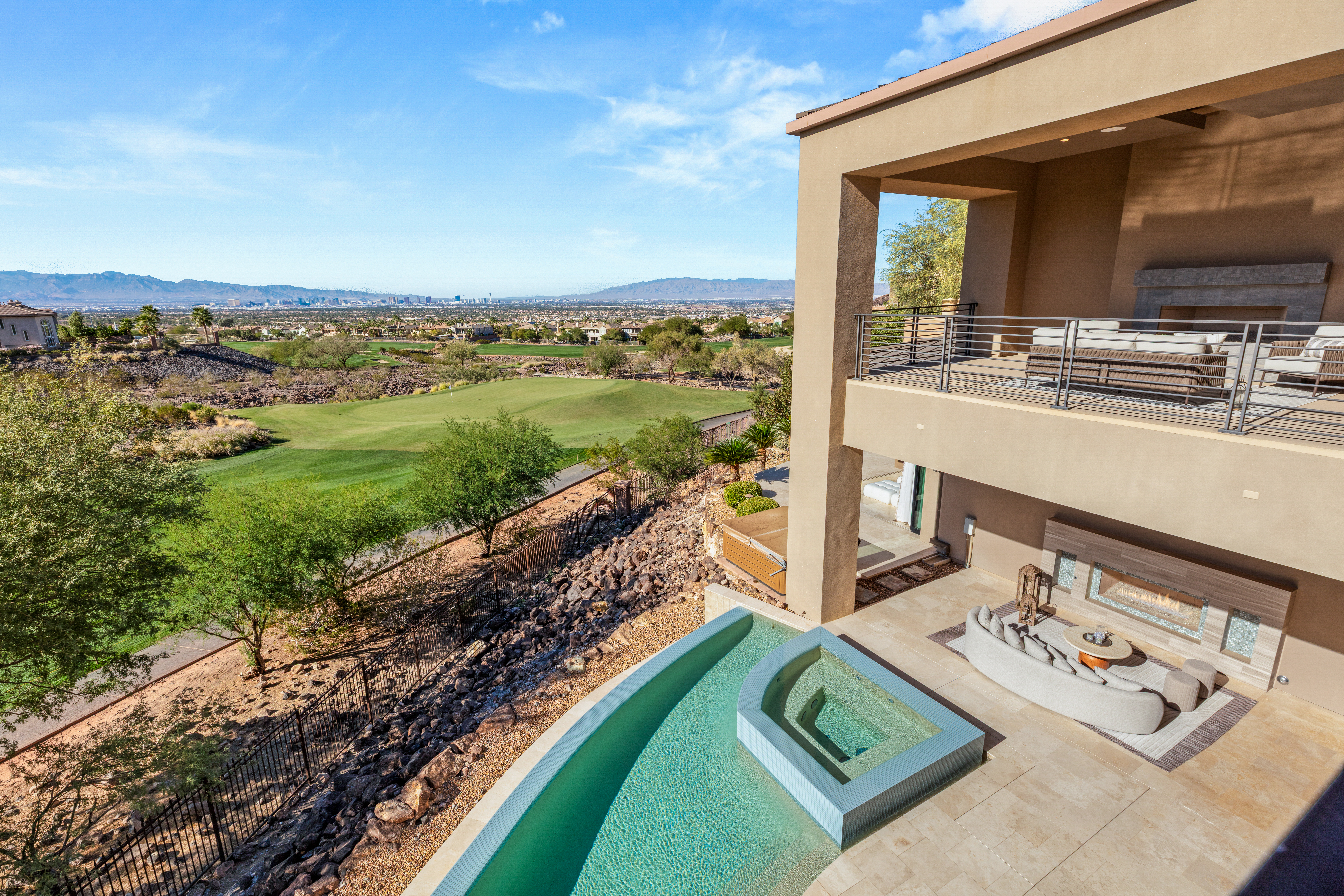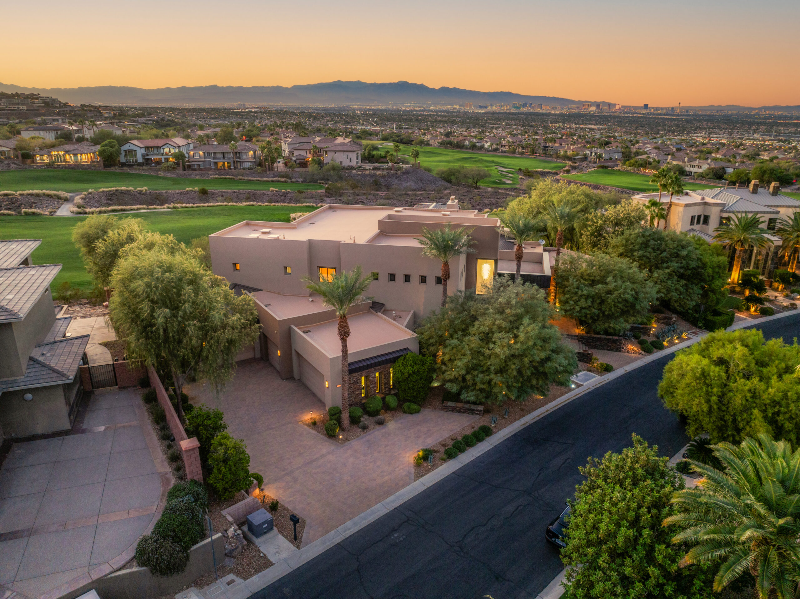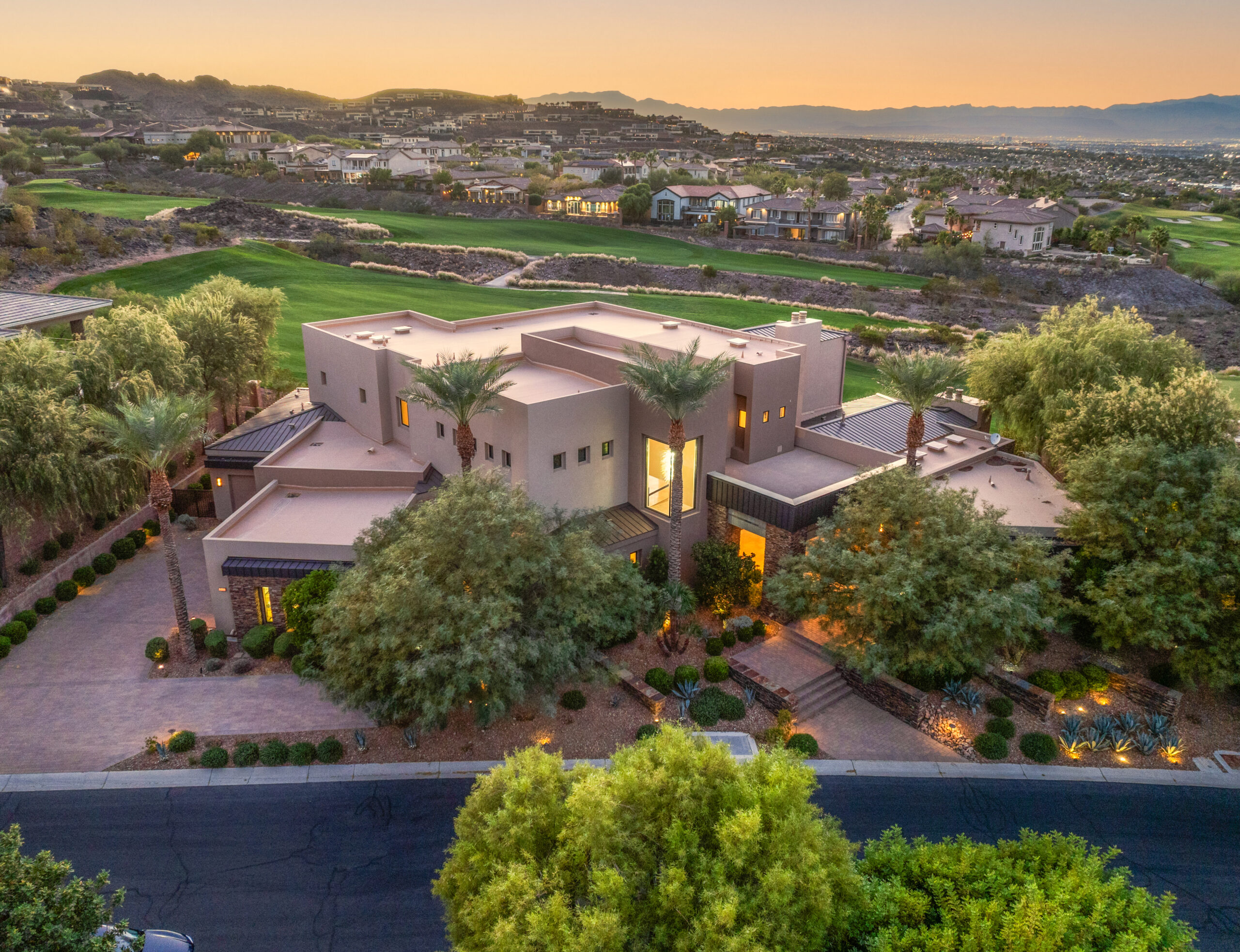 Perched above the valley within the prestigious guard-gated community of MacDonald Highlands, 583 Saint Croix Street is a 9,614-square-foot contemporary estate that captures sweeping views of the Las Vegas Strip, Dragon Ridge Golf Course, and Red Rock Mountains. Set on over half an acre, this custom home blends modern elegance with warmth and light, featuring five bedrooms including two primary suites, seven bathrooms, a private office, theater, game room, formal dining, chef’s kitchen with butler’s pantry, three fireplaces, elevator, and a four-car garage with new epoxy flooring. Fleetwood glass doors open to an outdoor sanctuary with a zero-edge pool, spa, fireplace, BBQ island, and putting green—an entertainer’s dream beneath Nevada skies. Upstairs, a rooftop and wraparound balcony with fireplace frame the city in every direction, offering a front-row view of the desert’s most dazzling horizon where luxury meets light.