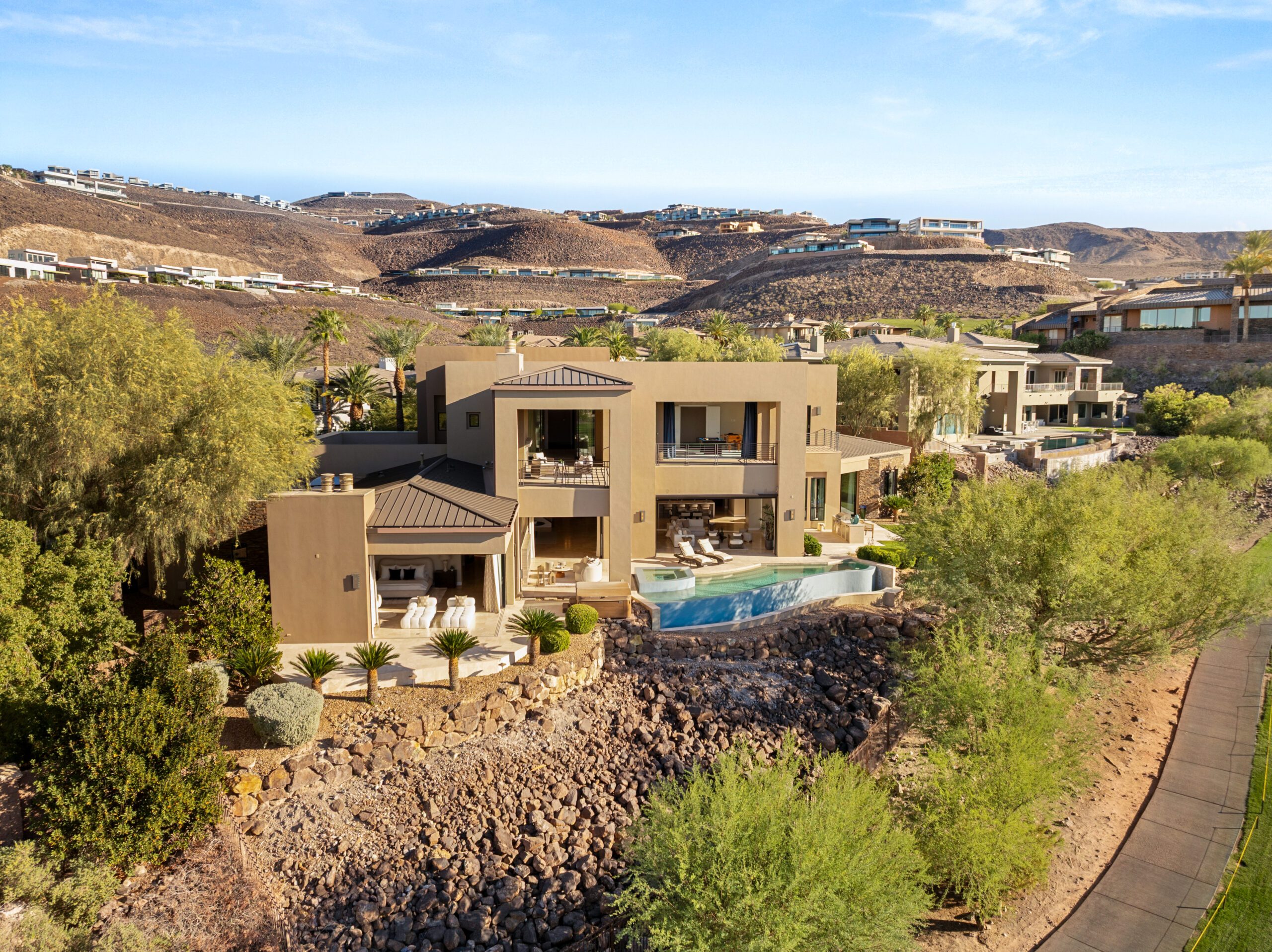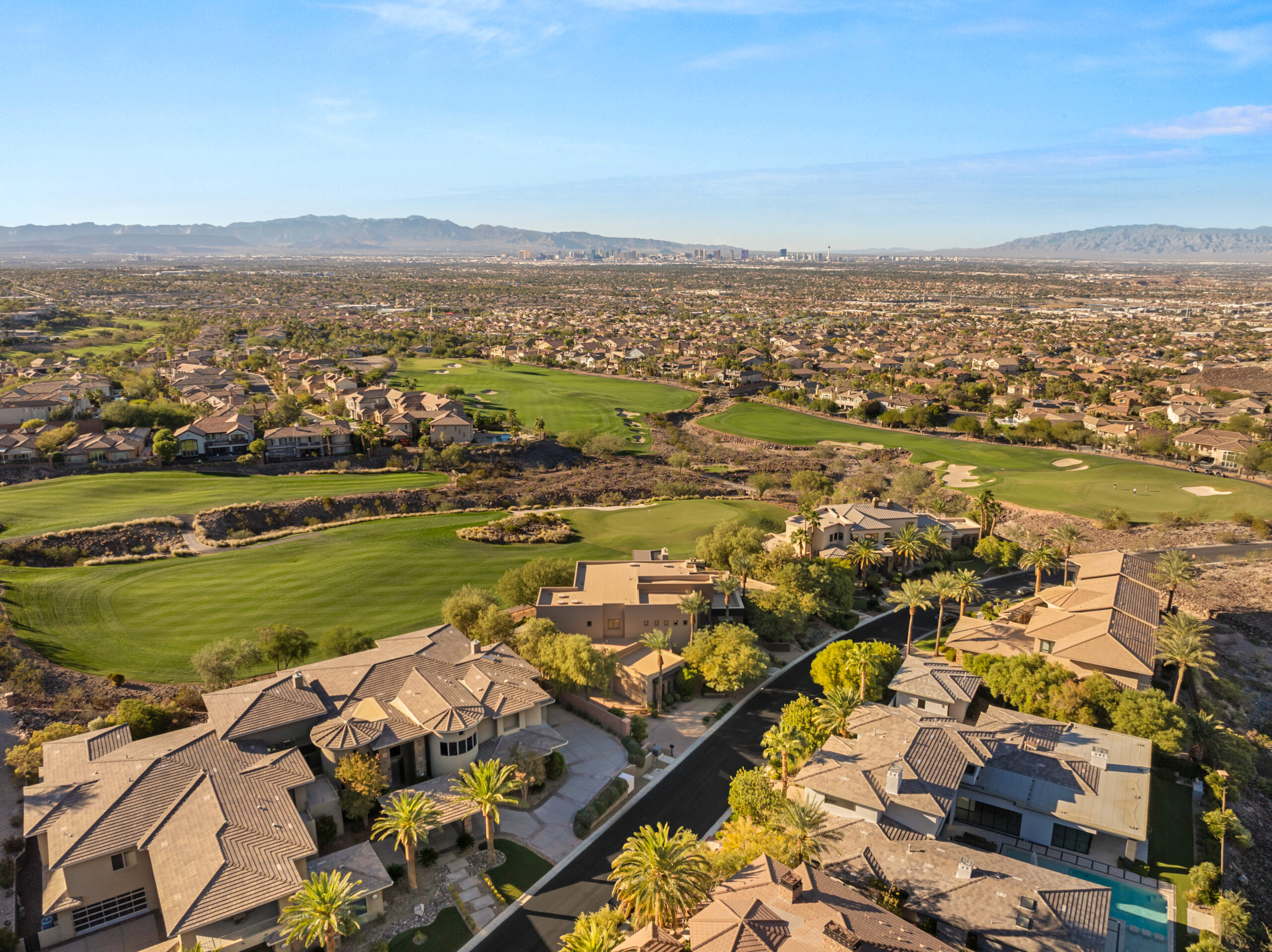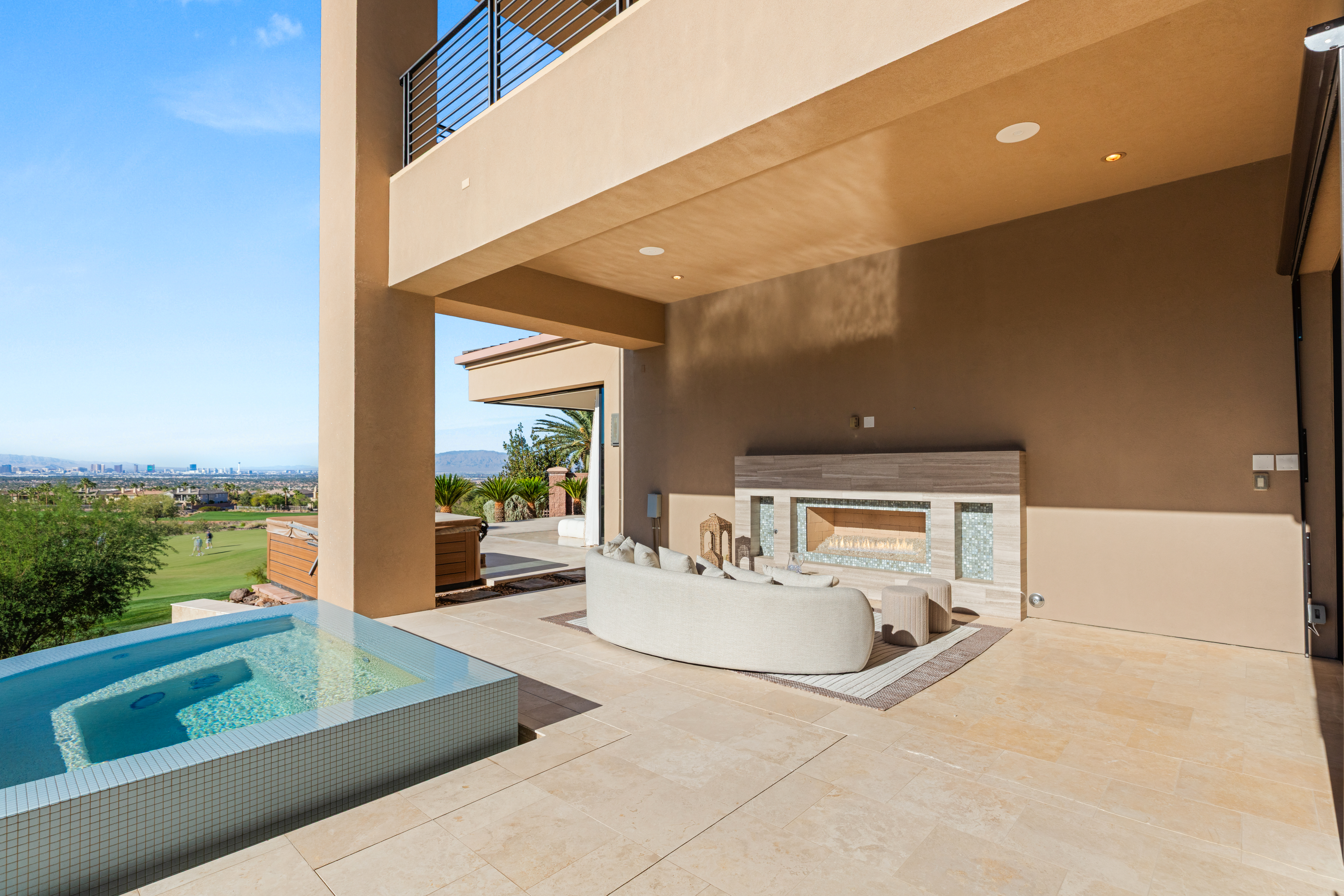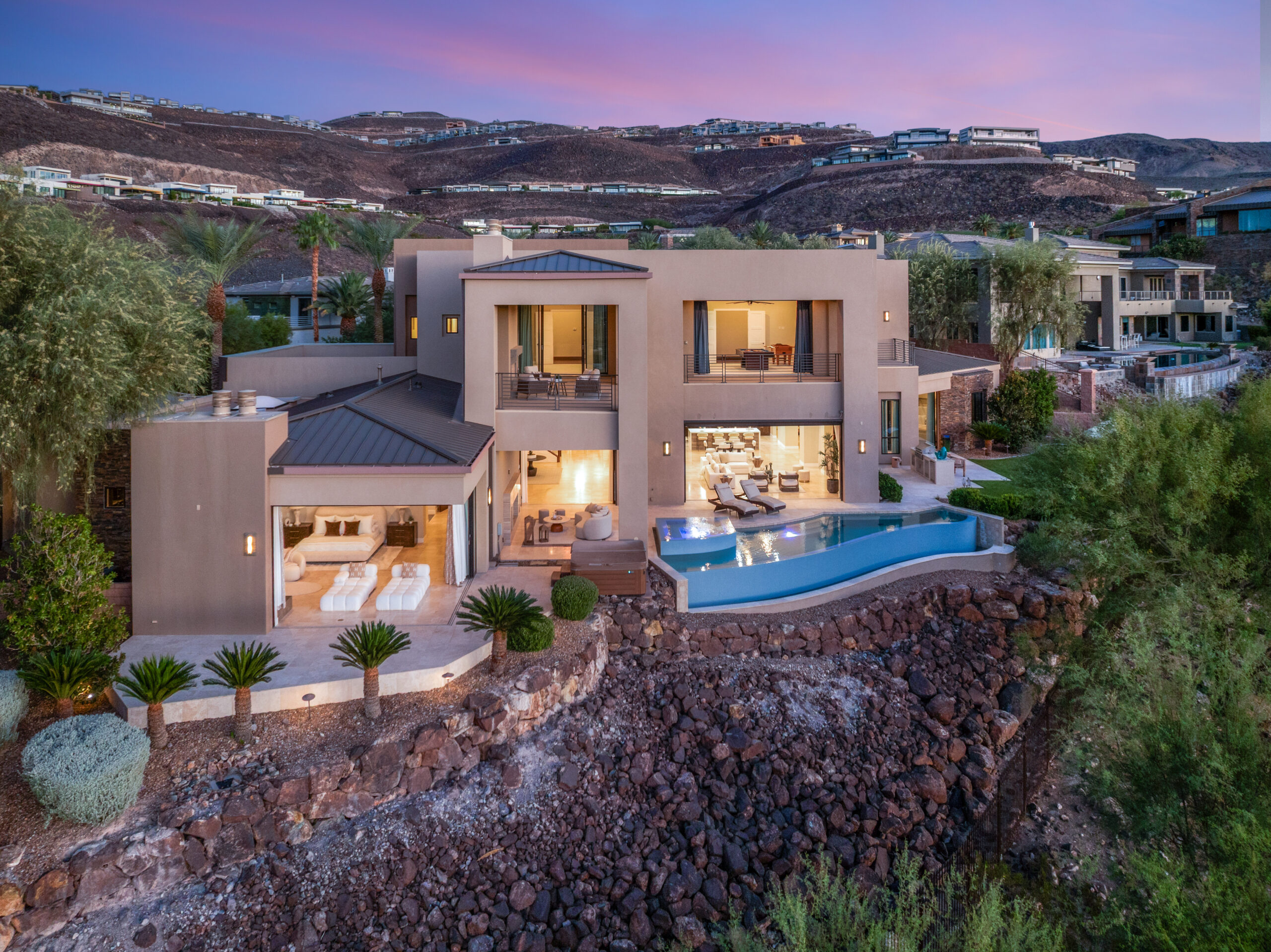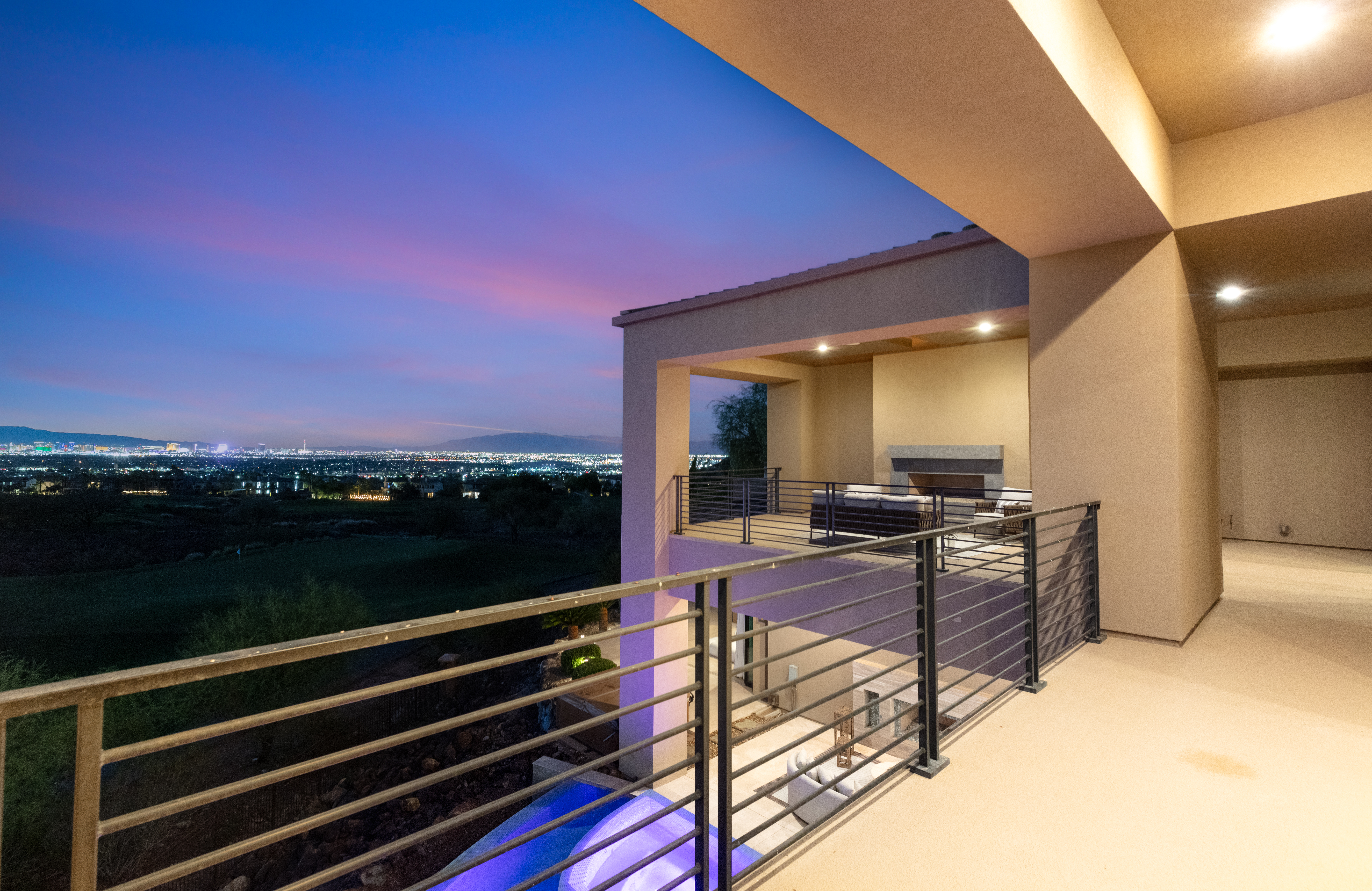 Perched above the valley within the prestigious guard-gated community of MacDonald Highlands, 583 Saint Croix Street is a 9,614-square-foot contemporary estate that captures sweeping views of the Las Vegas Strip, Dragon Ridge Golf Course, and Red Rock Mountains. Set on over half an acre, this custom home blends modern elegance with warmth and light, featuring five bedrooms including two primary suites, seven bathrooms, a private office, theater, game room, formal dining, chef’s kitchen with butler’s pantry, three fireplaces, elevator, and a four-car garage with new epoxy flooring. Fleetwood glass doors open to an outdoor sanctuary with a zero-edge pool, spa, fireplace, BBQ island, and putting green—an entertainer’s dream beneath Nevada skies. Upstairs, a rooftop and wraparound balcony with fireplace frame the city in every direction, offering a front-row view of the desert’s most dazzling horizon where luxury meets light.