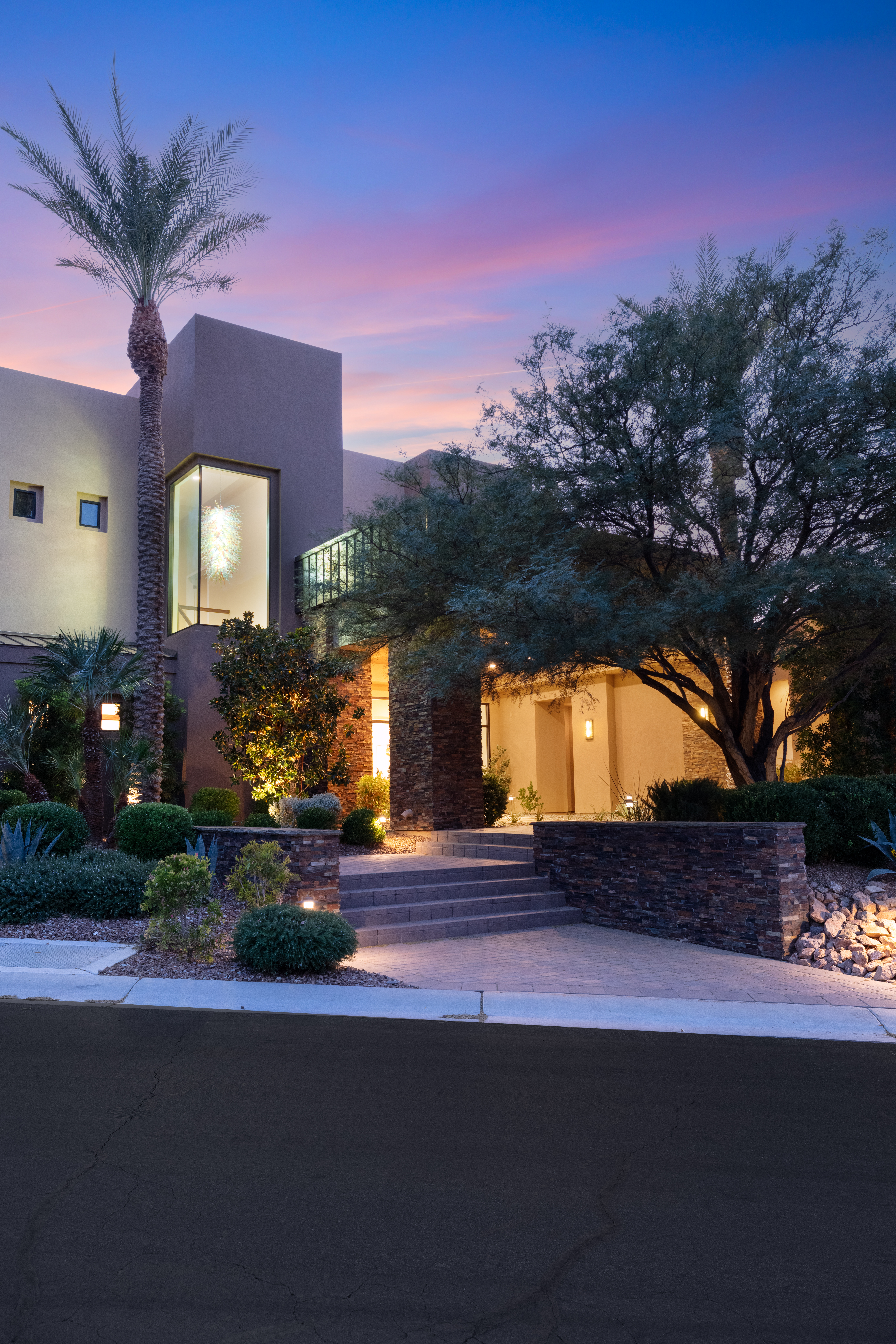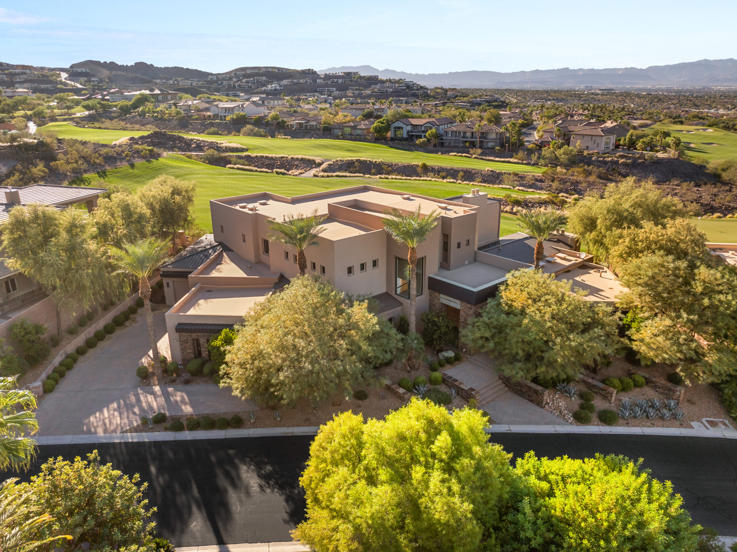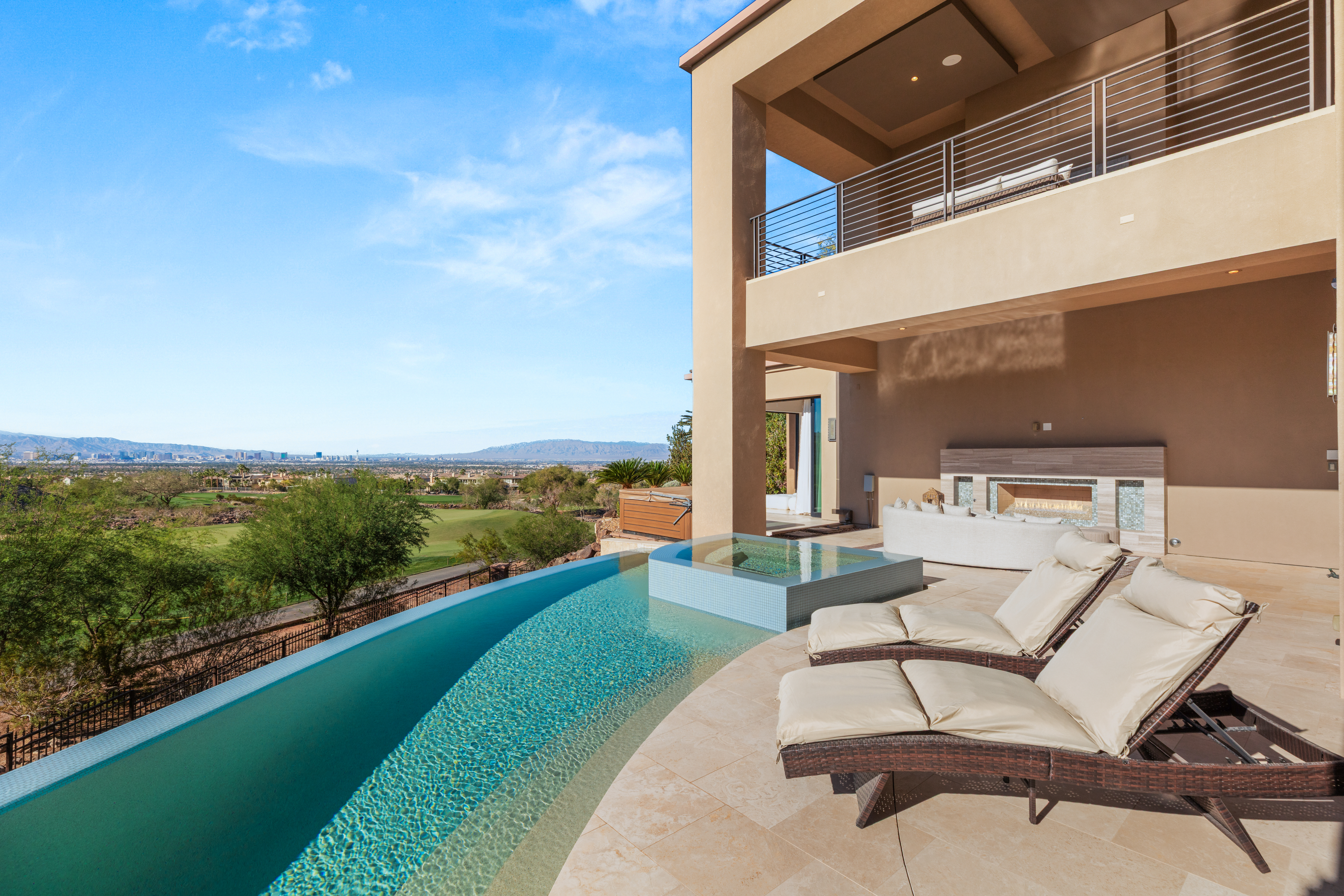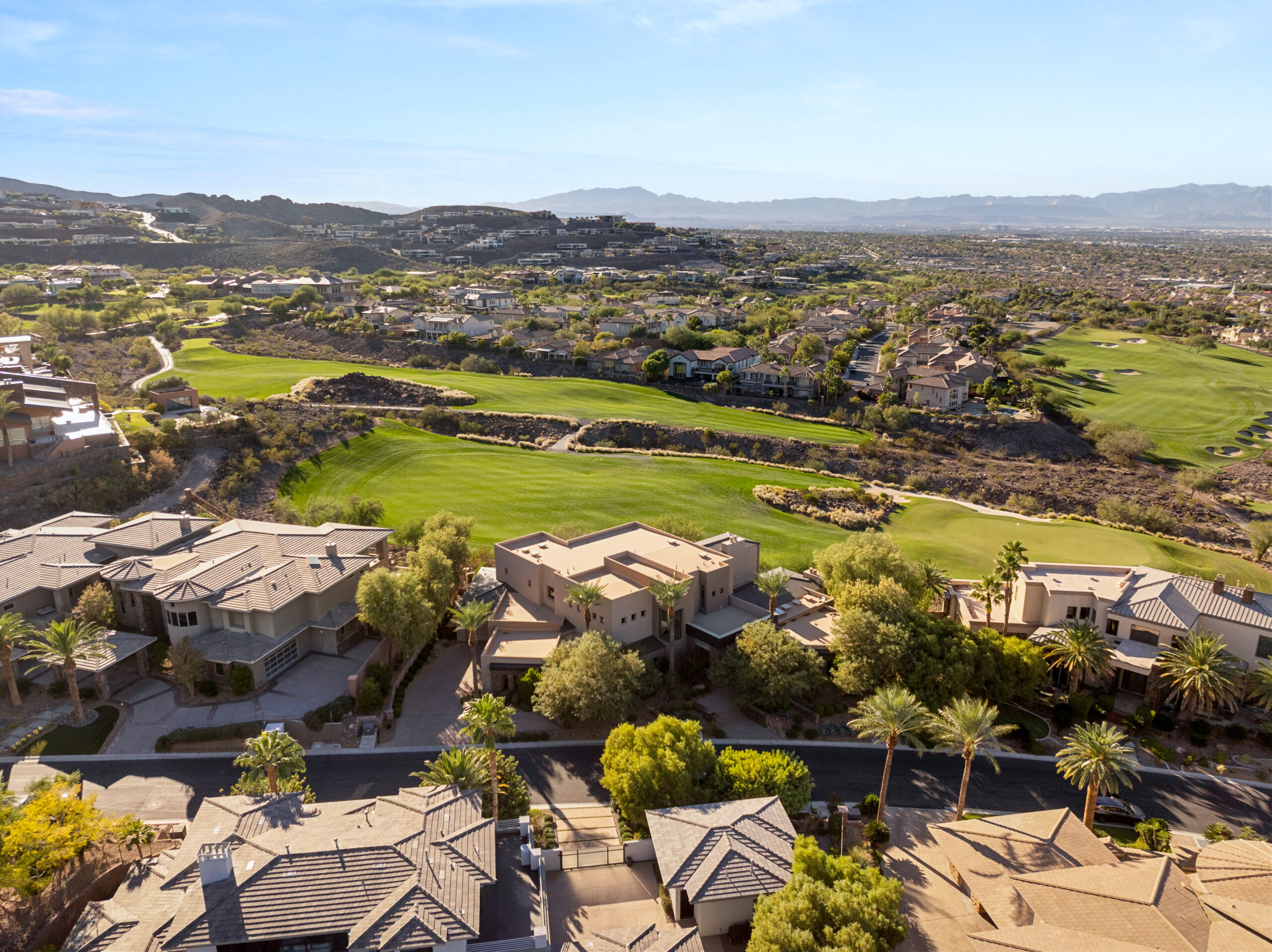 Perched above the valley within the prestigious guard-gated community of MacDonald Highlands, 583 Saint Croix Street is a 9,614-square-foot contemporary estate that captures sweeping views of the Las Vegas Strip, Dragon Ridge Golf Course, and Red Rock Mountains. Set on over half an acre, this custom home blends modern elegance with warmth and light, featuring five bedrooms including two primary suites, seven bathrooms, a private office, theater, game room, formal dining, chef’s kitchen with butler’s pantry, three fireplaces, elevator, and a four-car garage with new epoxy flooring. Fleetwood glass doors open to an outdoor sanctuary with a zero-edge pool, spa, fireplace, BBQ island, and putting green—an entertainer’s dream beneath Nevada skies. Upstairs, a rooftop and wraparound balcony with fireplace frame the city in every direction, offering a front-row view of the desert’s most dazzling horizon where luxury meets light.