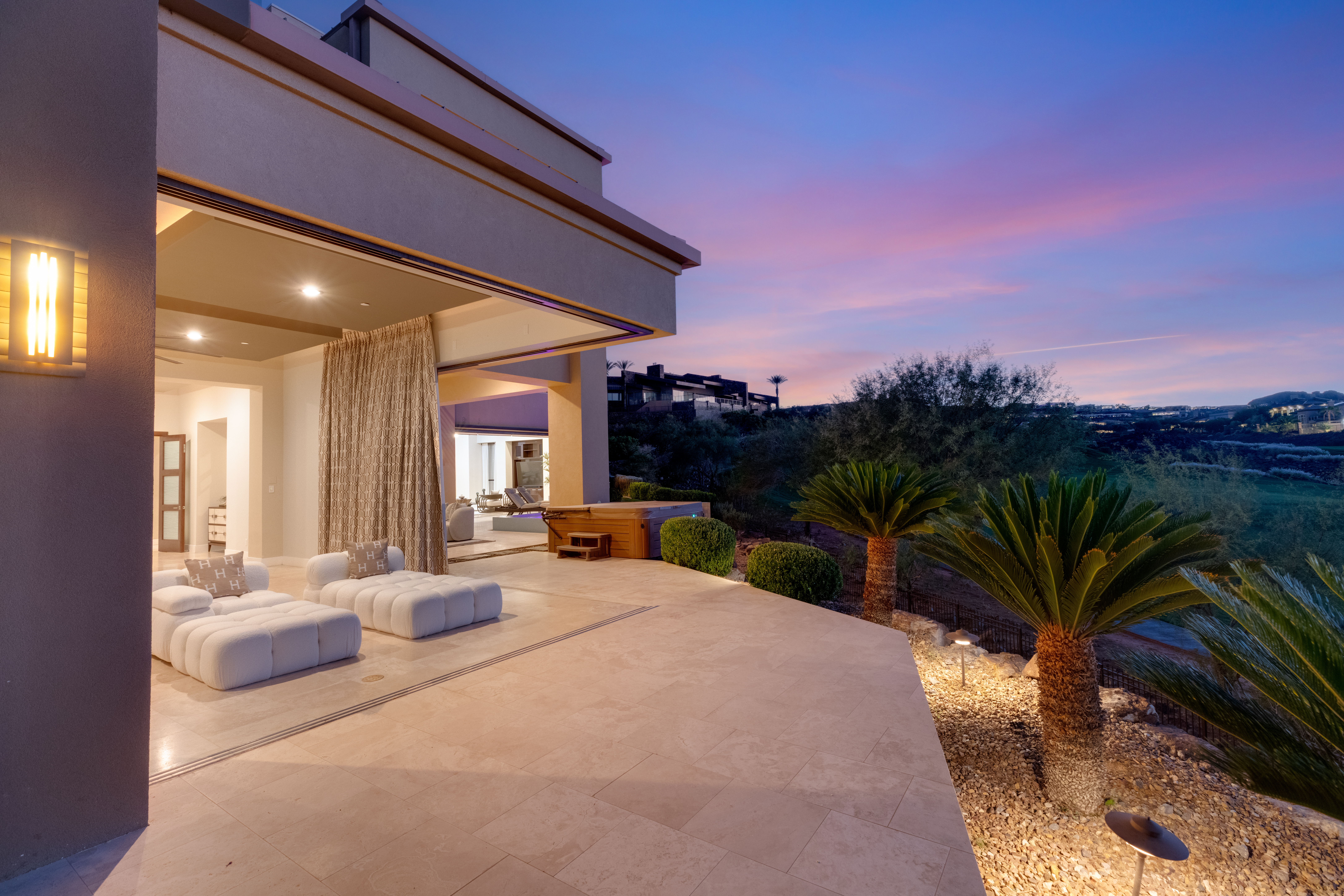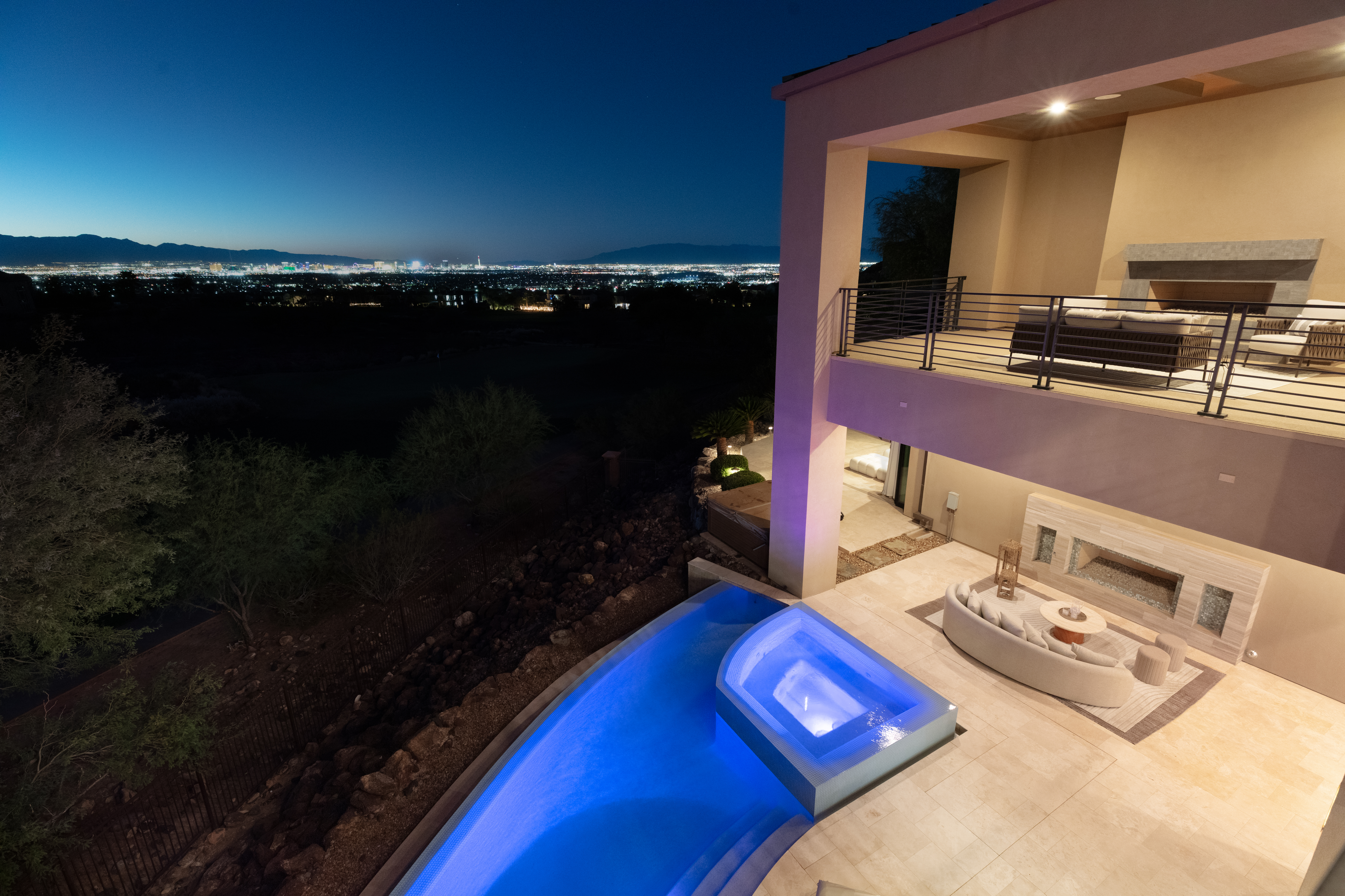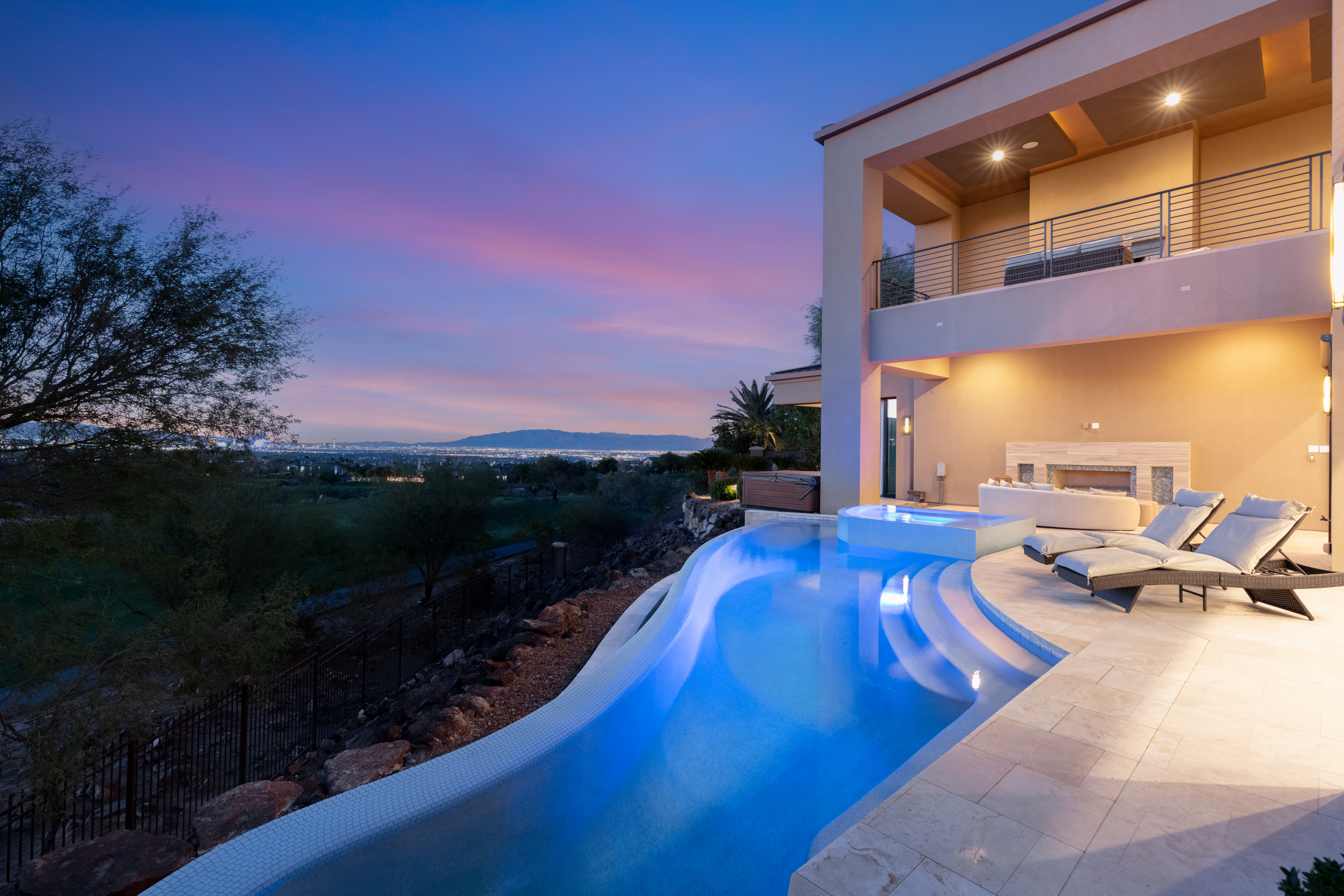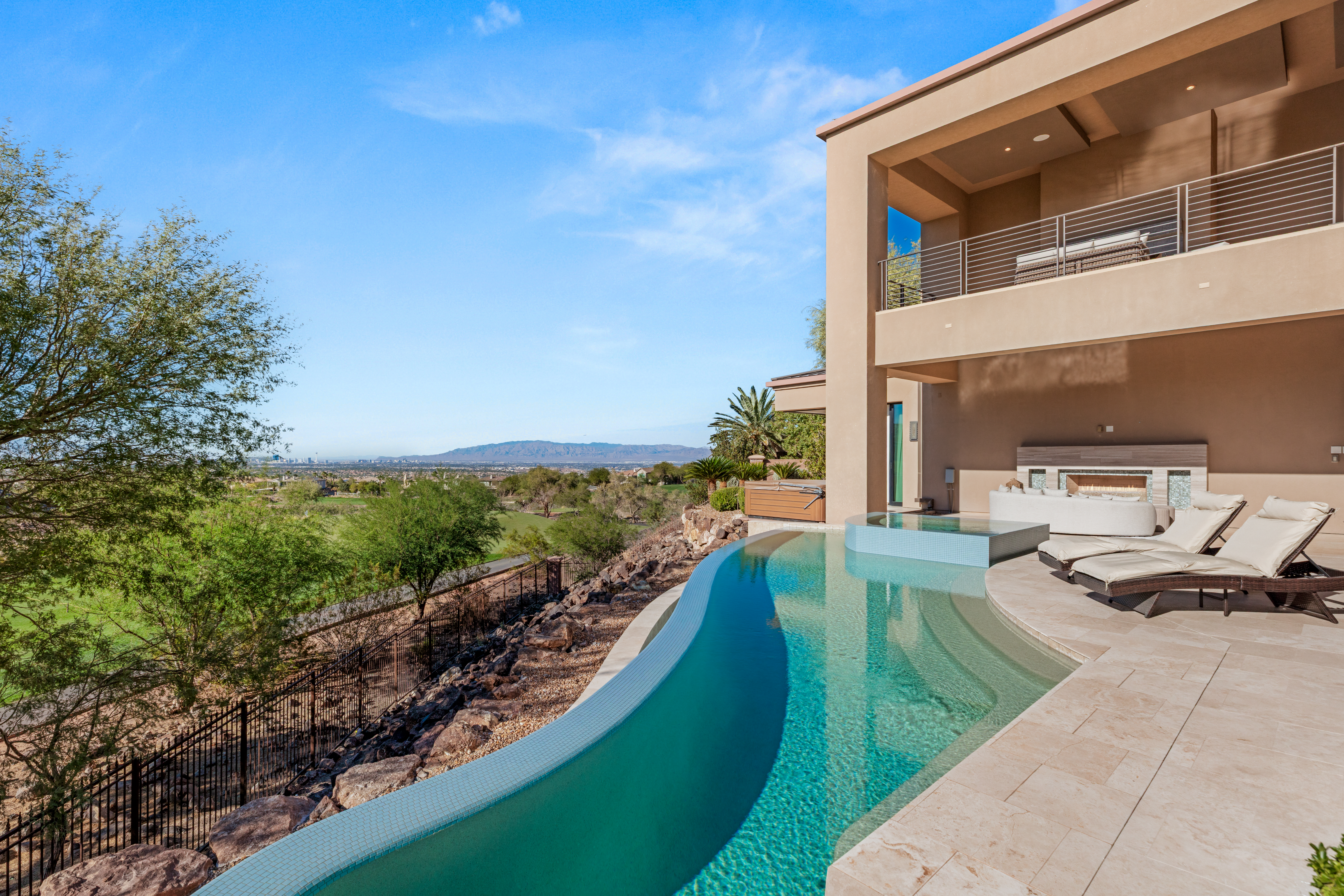 A seamless extension of the home’s modern design, the backyard opens to panoramic golf course and mountain views. The zero-edge pool and elevated spa create a tranquil focal point, framed by spacious patios and shaded lounge areas ideal for outdoor dining or quiet reflection. As daylight fades, the horizon comes alive with the glow of the city—transforming this private retreat into an entertainer’s dream under the desert sky.
