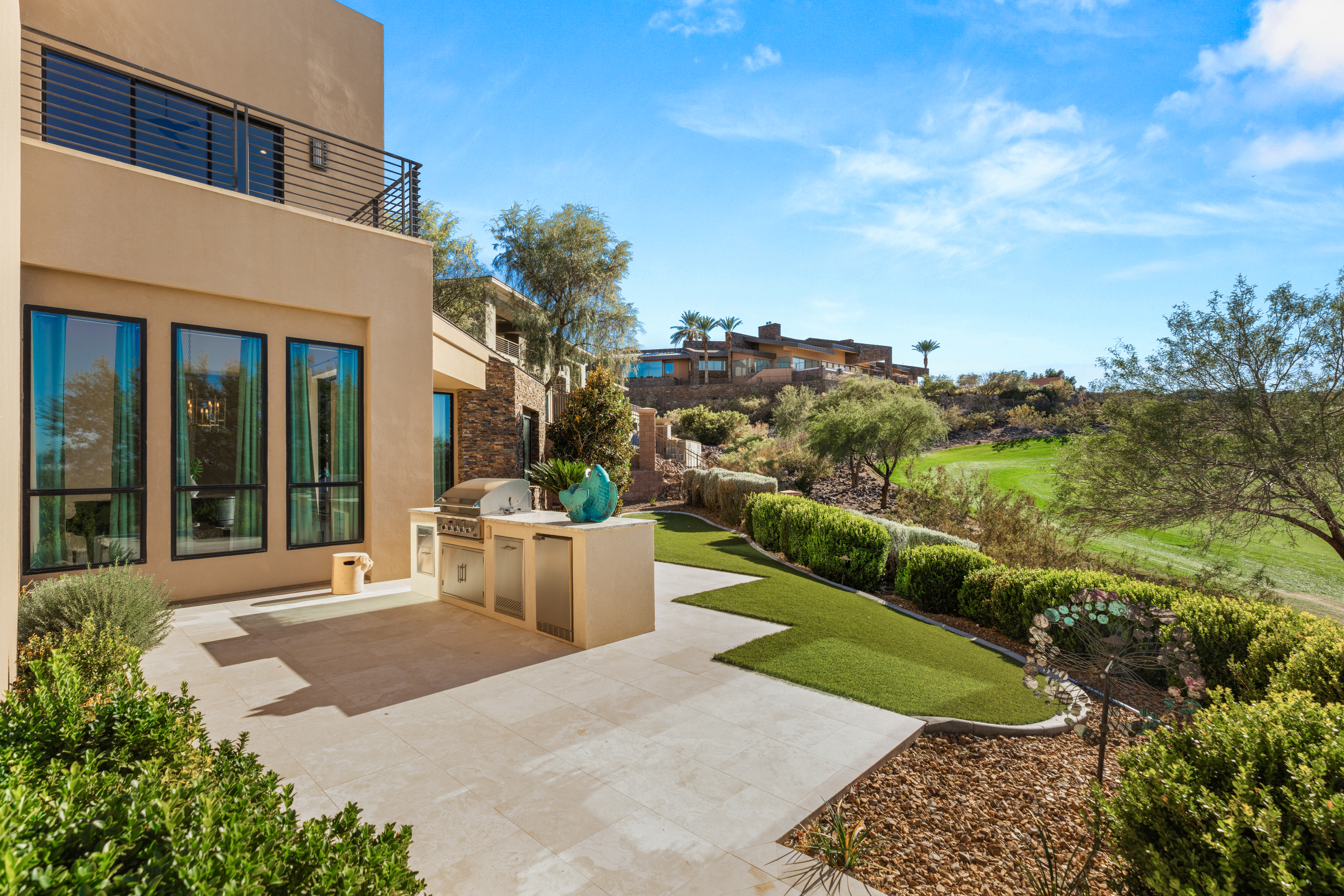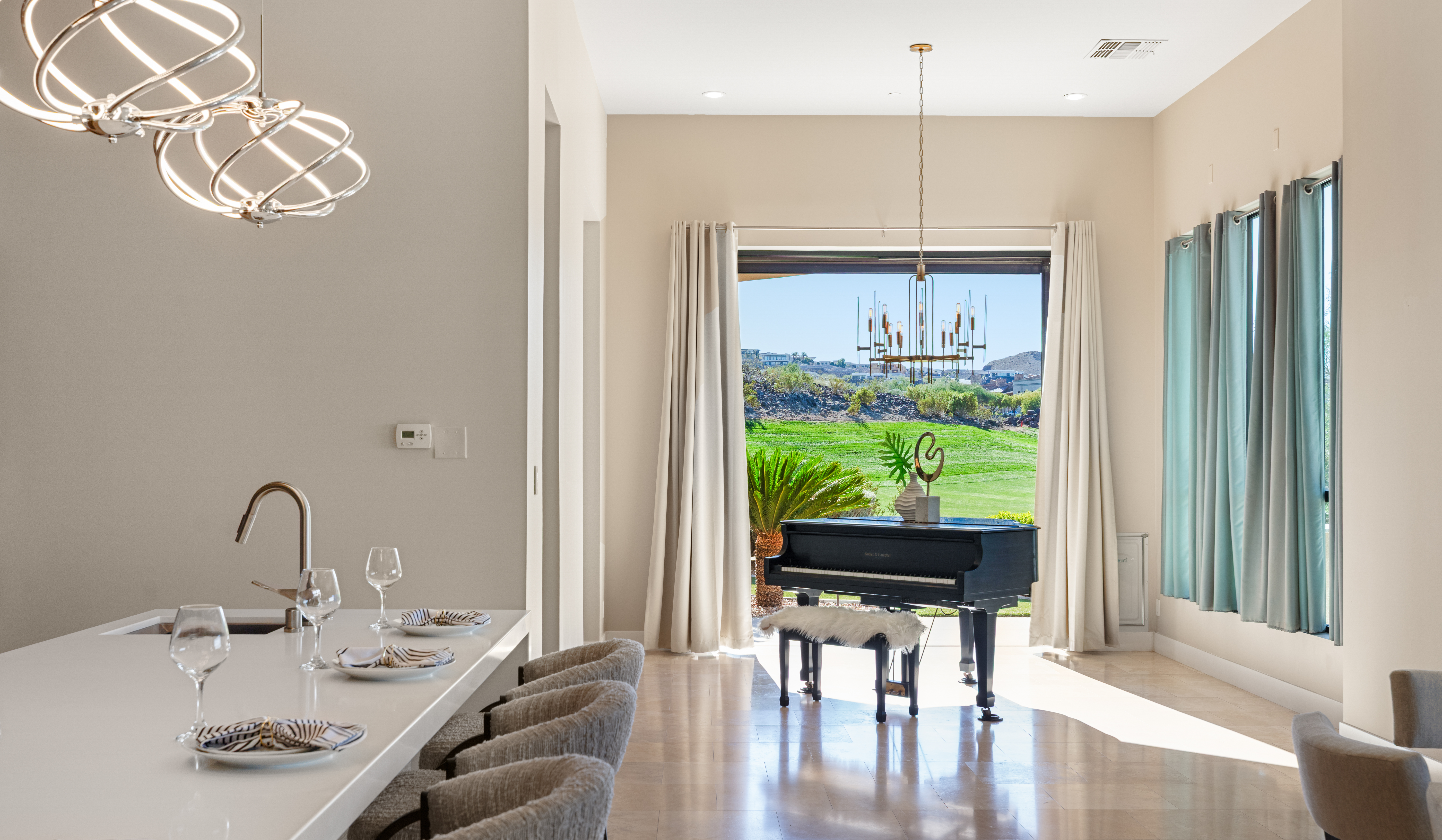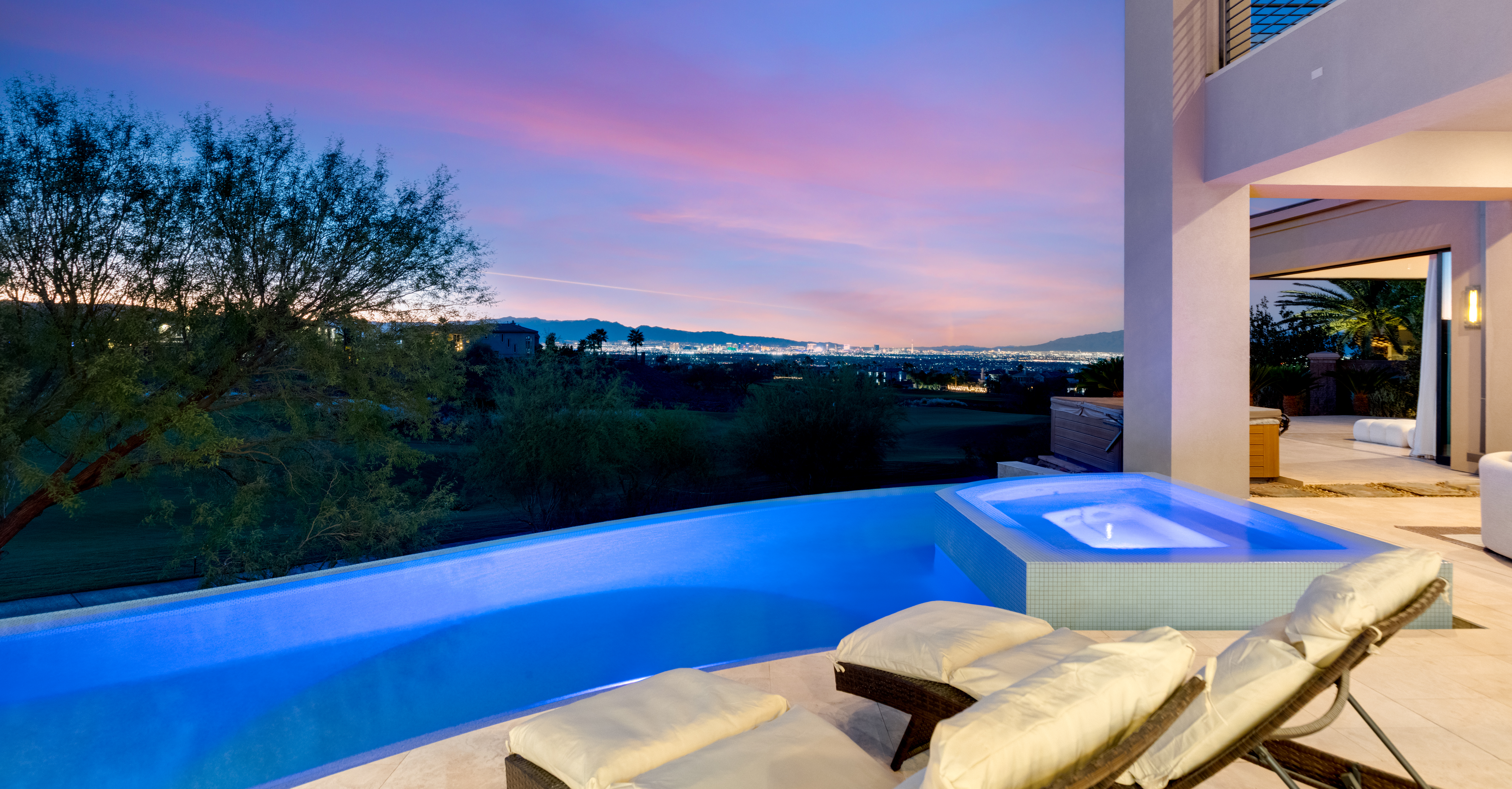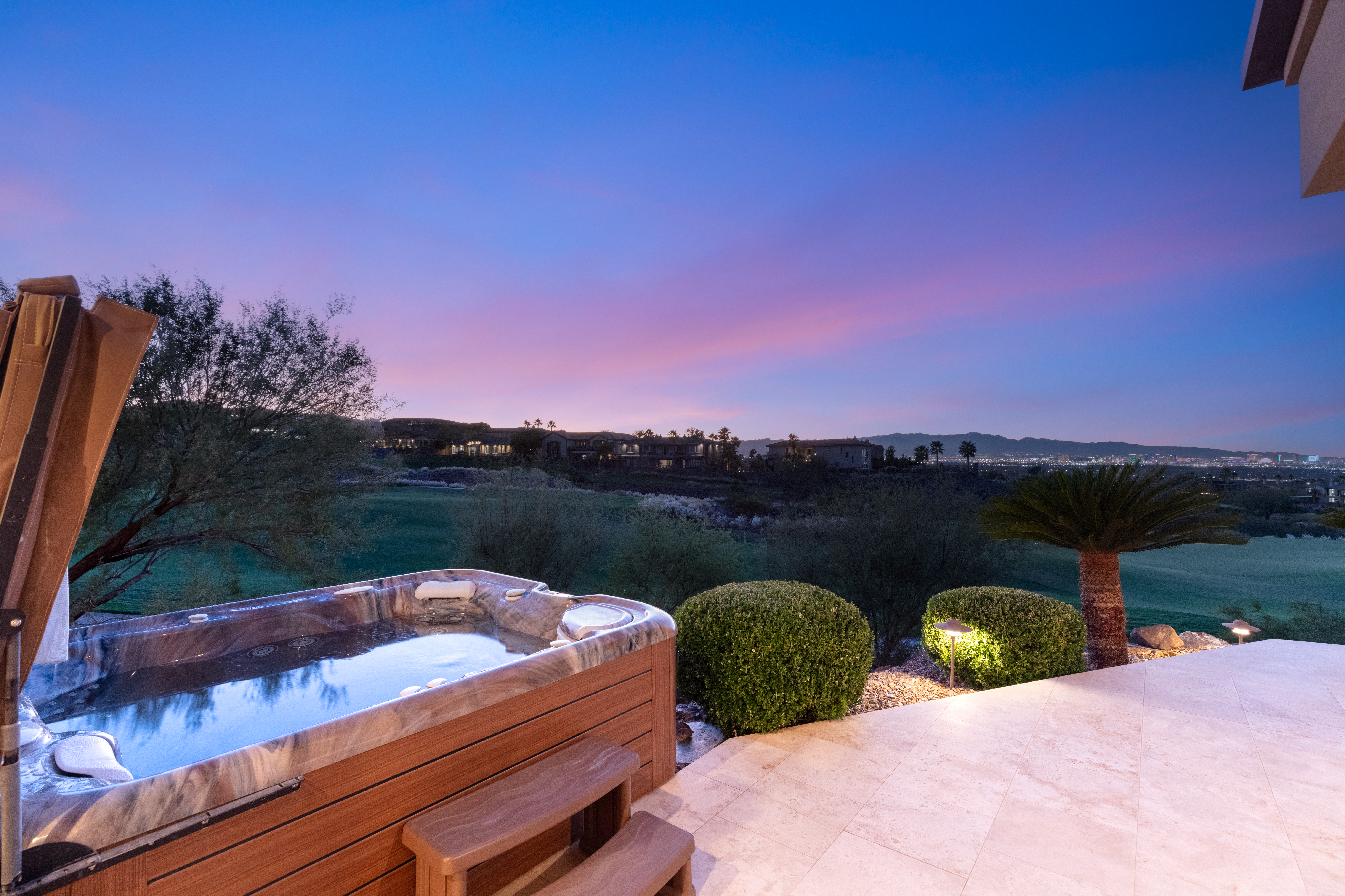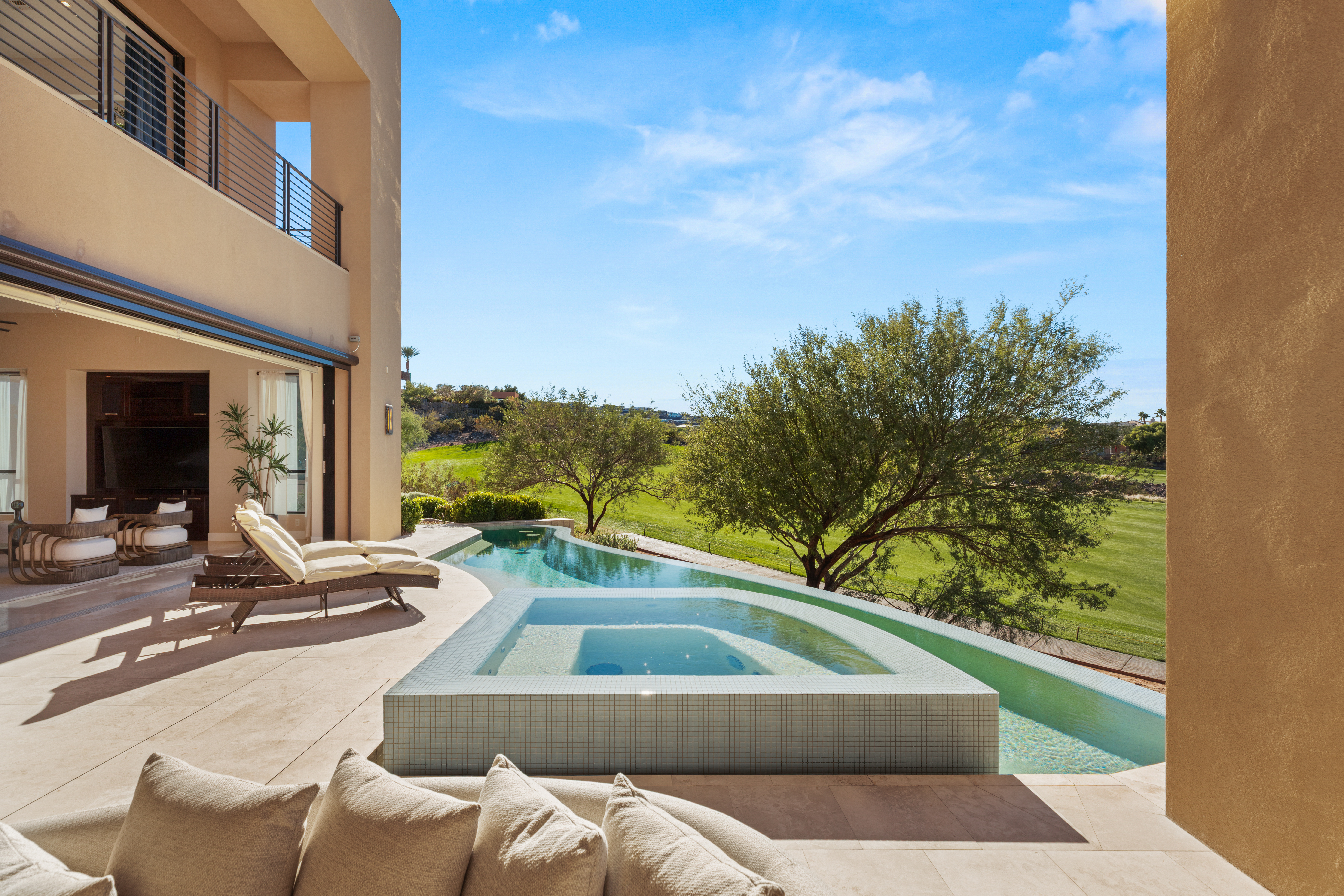 A seamless extension of the home’s modern design, the backyard opens to panoramic golf course and mountain views. The zero-edge pool and elevated spa create a tranquil focal point, framed by spacious patios and shaded lounge areas ideal for outdoor dining or quiet reflection. As daylight fades, the horizon comes alive with the glow of the city—transforming this private retreat into an entertainer’s dream under the desert sky.