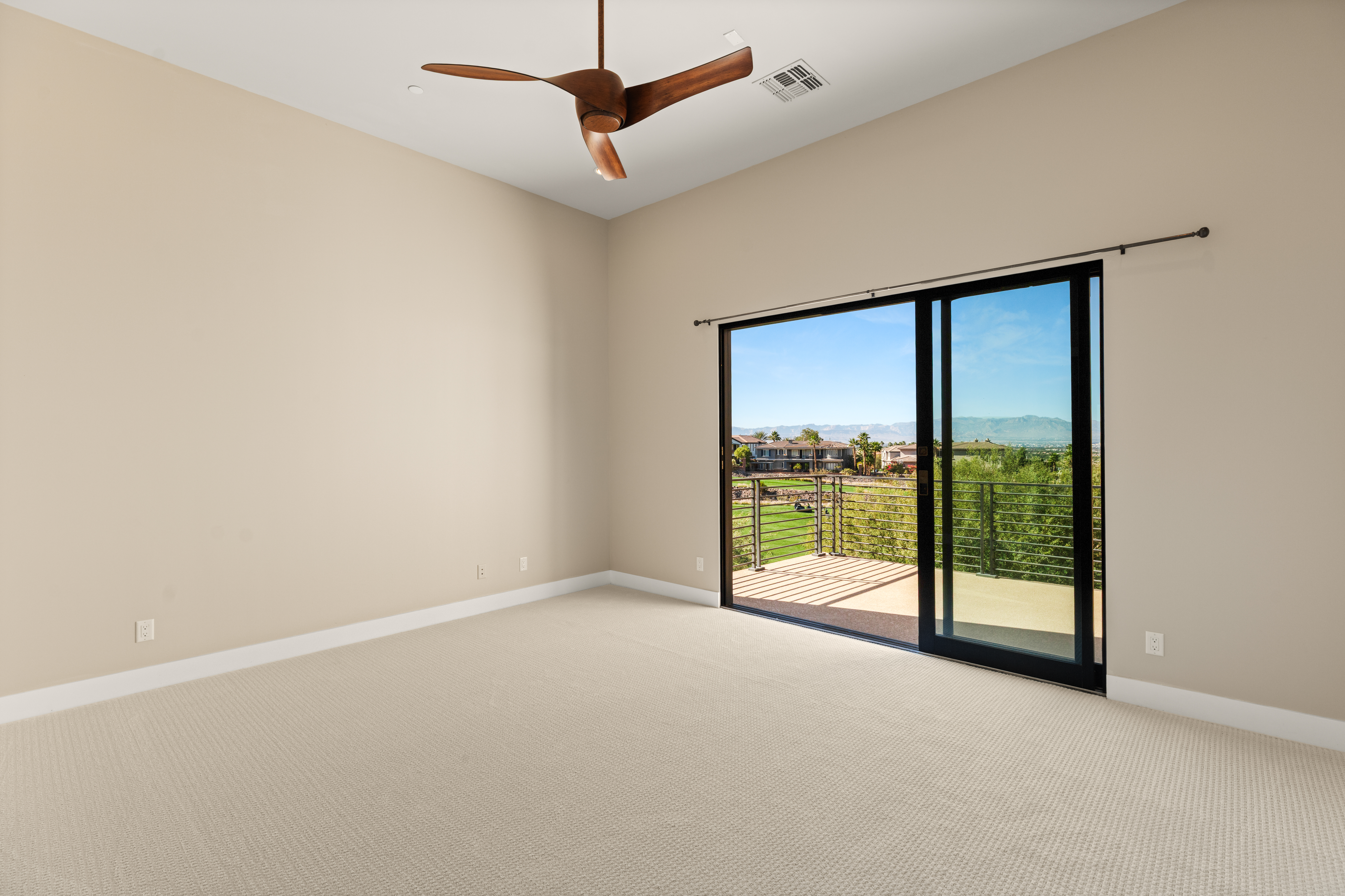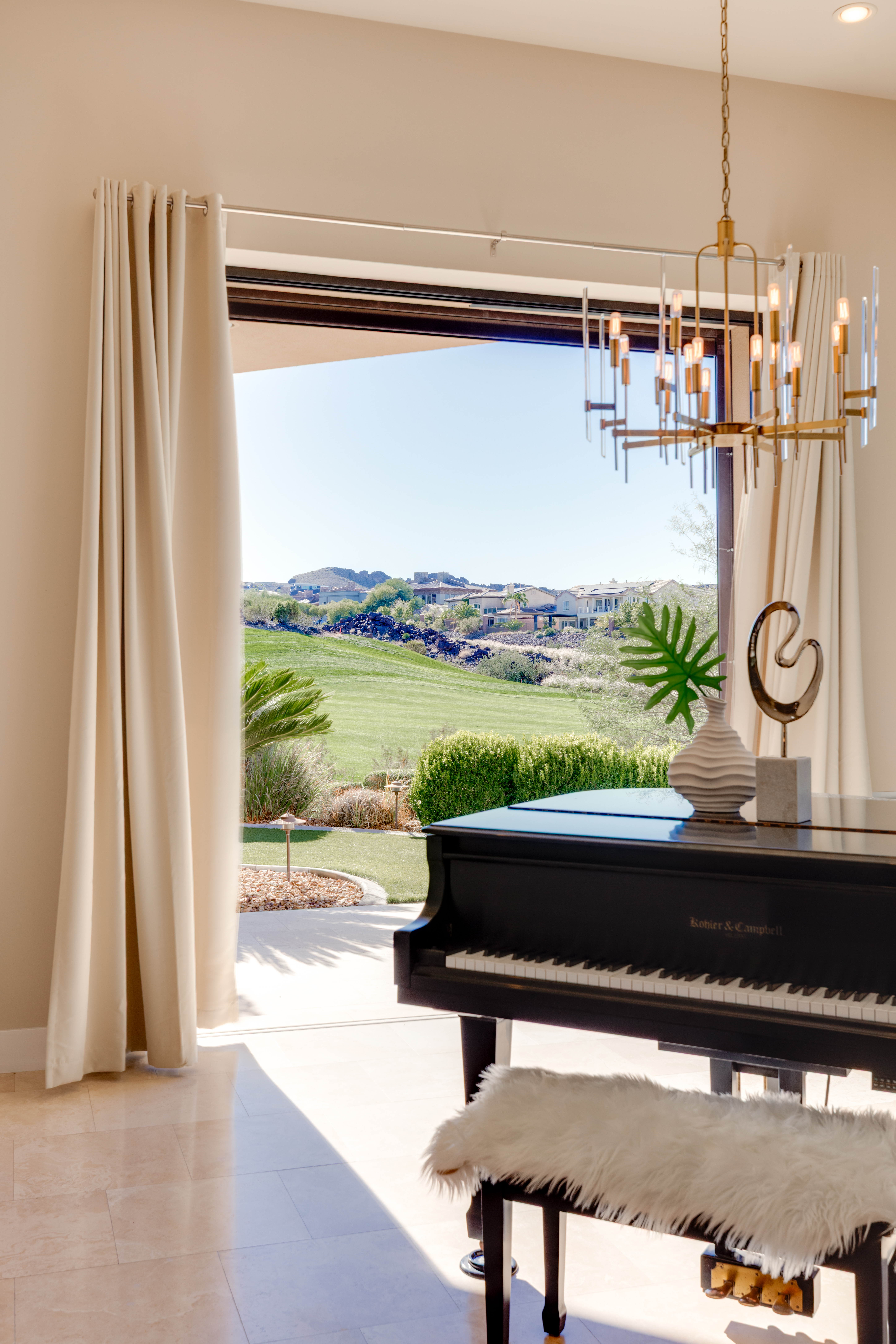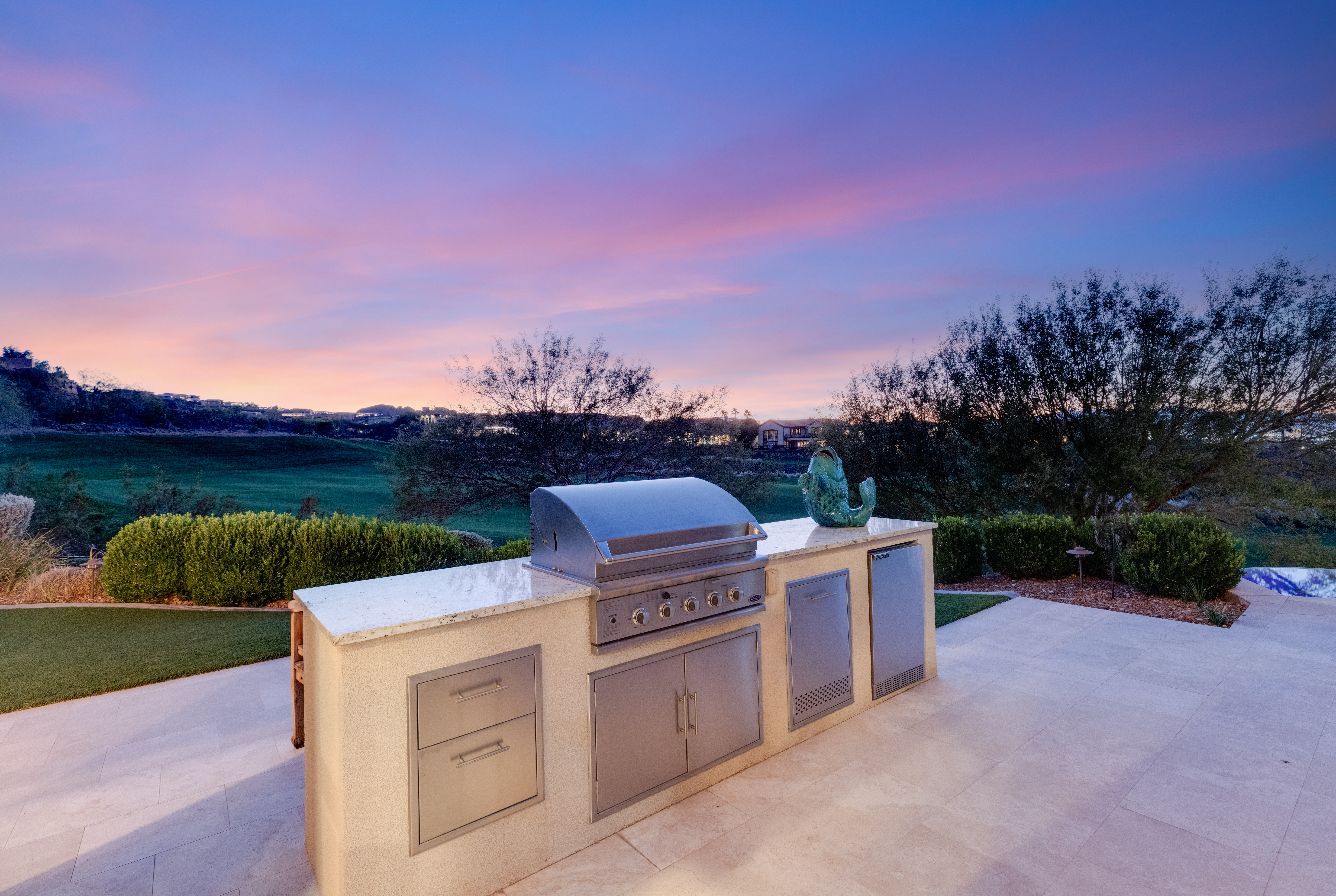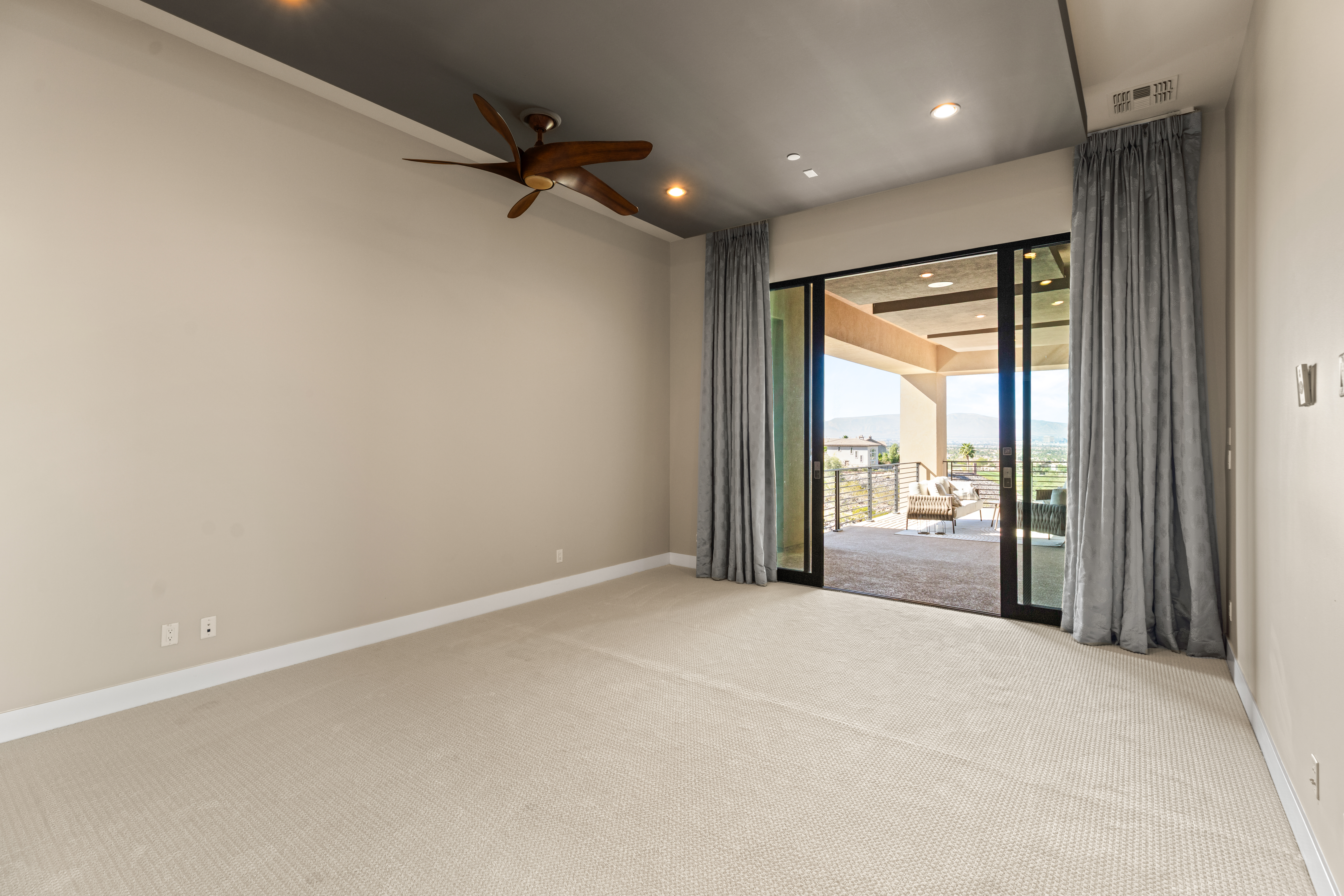 A seamless extension of the home’s modern design, the backyard opens to panoramic golf course and mountain views. The zero-edge pool and elevated spa create a tranquil focal point, framed by spacious patios and shaded lounge areas ideal for outdoor dining or quiet reflection. As daylight fades, the horizon comes alive with the glow of the city—transforming this private retreat into an entertainer’s dream under the desert sky.