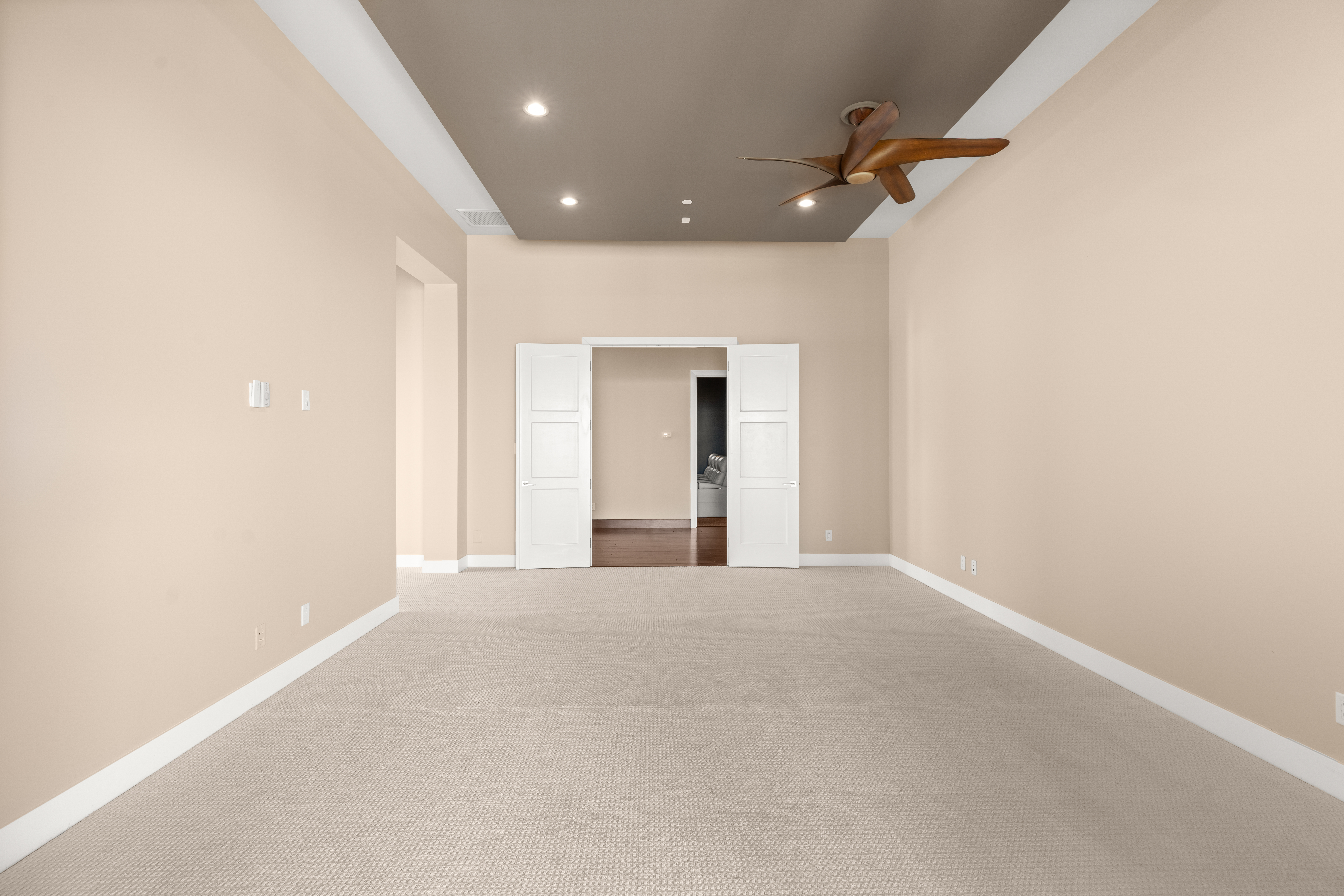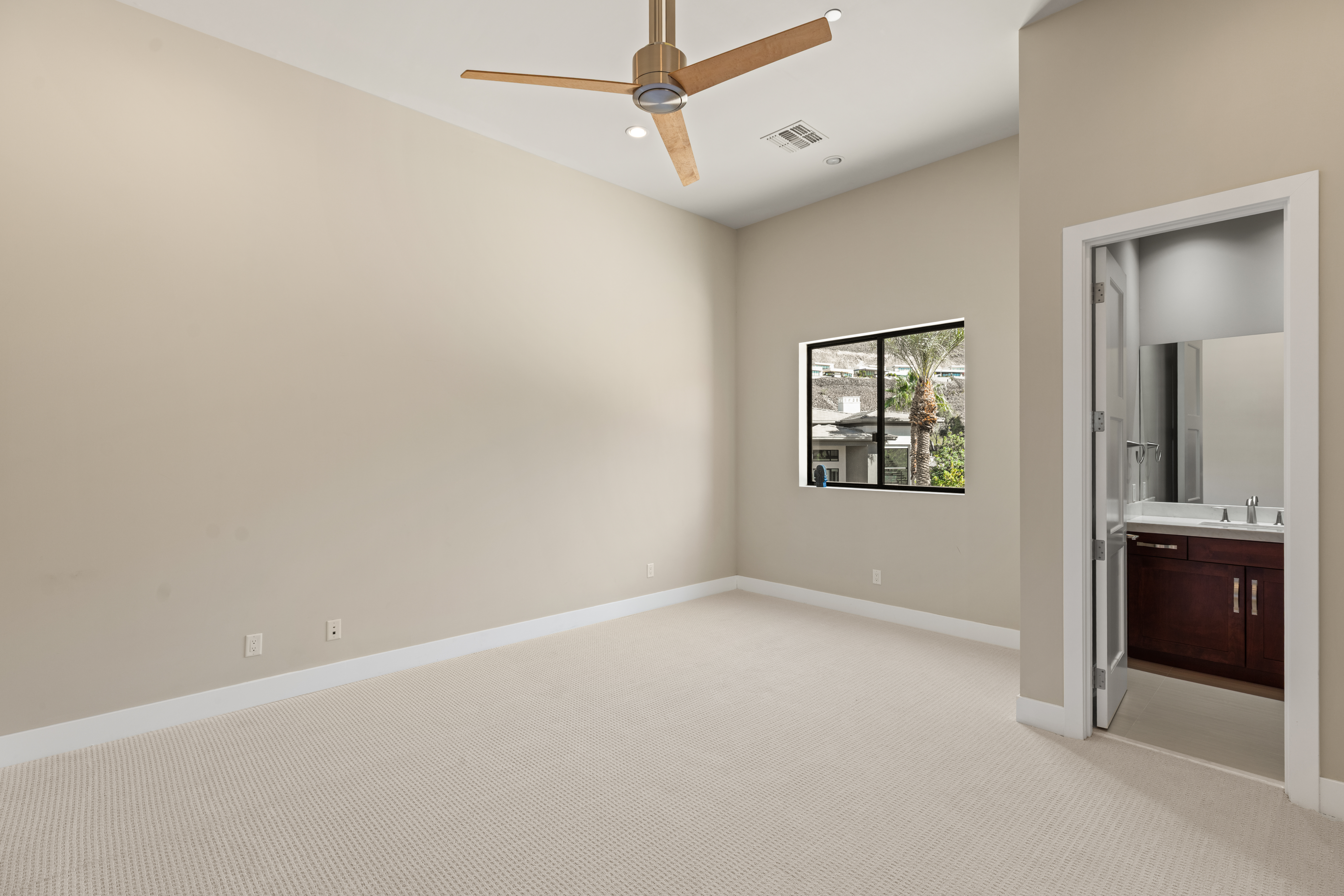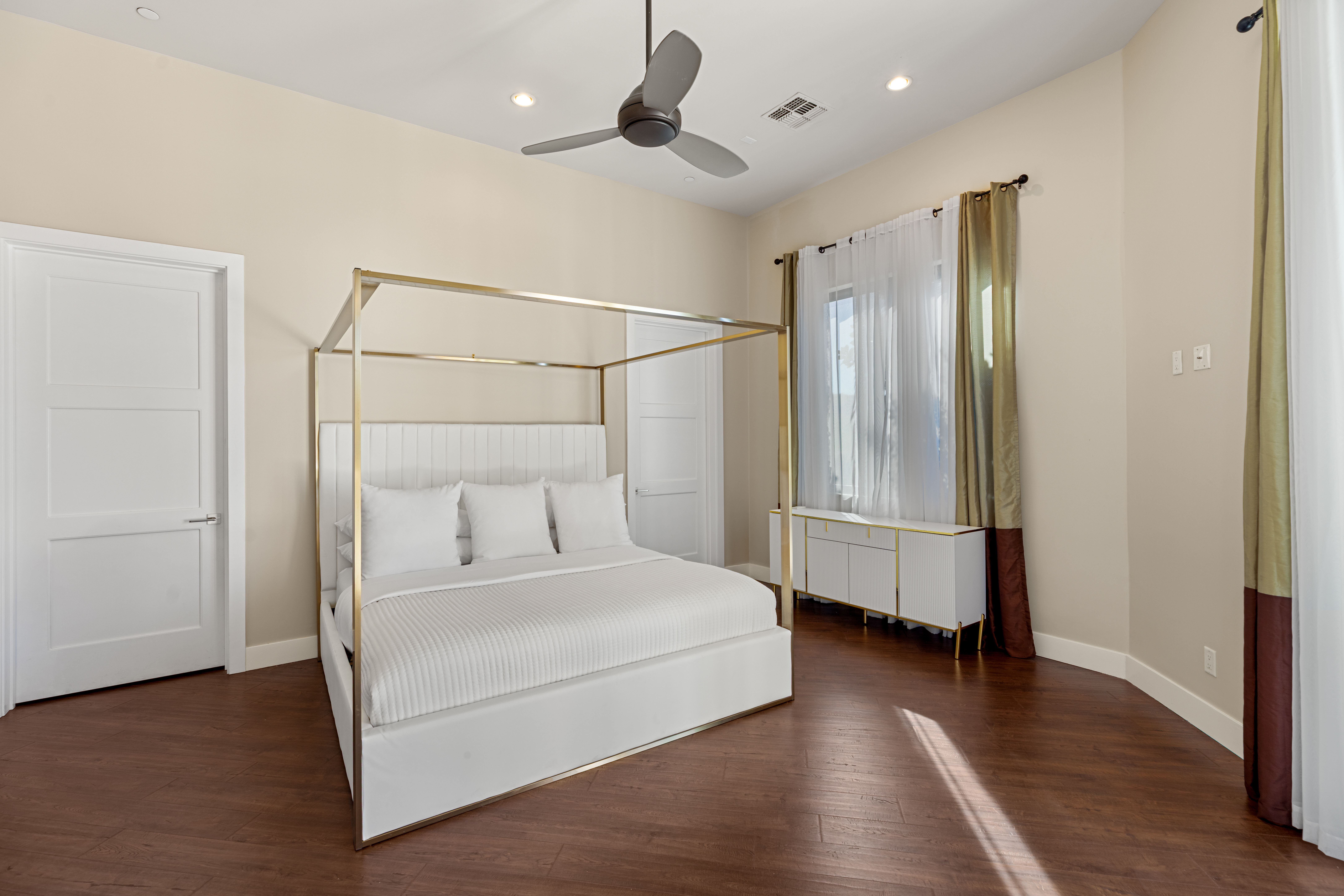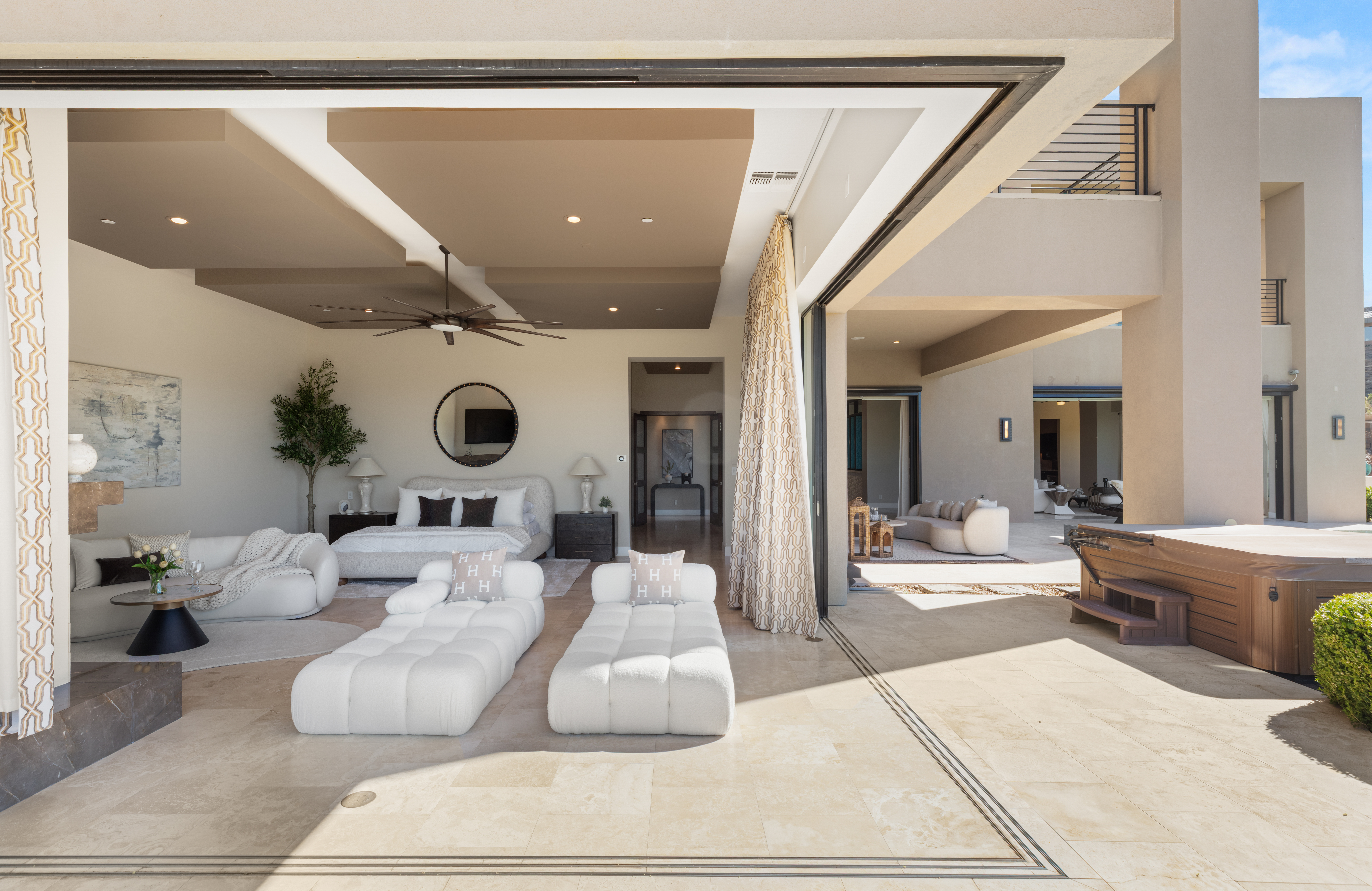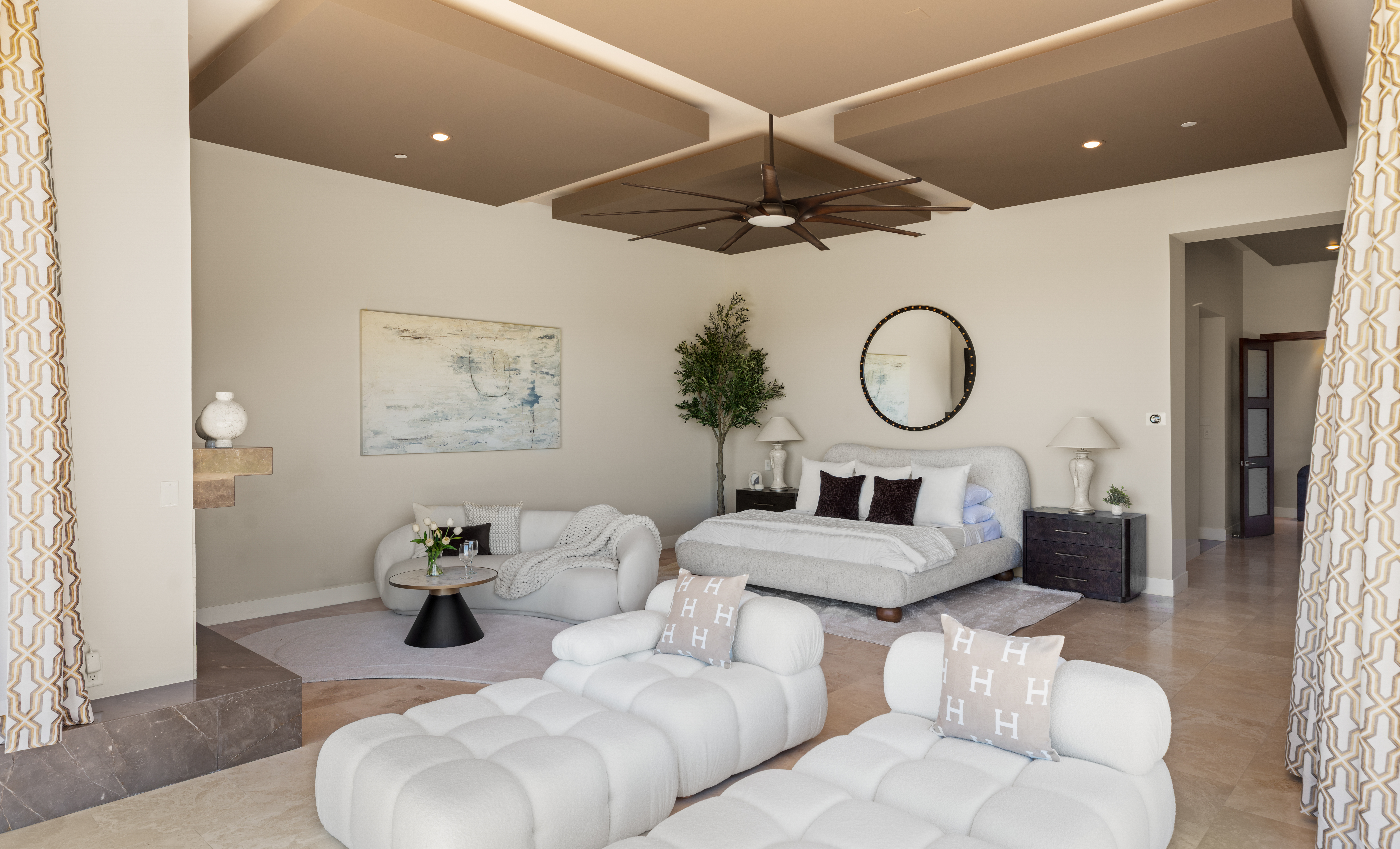 A serene escape designed for rest and reflection, the primary bedroom features soft architectural lines, layered textures, and a seamless connection to the outdoors. With generous space for a private sitting area, natural light pours through large windows, framing peaceful views that shift beautifully from morning glow to evening quiet.