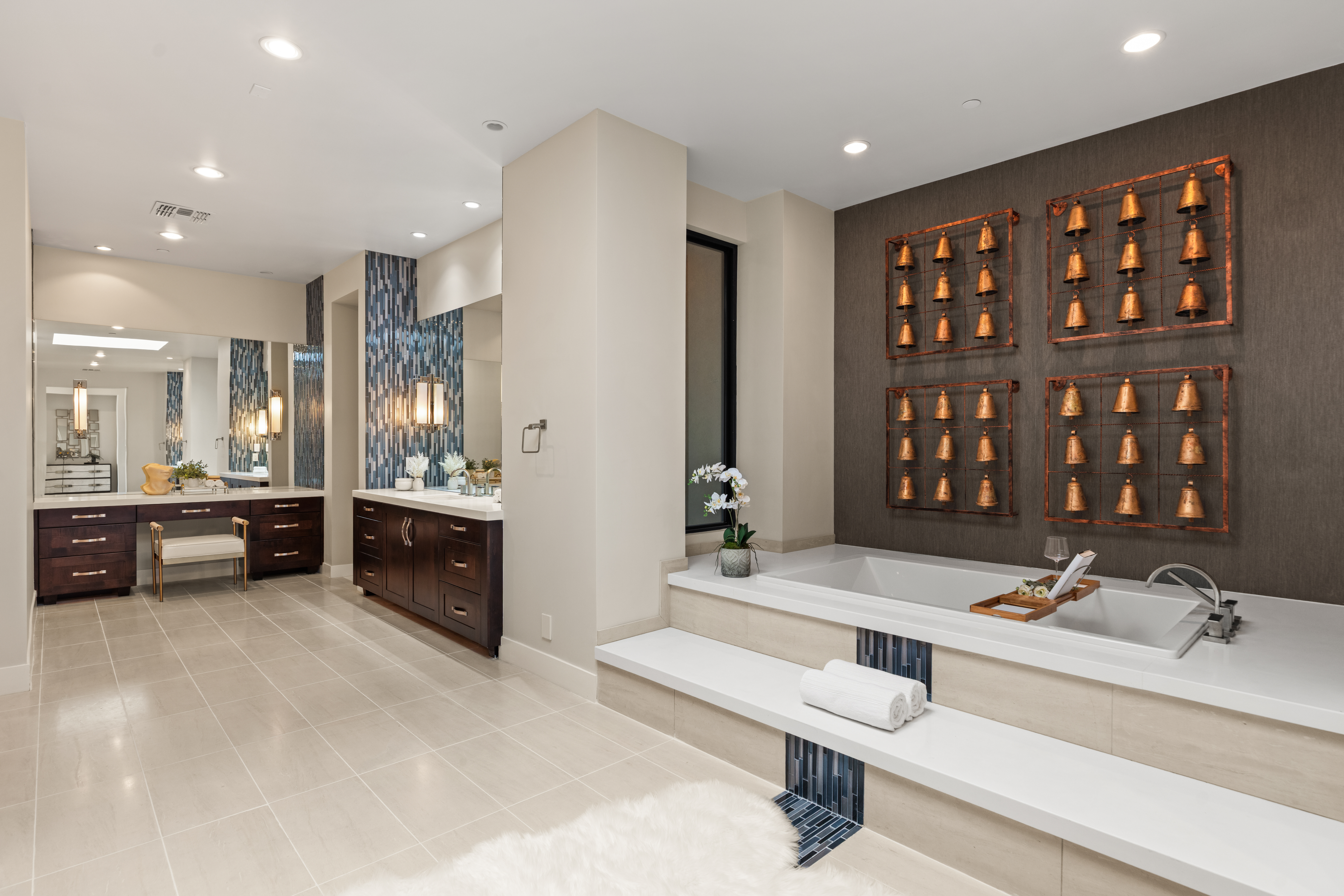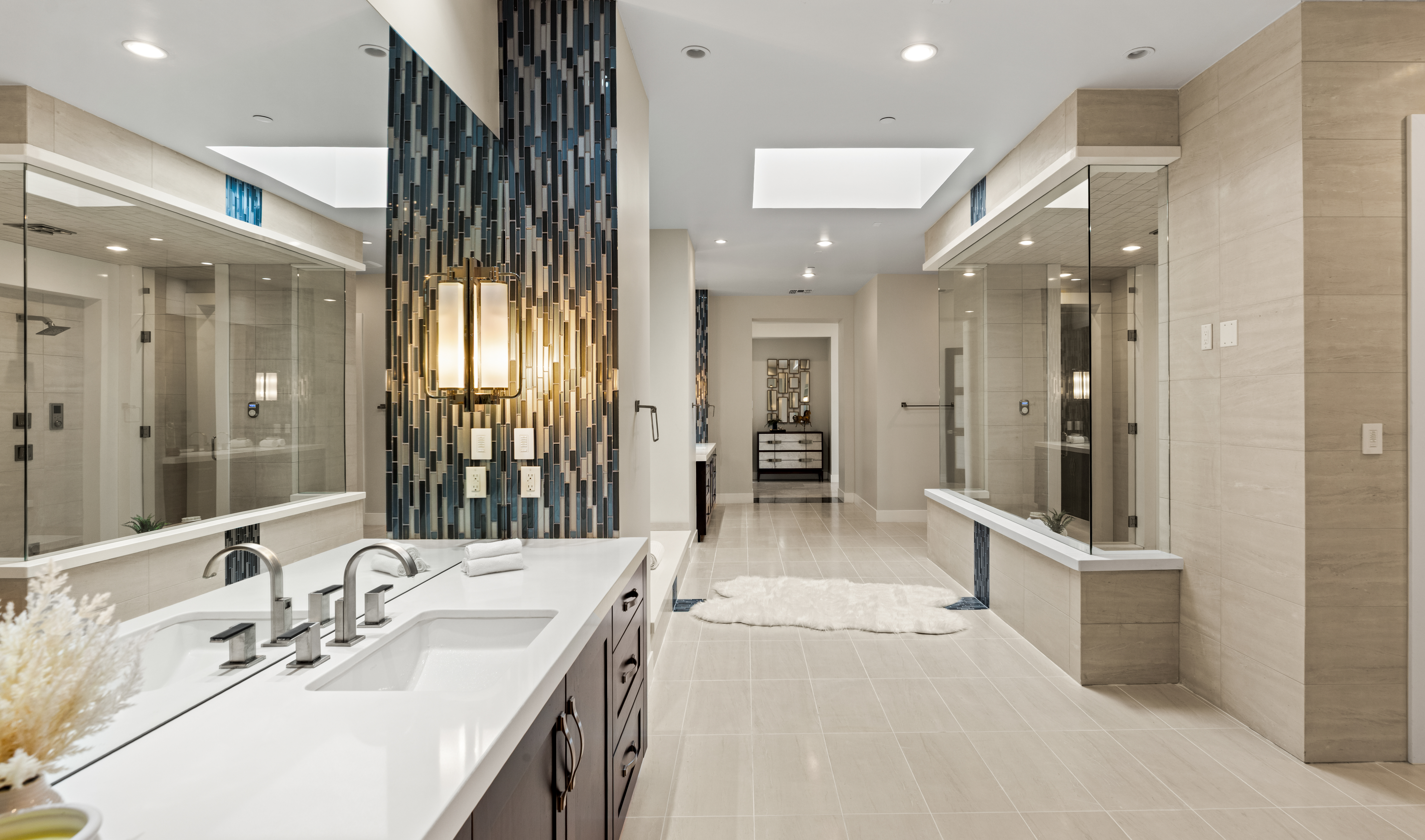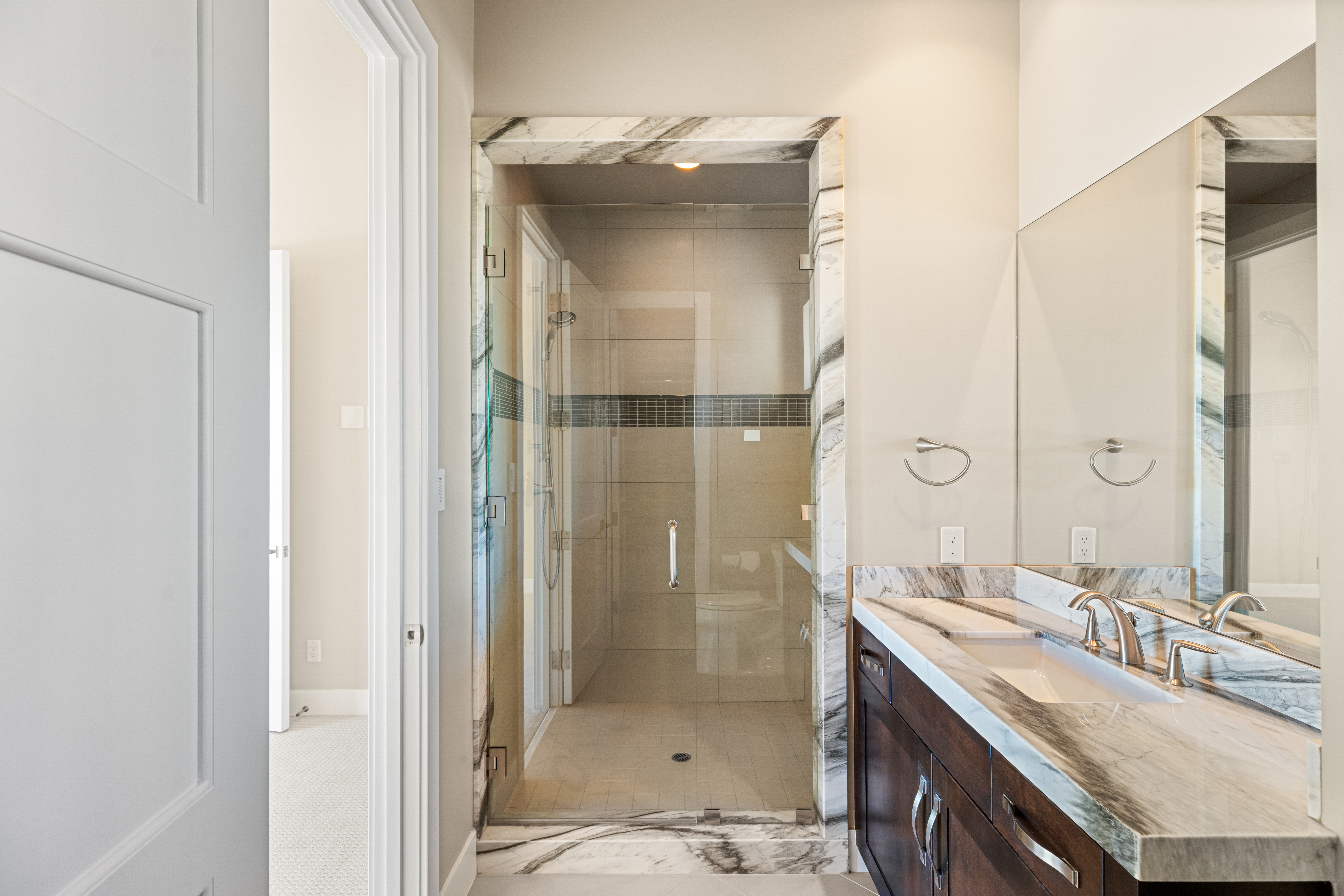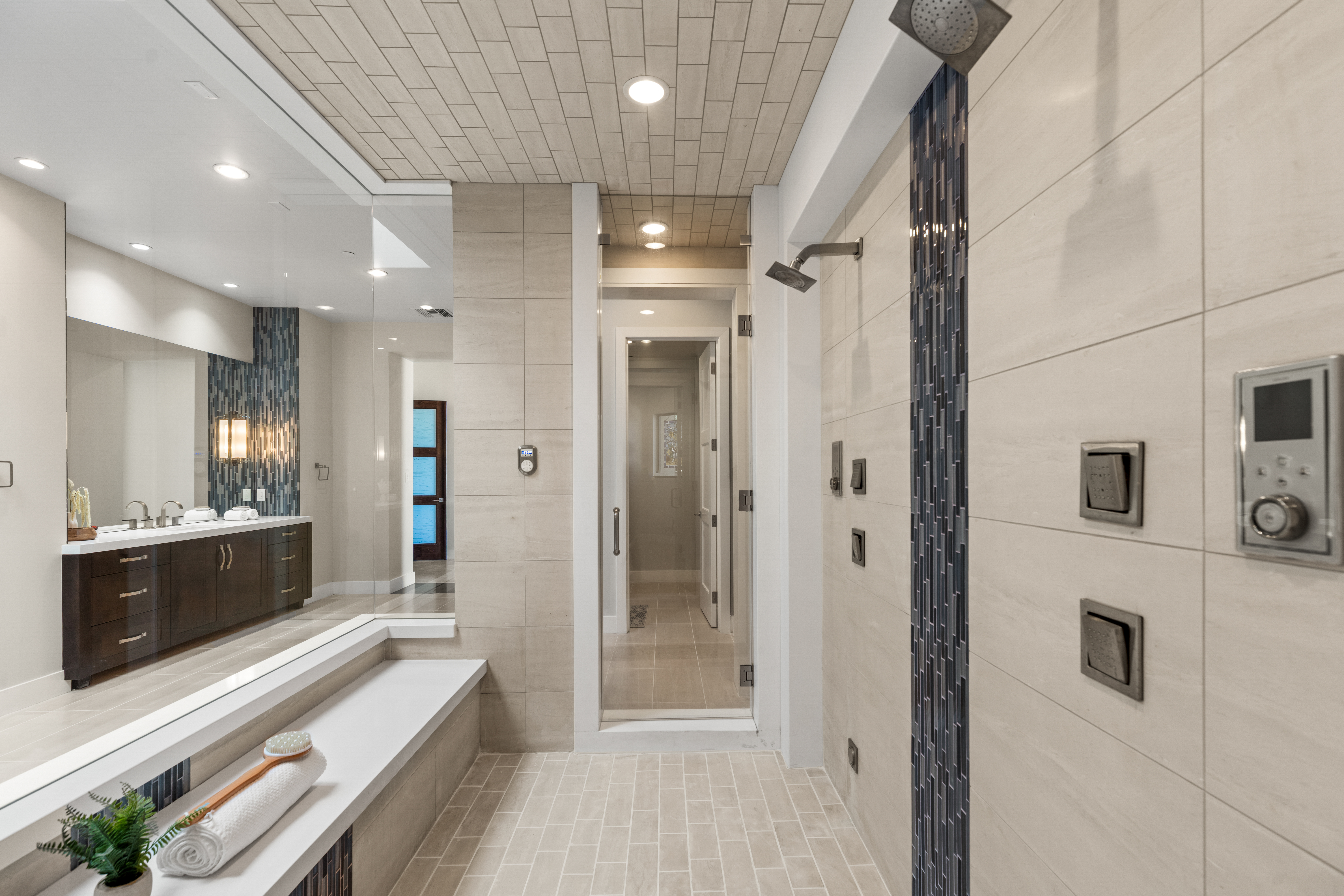 Designed with serenity in mind, the primary bath features dual vanities, a deep soaking tub, and spa-like finishes that create a true sense of escape. Subtle textures, warm lighting, and refined tilework transform everyday routines into moments of quiet indulgence.