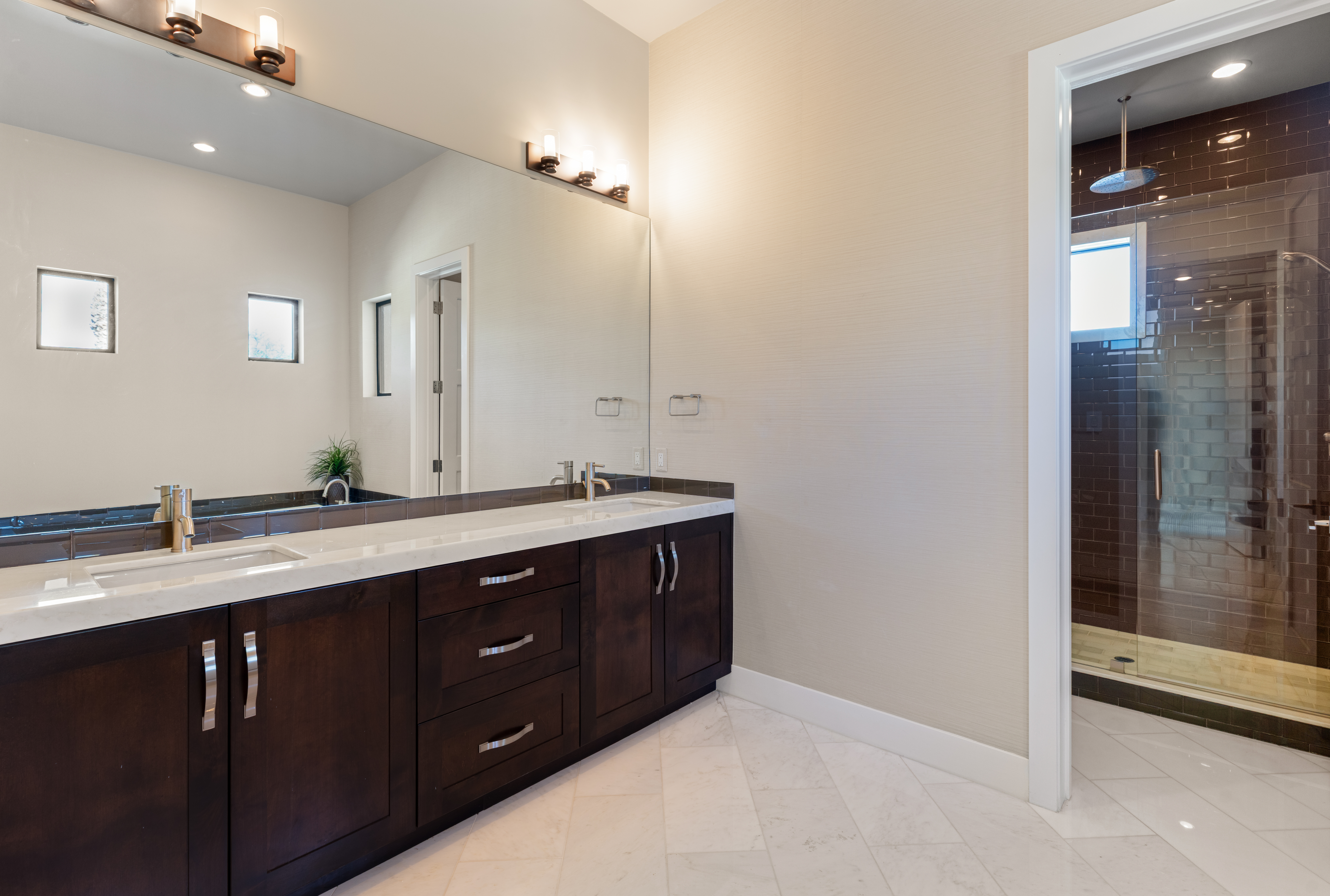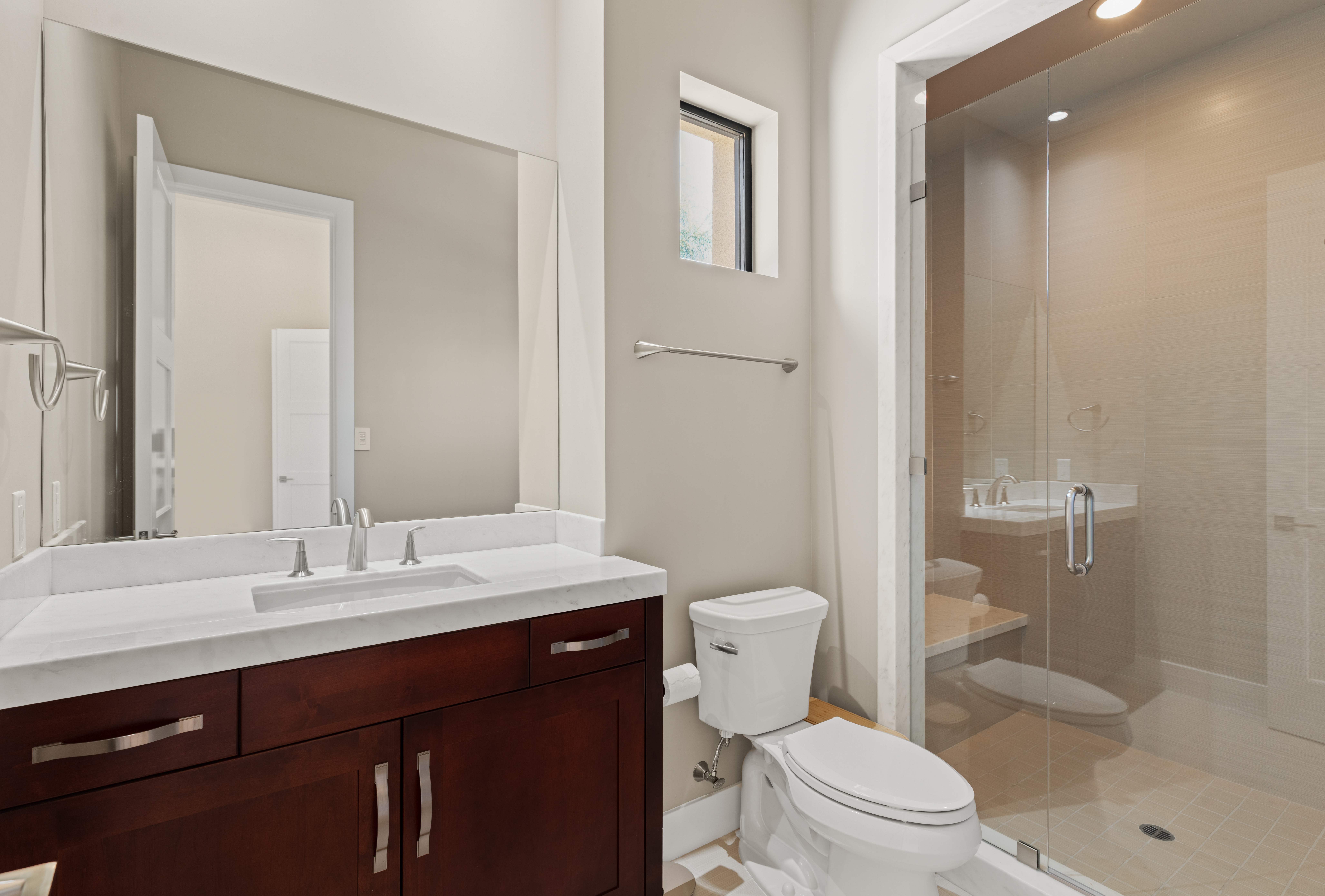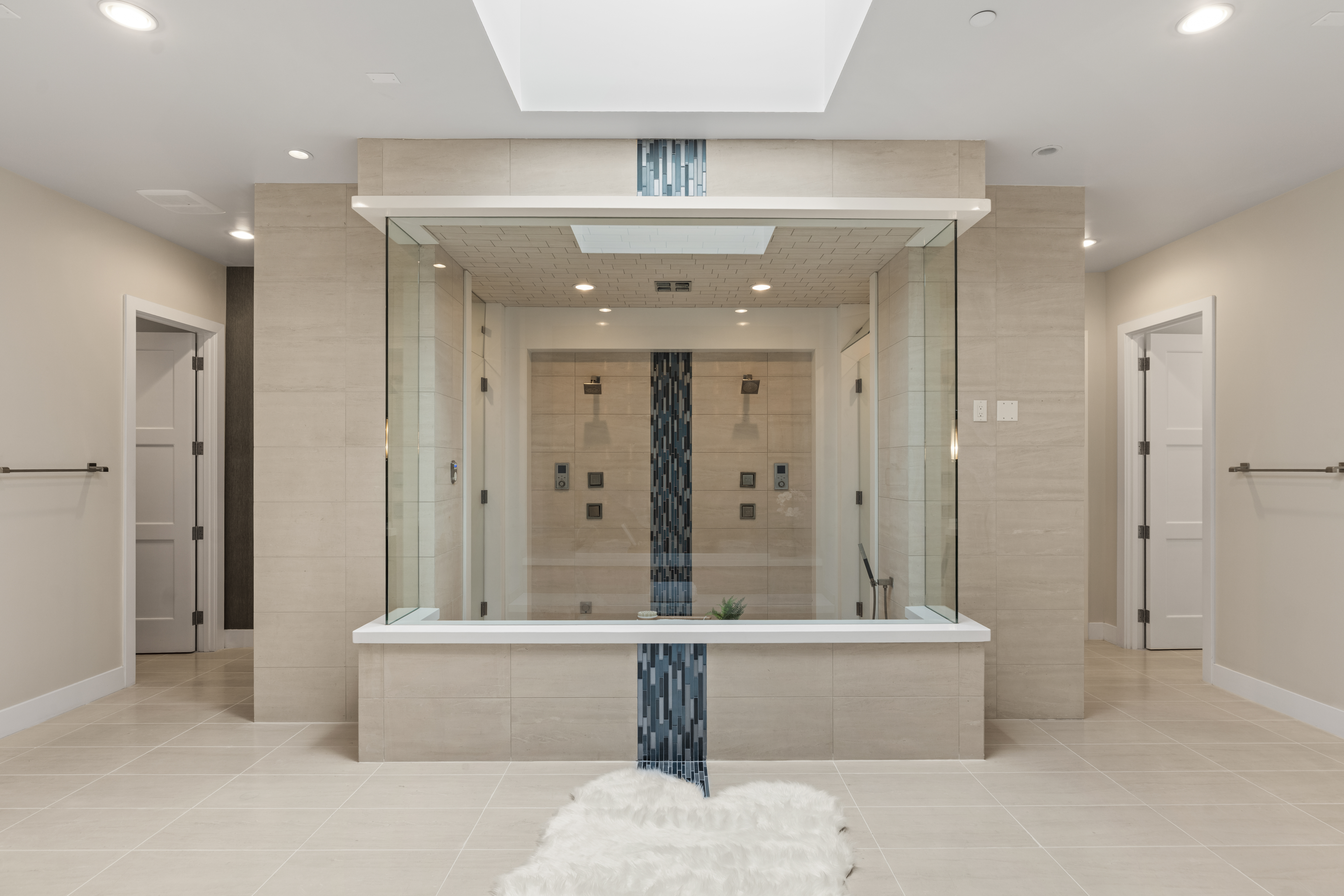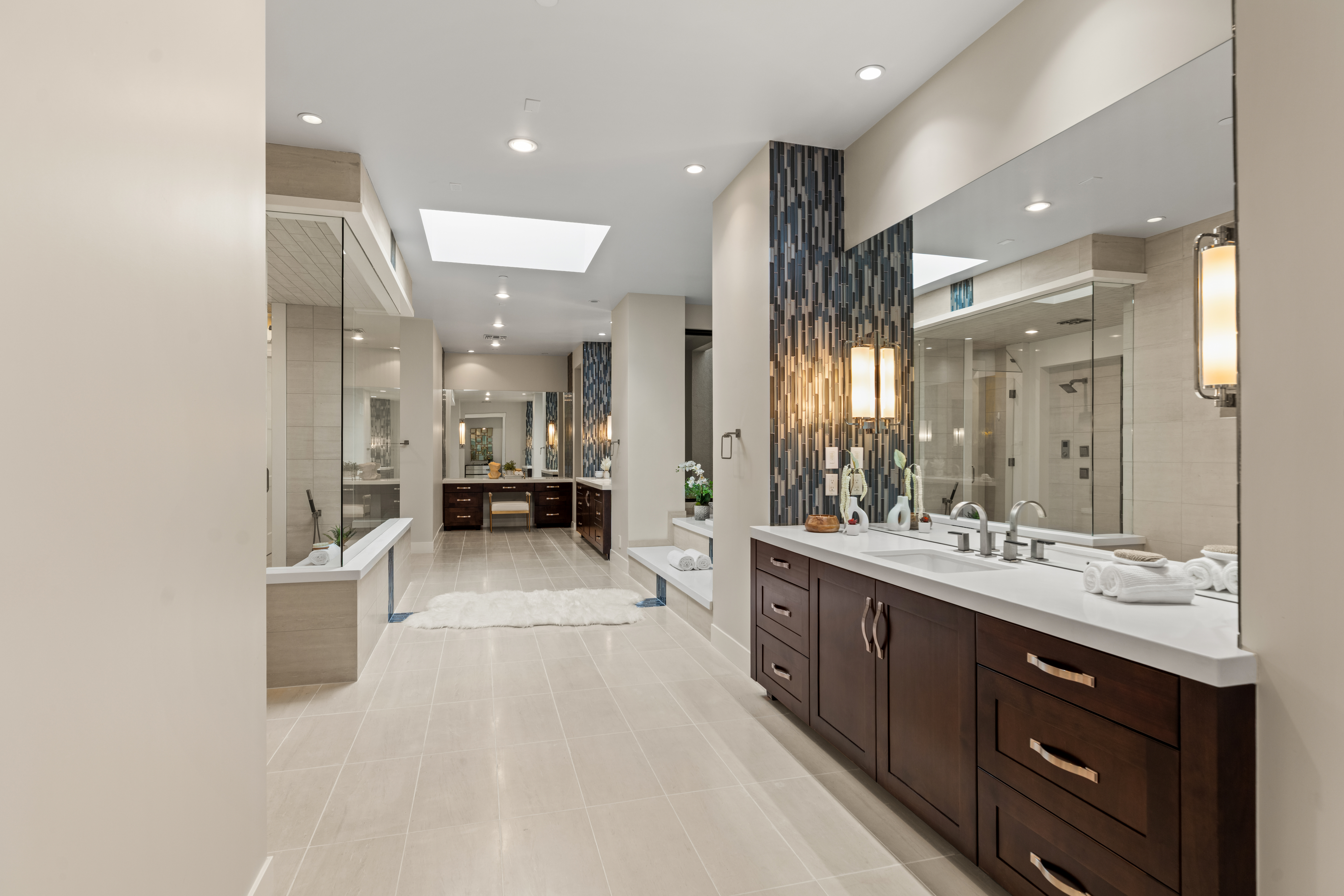Designed with serenity in mind, the primary bath features dual vanities, a deep soaking tub, and spa-like finishes that create a true sense of escape. Subtle textures, warm lighting, and refined tilework transform everyday routines into moments of quiet indulgence.