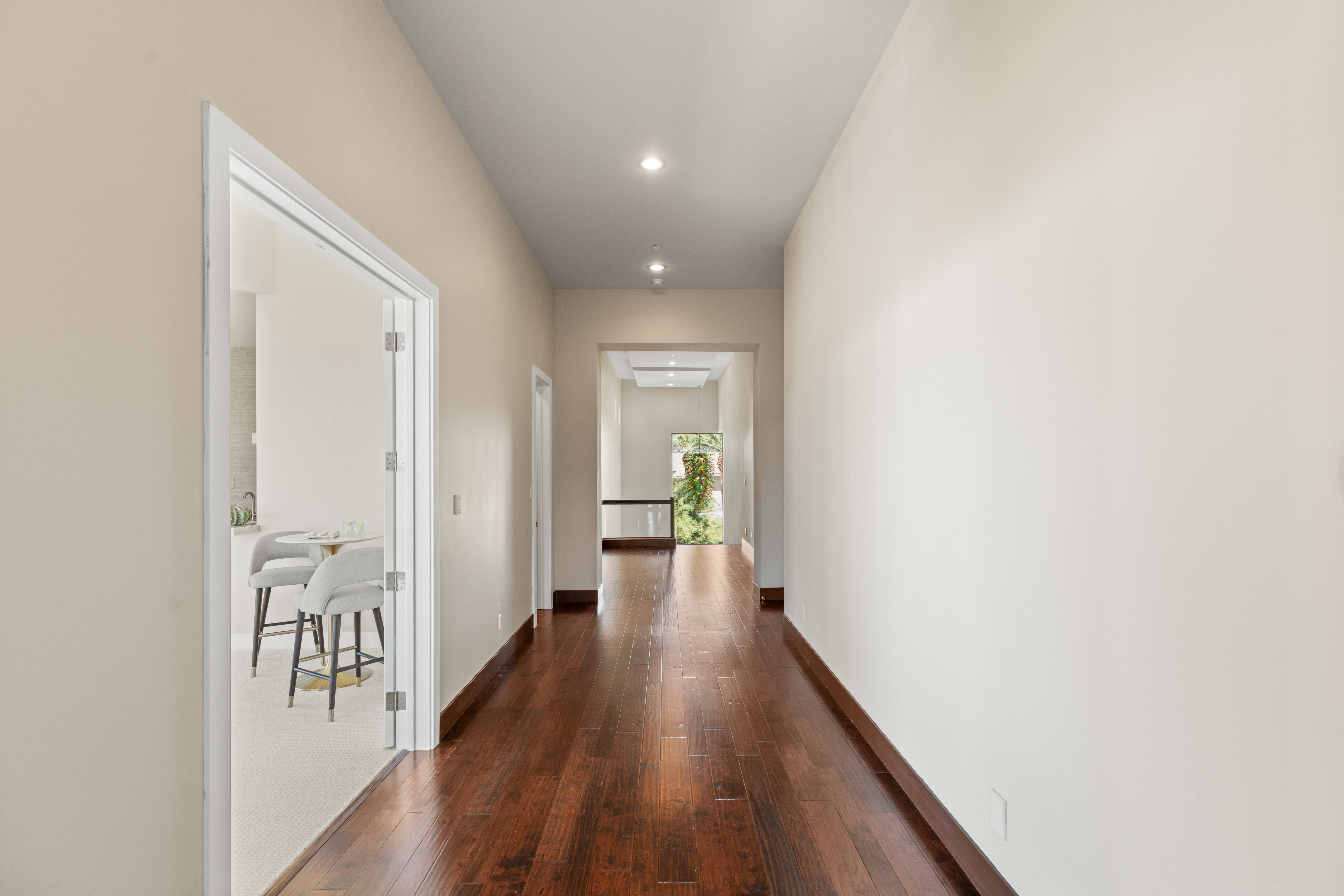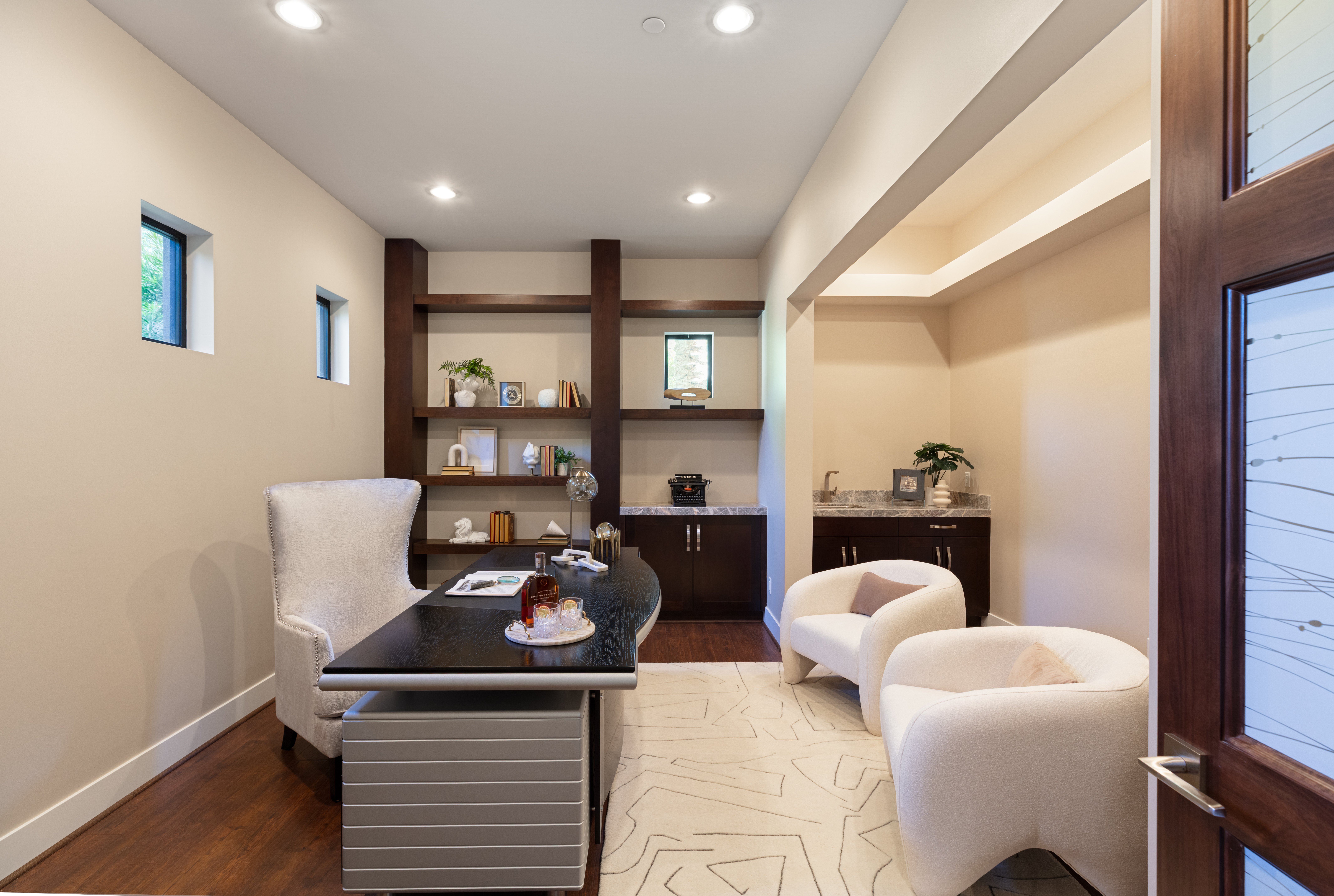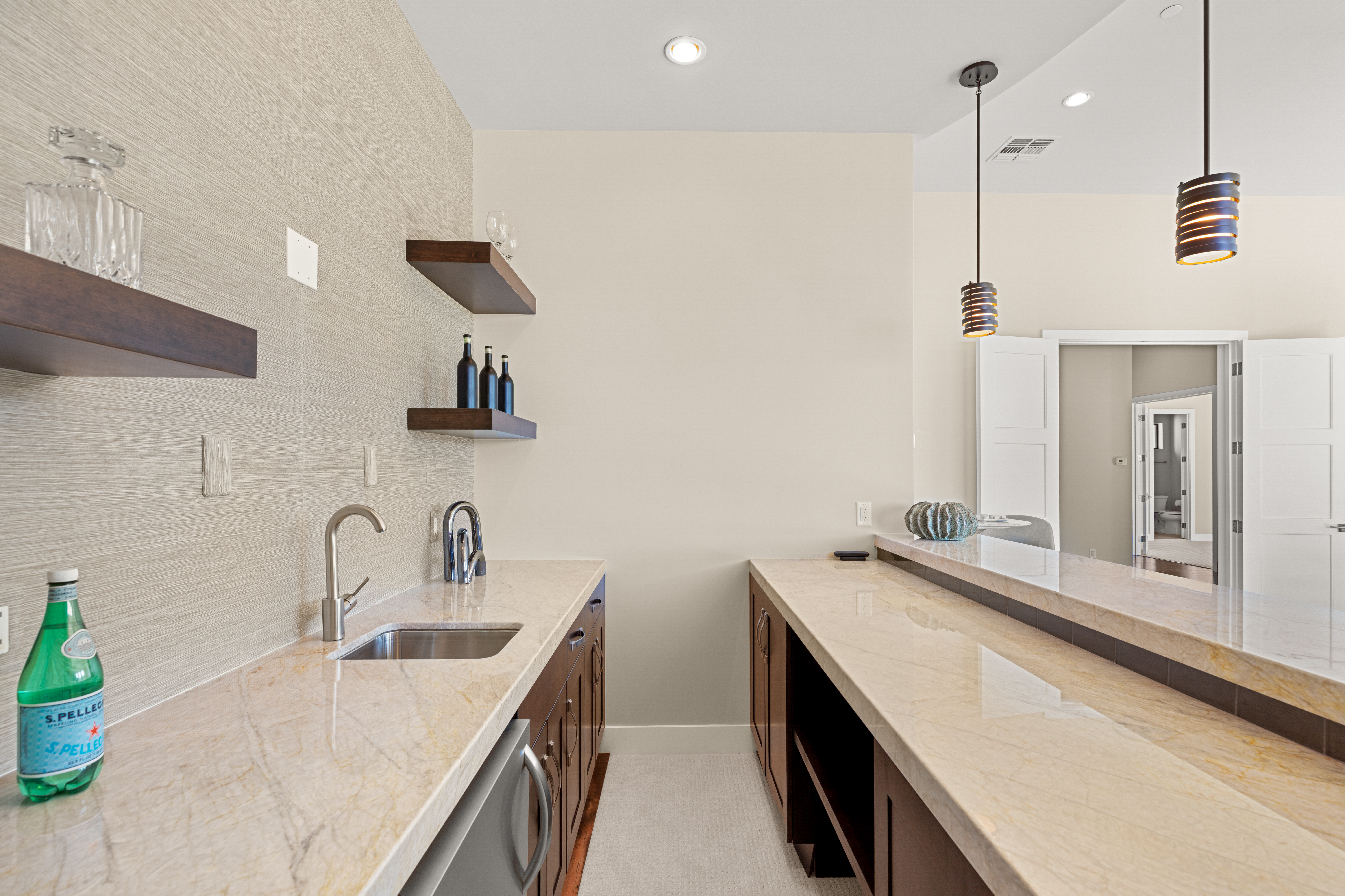 A modern culinary centerpiece designed for both artistry and function. The chef’s kitchen showcases sleek cabinetry, quartz counters, and professional-grade Thermador appliances. A spacious butler’s pantry extends the experience with its own sink, refrigerator, and prep space—ideal for effortless entertaining.