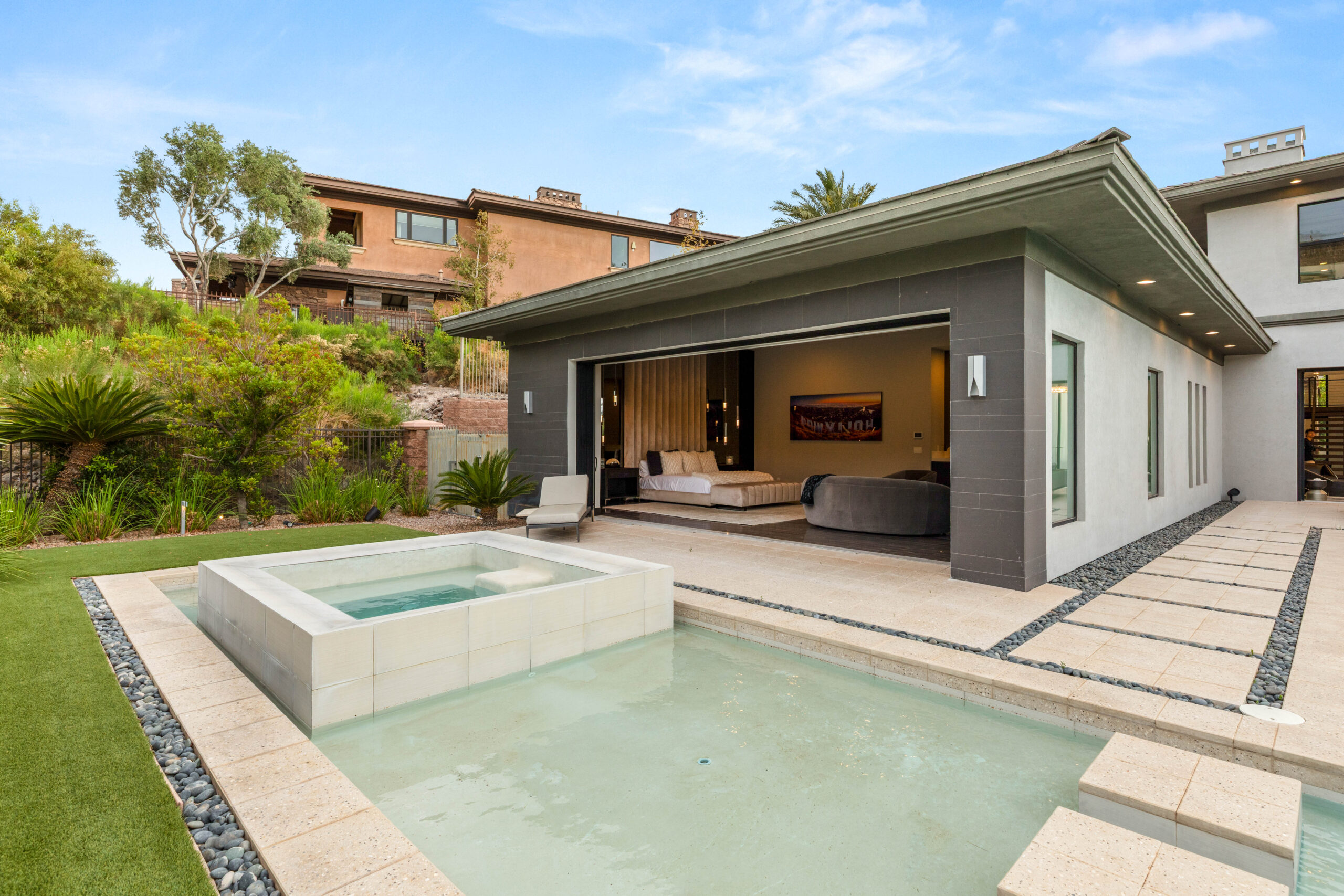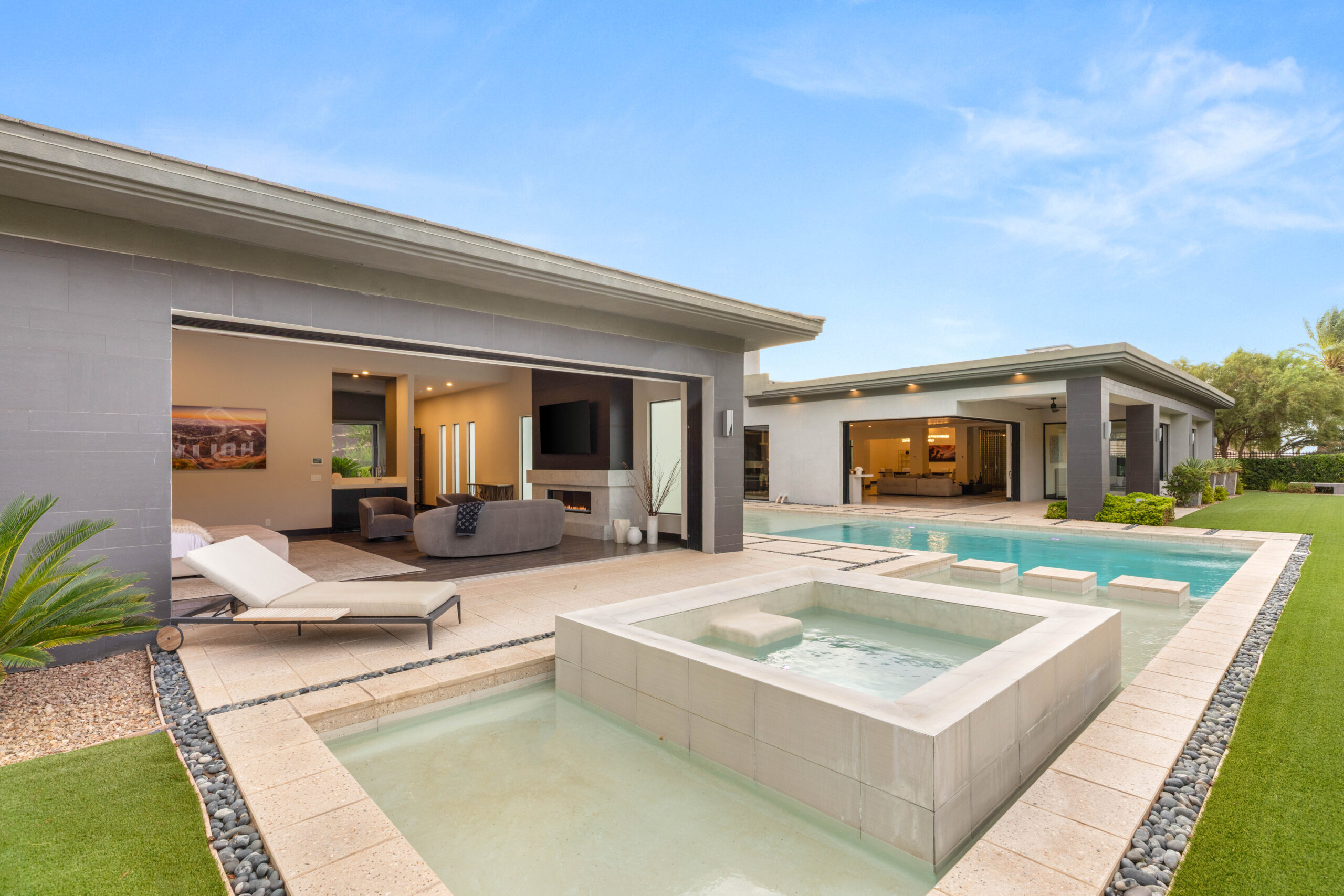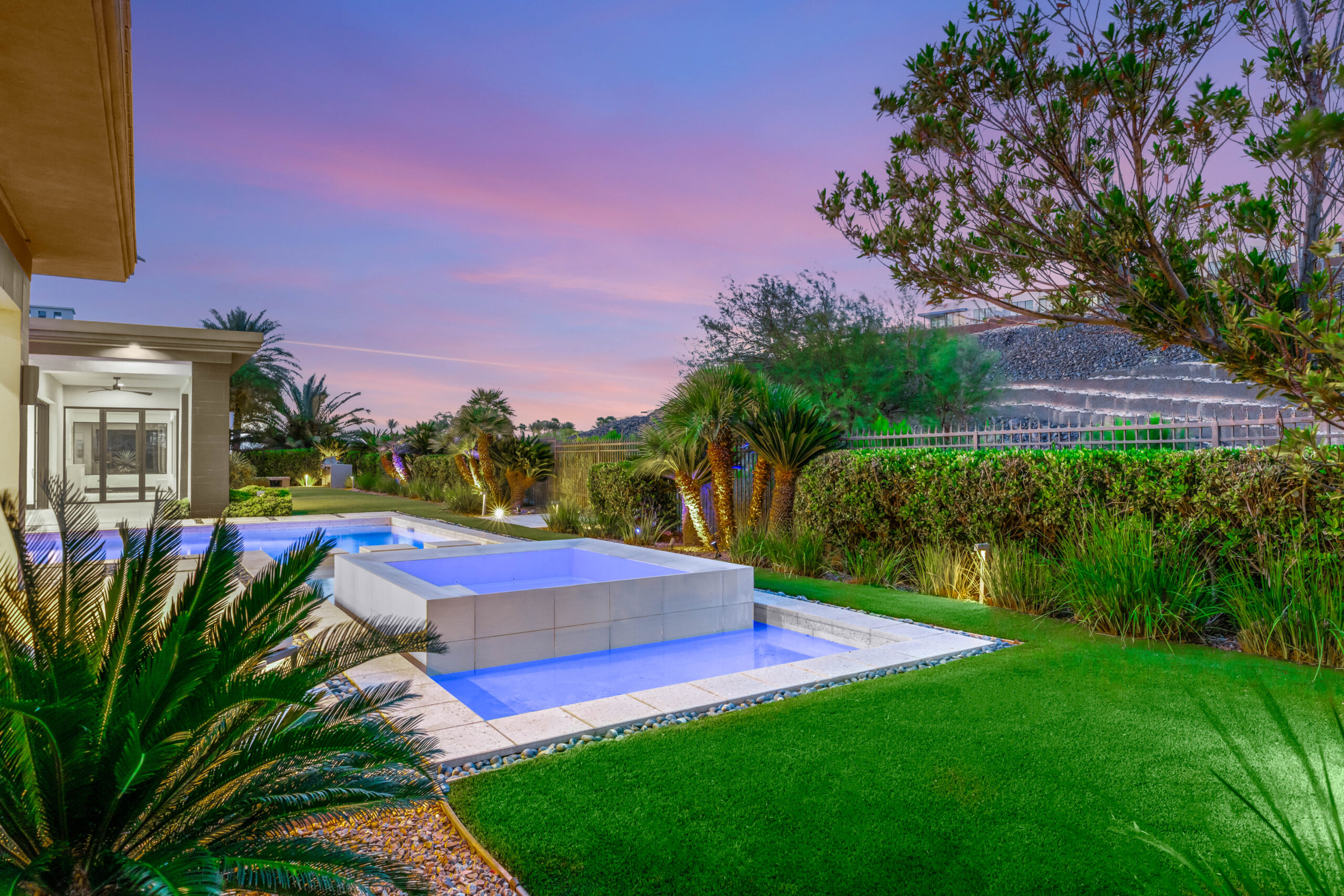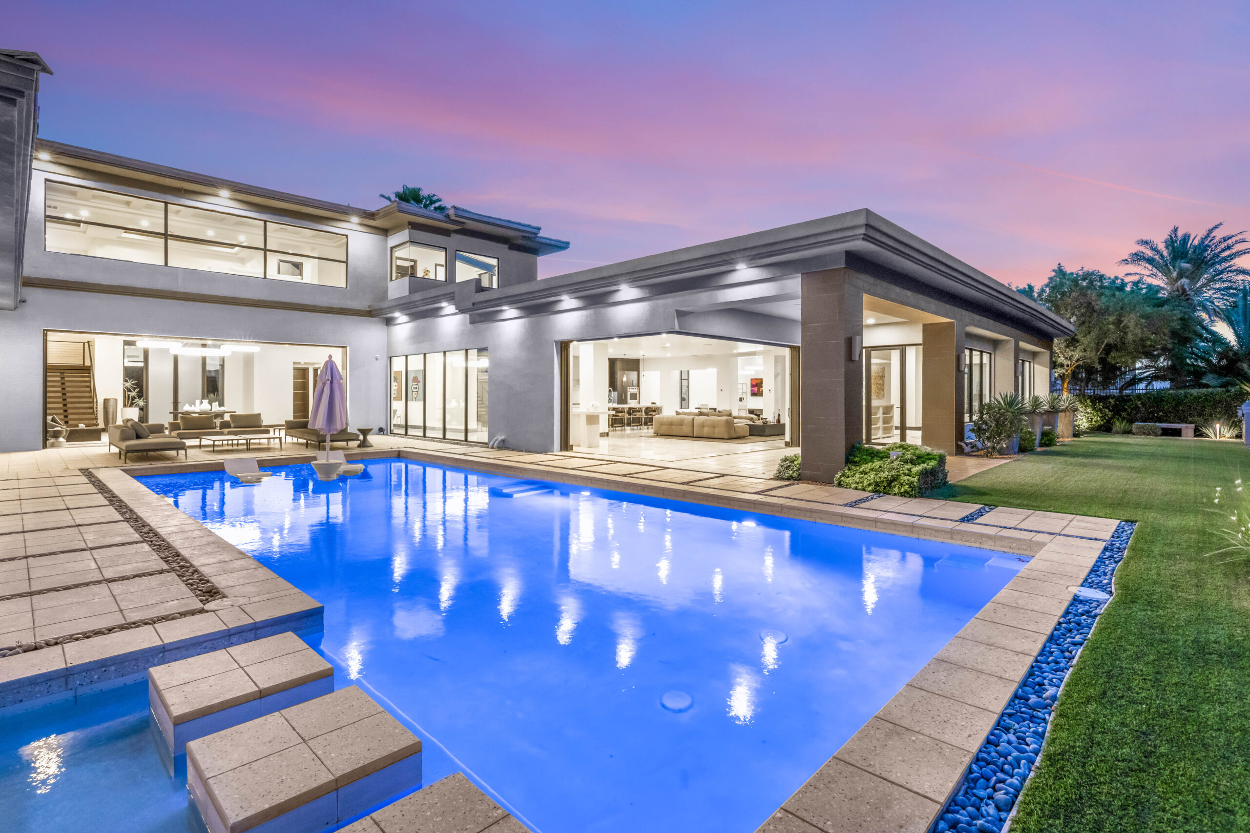 Designed as a true extension of the home, the backyard centers around a striking linear pool that reflects the home’s modern architecture. Covered patios frame both sides of the space, creating multiple areas for lounging, dining, and gathering. As evening sets in, the soft glow of lighting and open sightlines transform the setting into a private, elevated environment ideal for entertaining or unwinding under the desert sky.