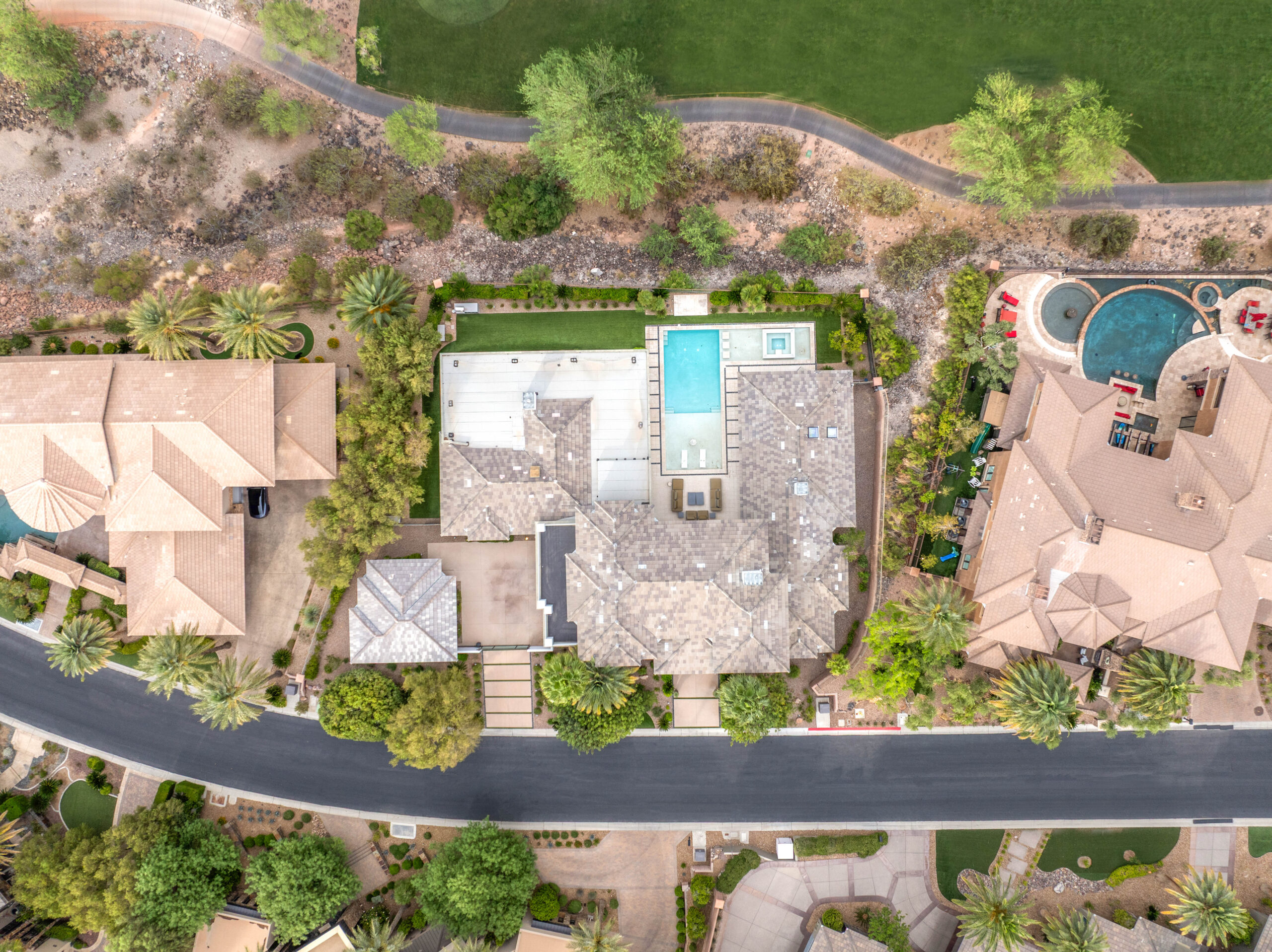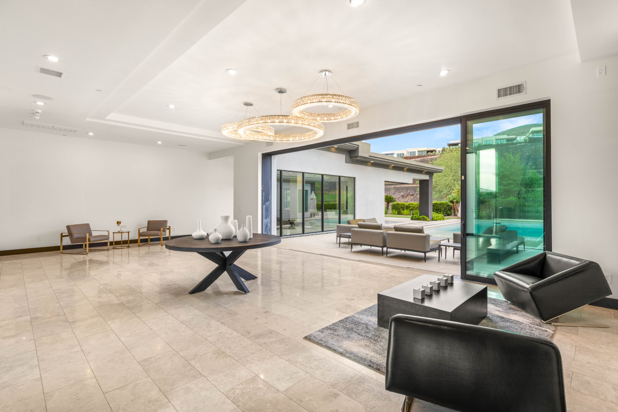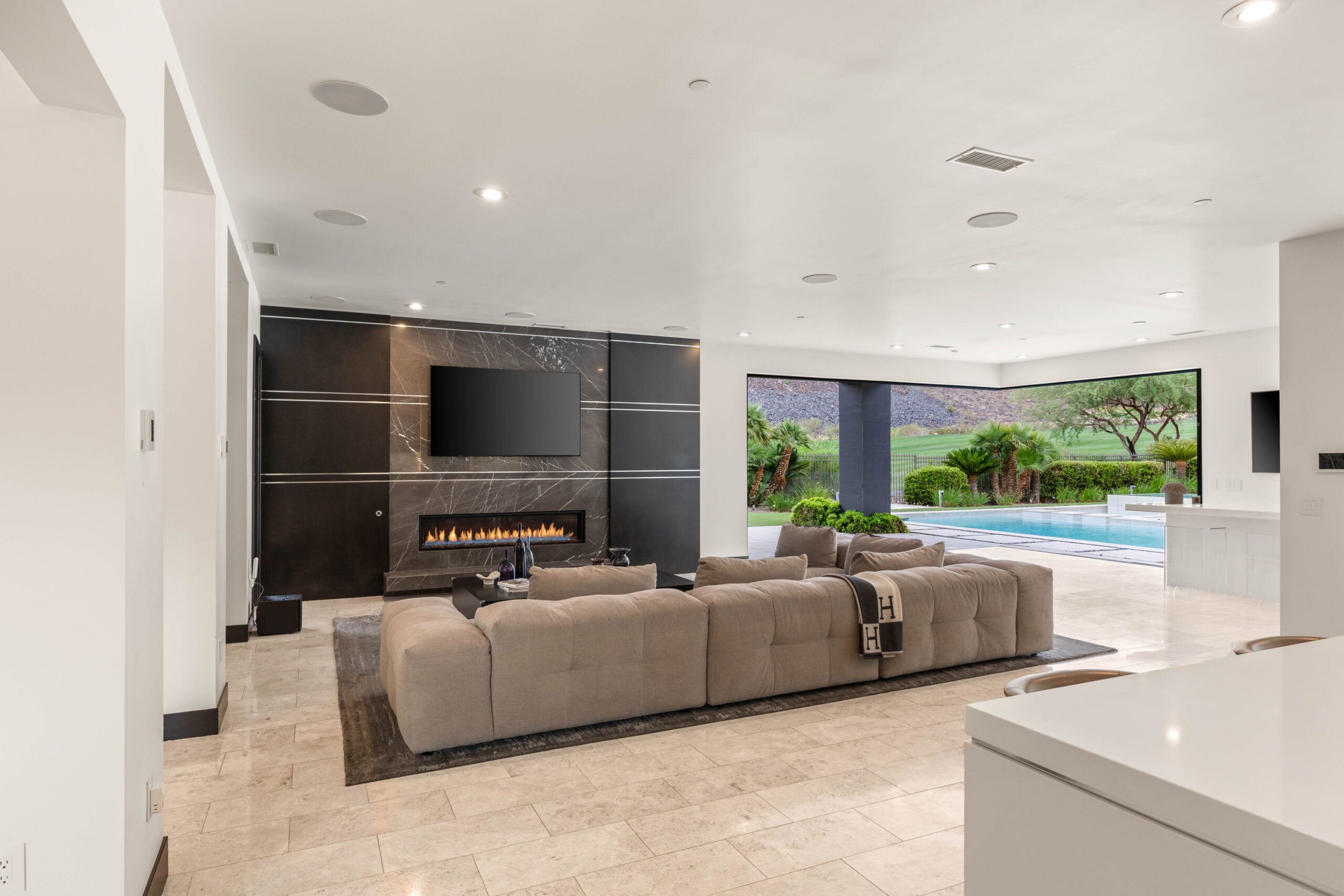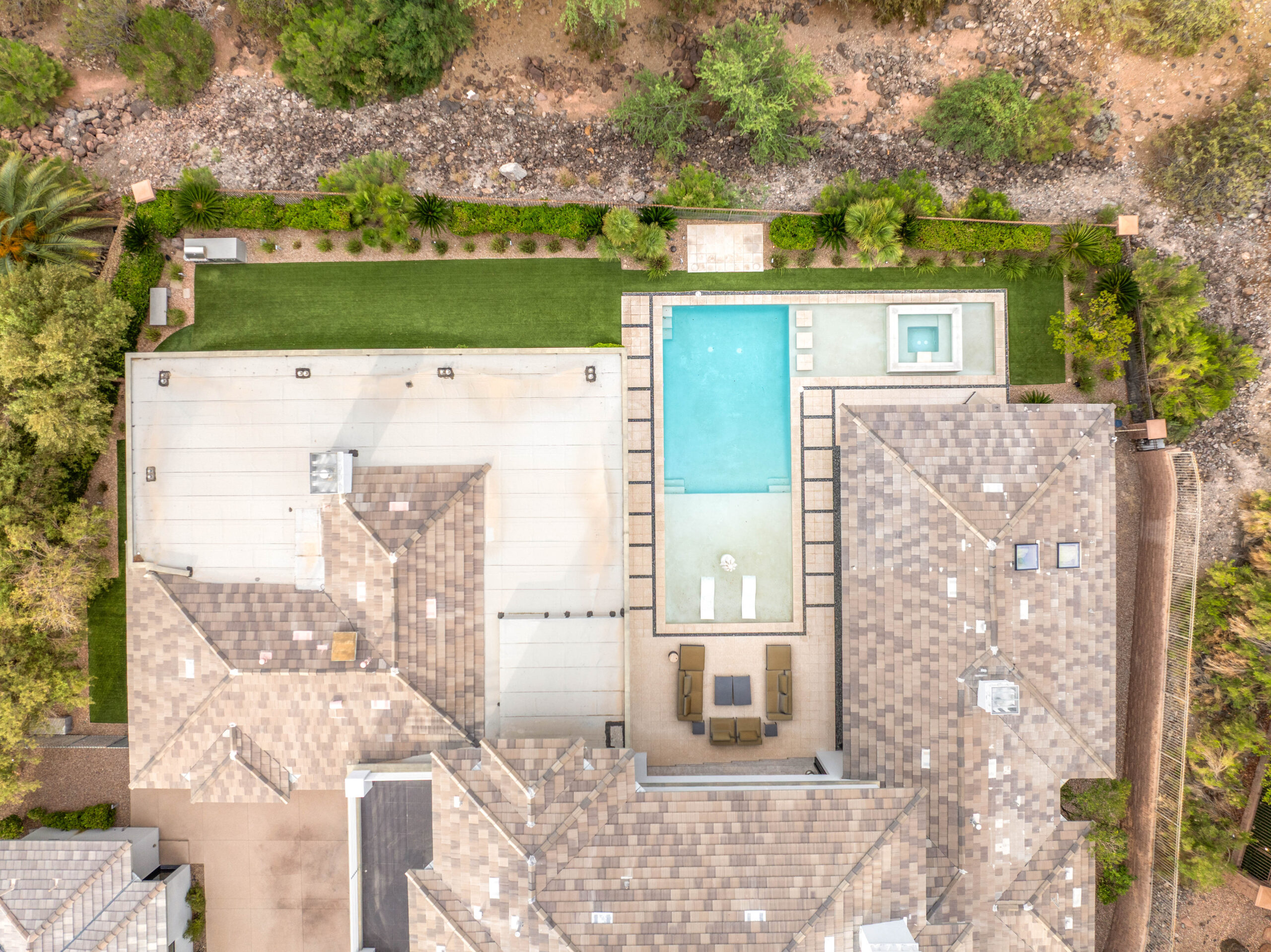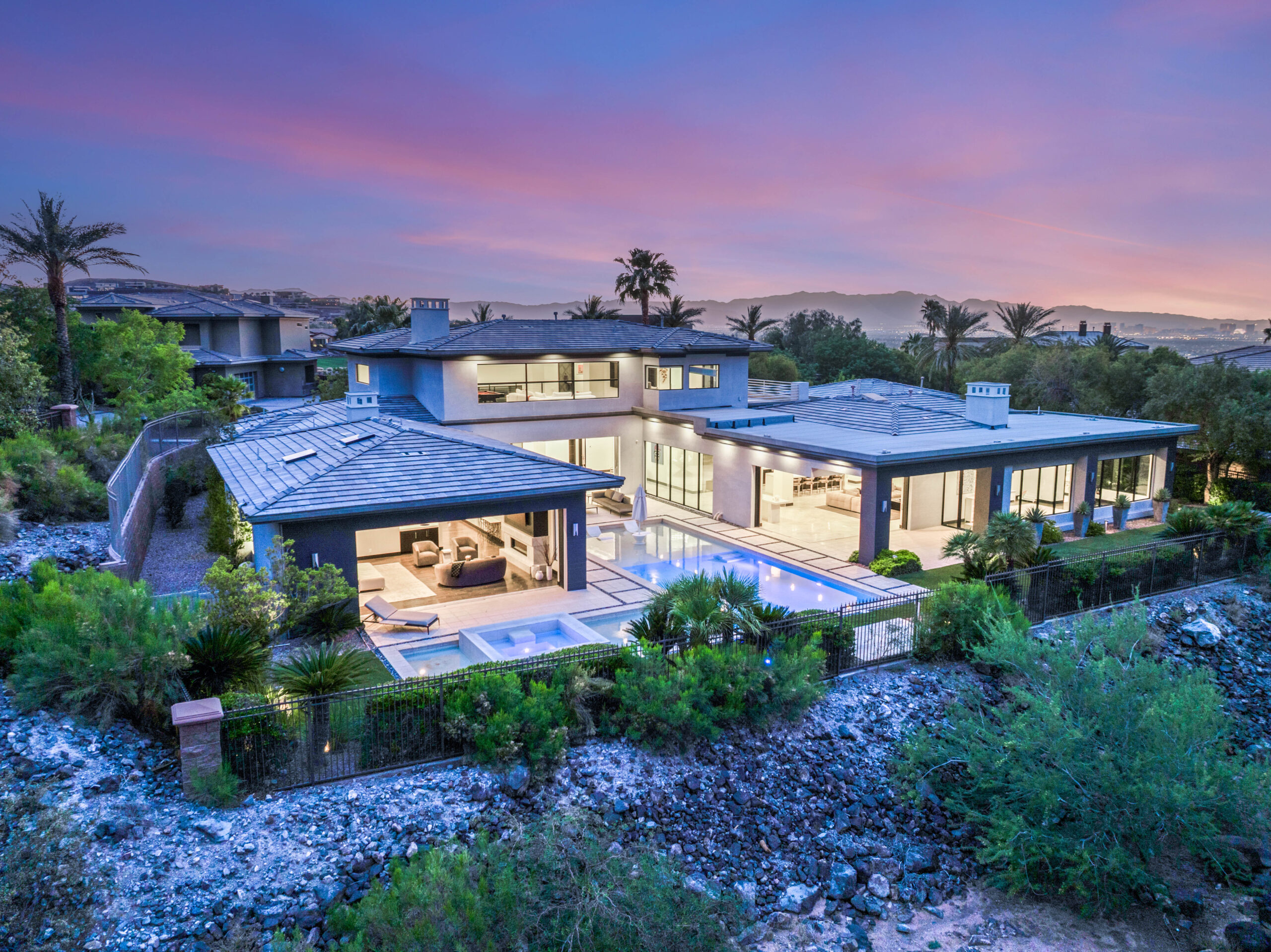Designed as a true extension of the home, the backyard centers around a striking linear pool that reflects the home’s modern architecture. Covered patios frame both sides of the space, creating multiple areas for lounging, dining, and gathering. As evening sets in, the soft glow of lighting and open sightlines transform the setting into a private, elevated environment ideal for entertaining or unwinding under the desert sky.