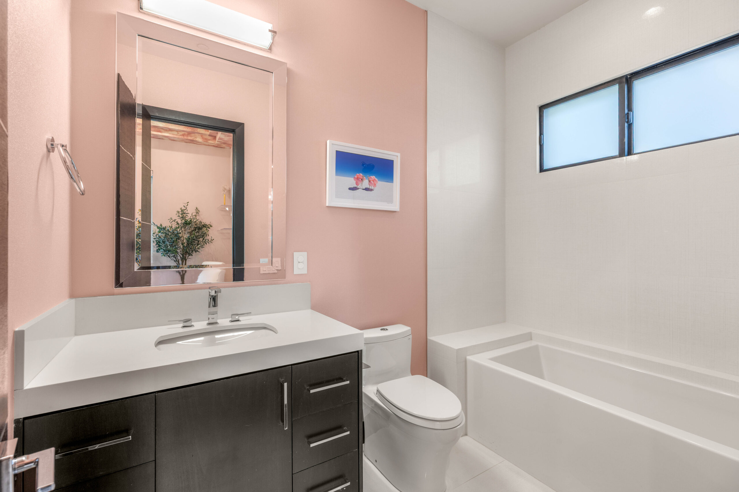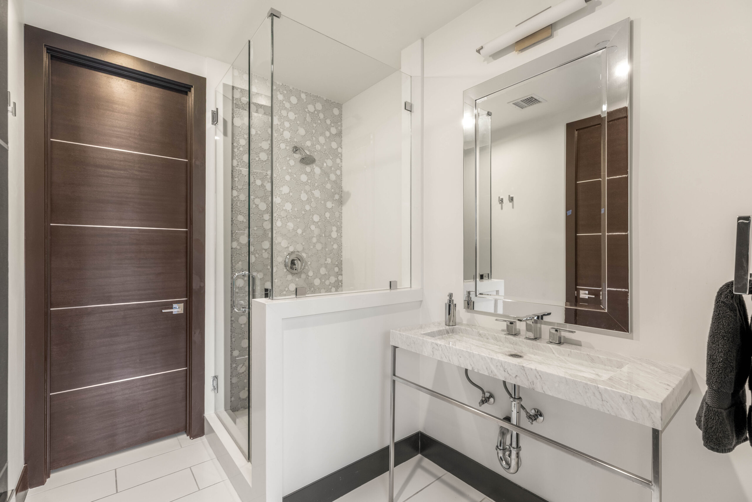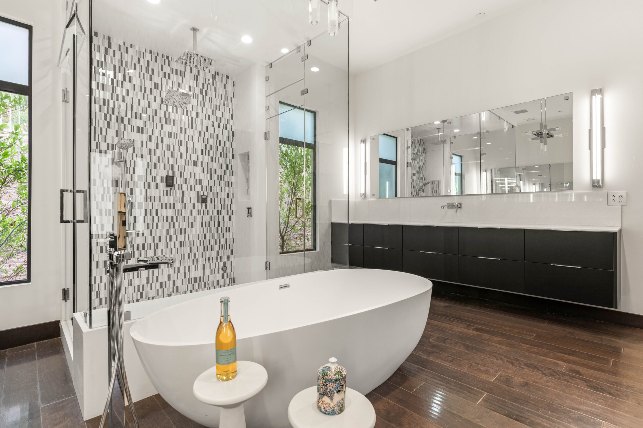 The primary bath is designed to feel expansive and refined. A freestanding soaking tub anchors the space, paired with dual vanities, modern lighting, and a glass-enclosed shower. Clean lines, warm wood flooring, and carefully selected materials create an environment that feels elevated yet effortless.