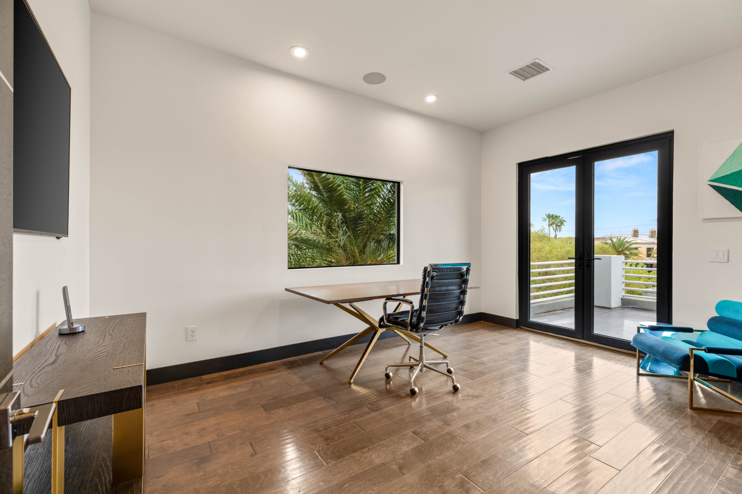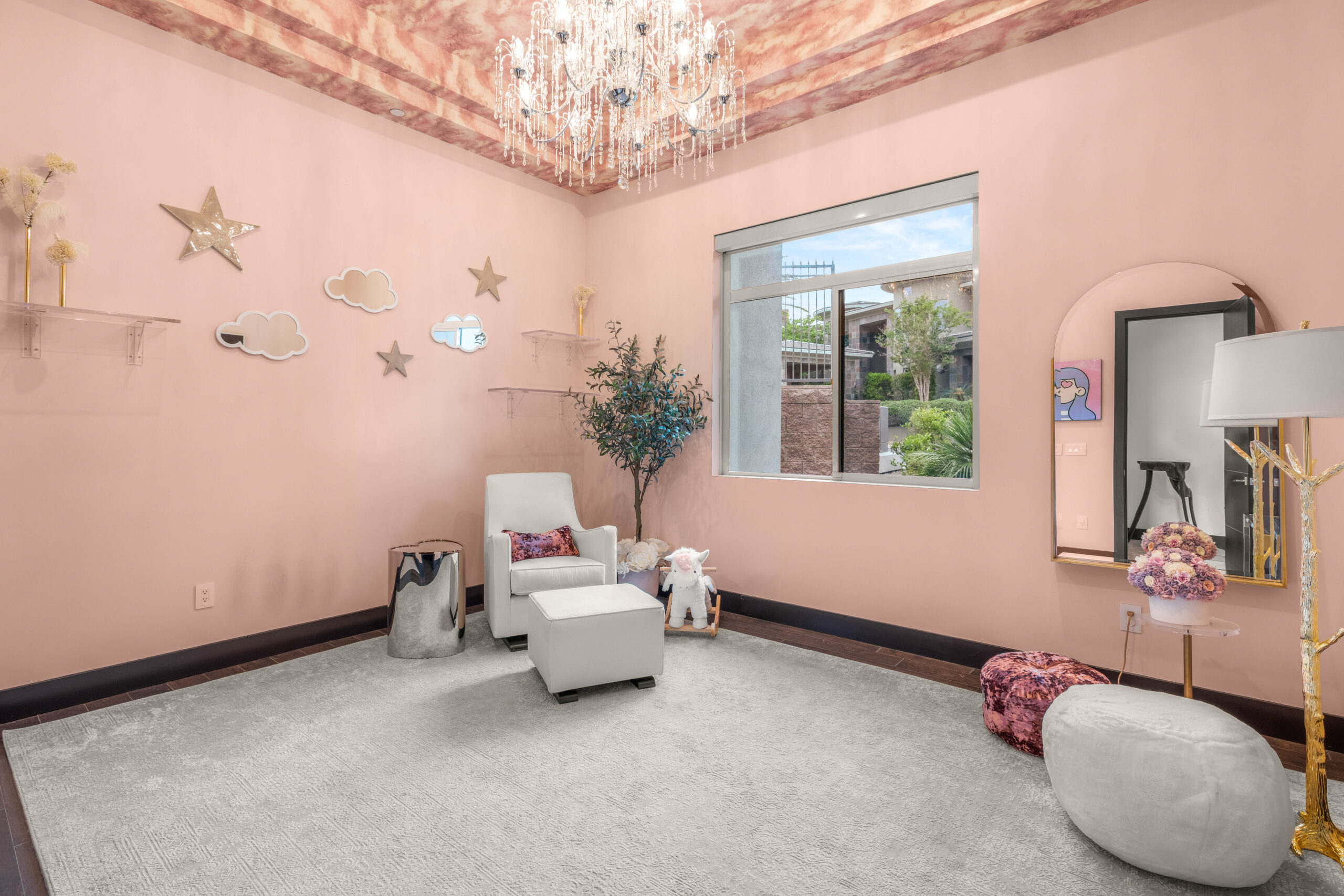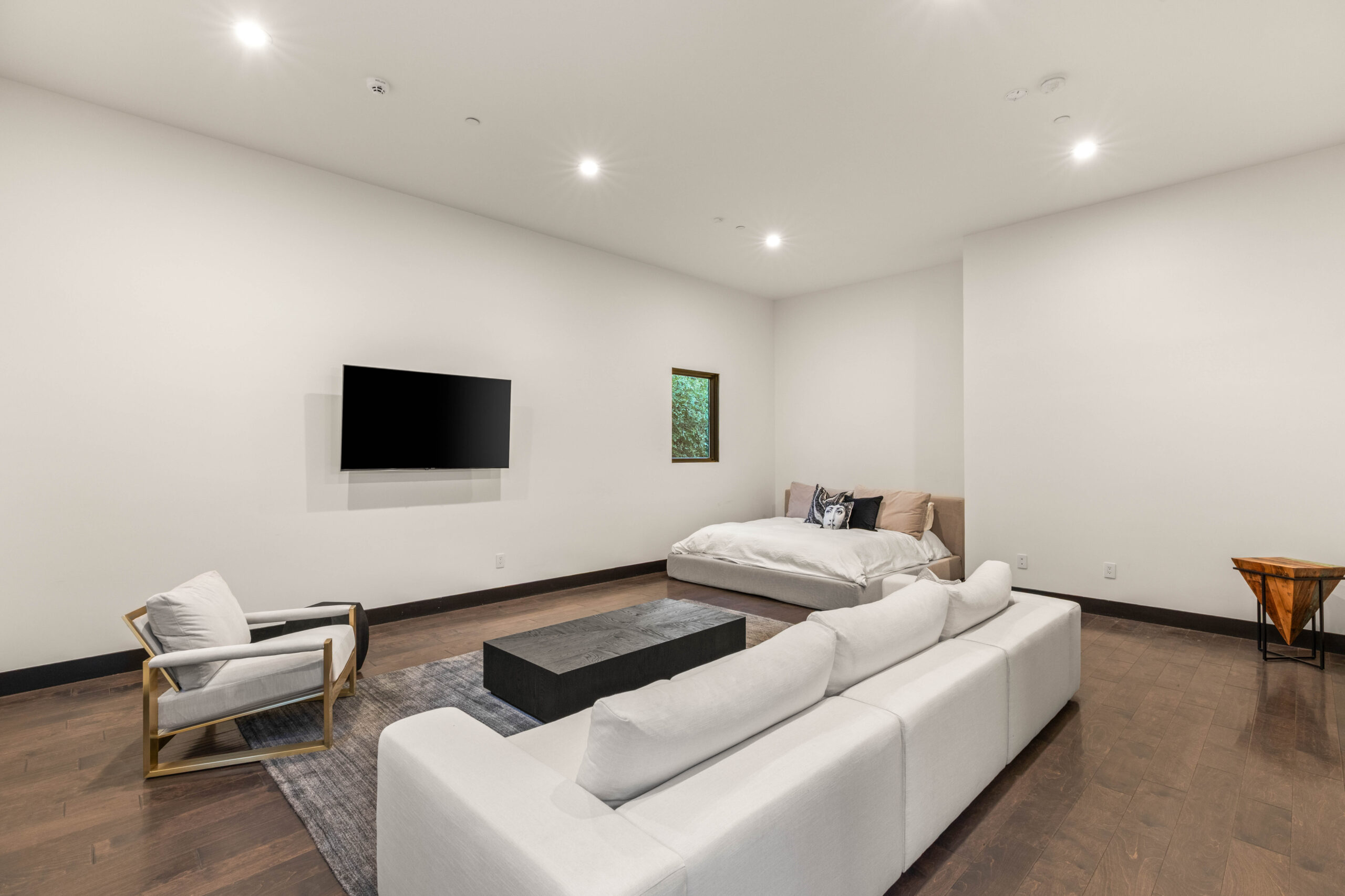 The loft offers a flexible space suited for relaxation, recreation, or casual gatherings. Framed by oversized windows and detailed ceiling work, the room feels open and bright while maintaining a sense of separation from the main living areas—ideal for a media lounge, game space, or secondary living room.
