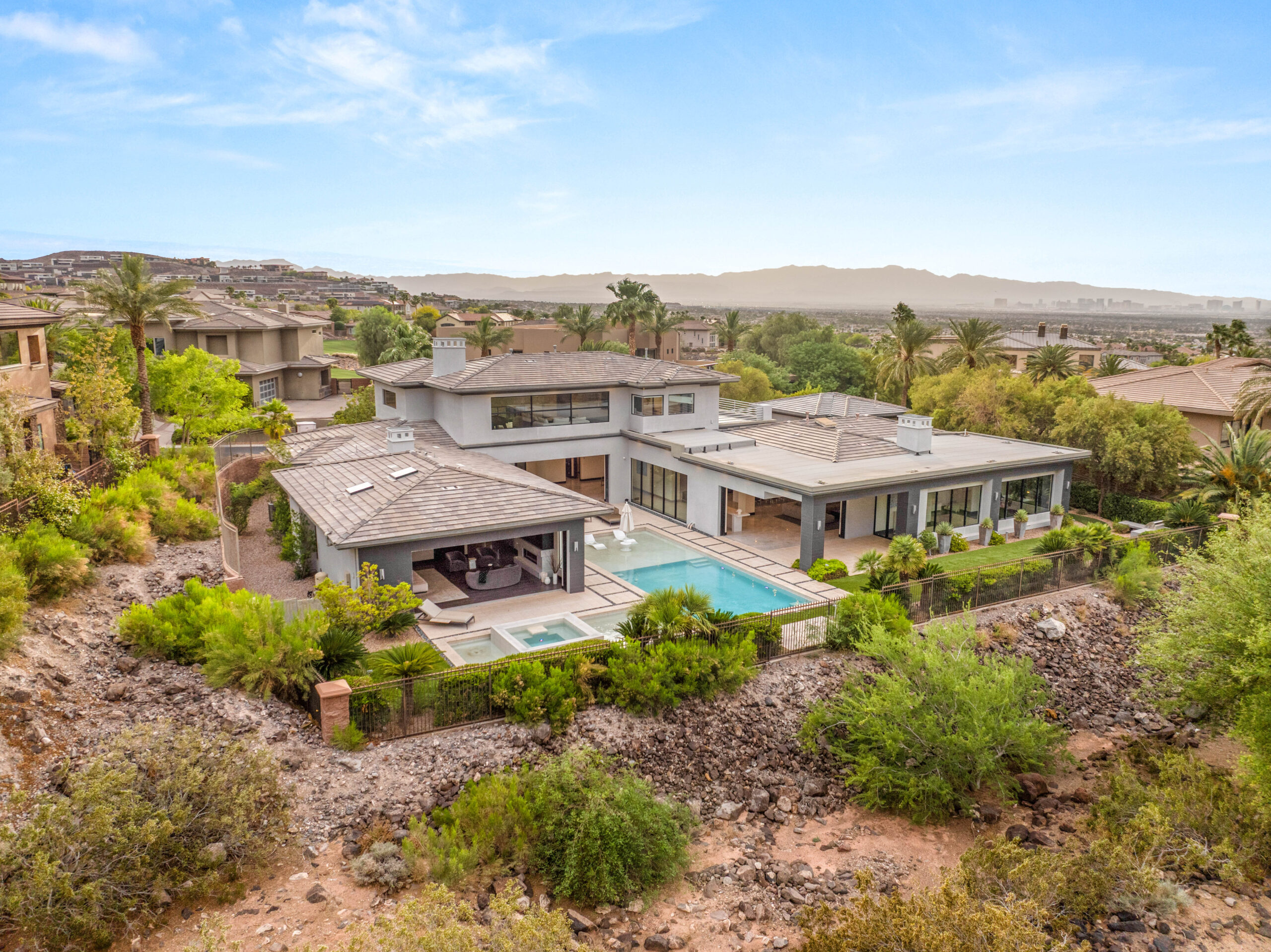 Tucked behind the gates of MacDonald Highlands, this exquisite Estate at 584 Saint Croix offers elevated desert living with sweeping views and unmatched privacy. A grand open layout flows effortlessly from the designer kitchen—complete with a hidden pantry—to a light-filled living space, perfect for entertaining. The main-level primary suite is a serene retreat, complemented by a wine cellar, and six spacious bedrooms with eight baths in total. Step outside to lush landscaping, a resort-style pool, hot tub, casita, and a generous lot designed to impress. Nestled in one of Henderson’s most exclusive guard-gated communities, known for its golf, clubhouse, and city views, this is a rare opportunity to own a true masterpiece in MacDonald Highlands.