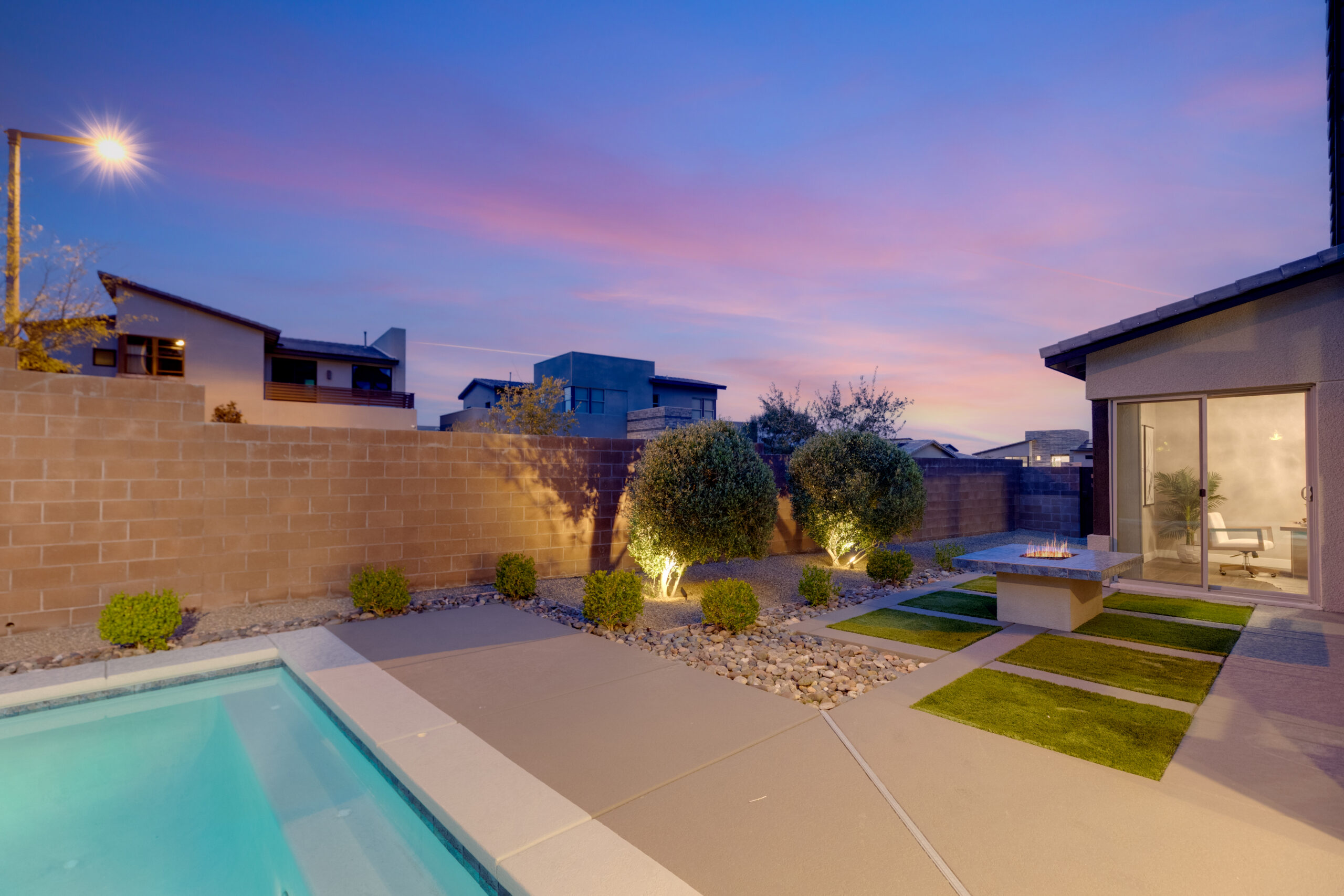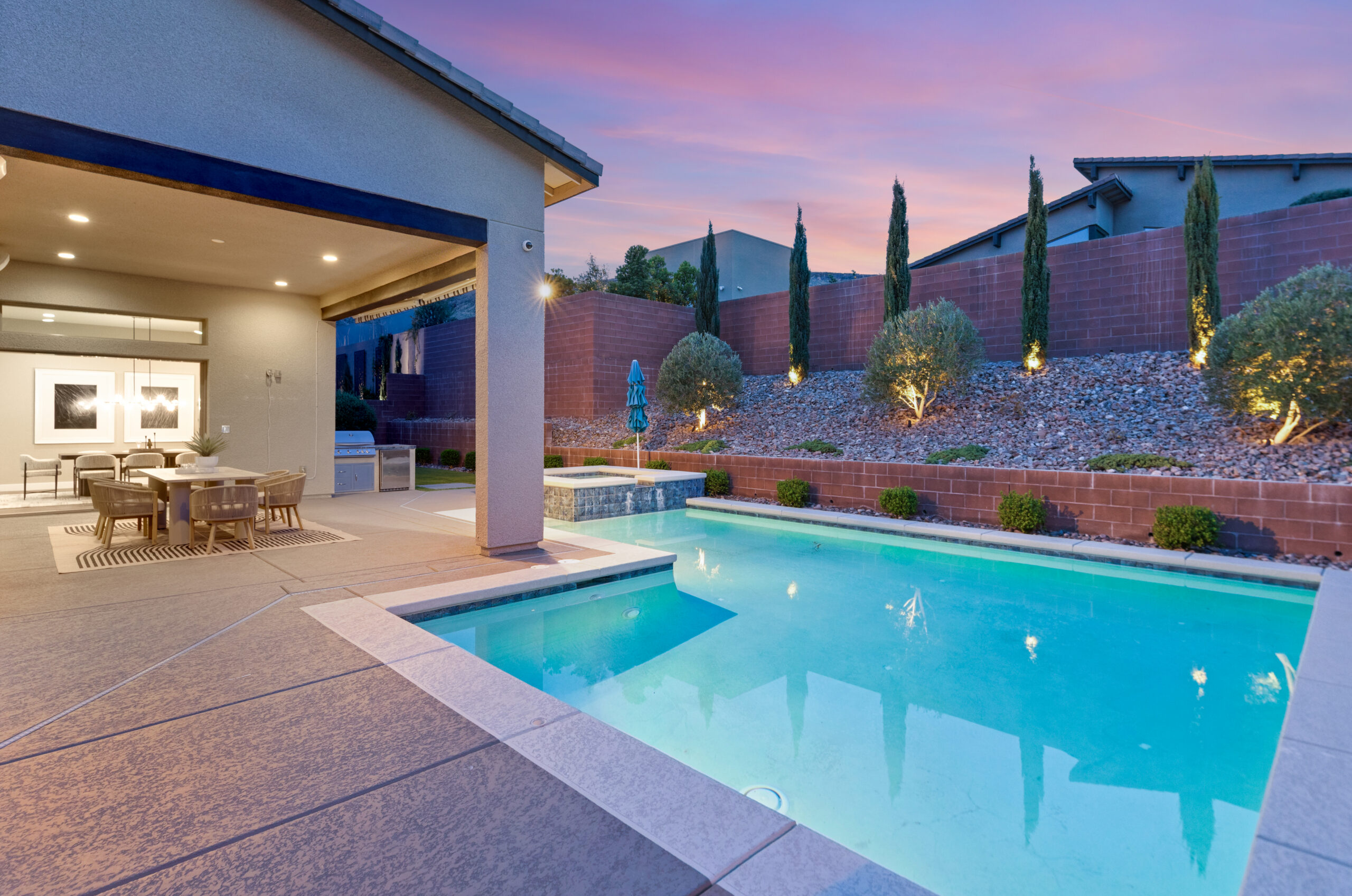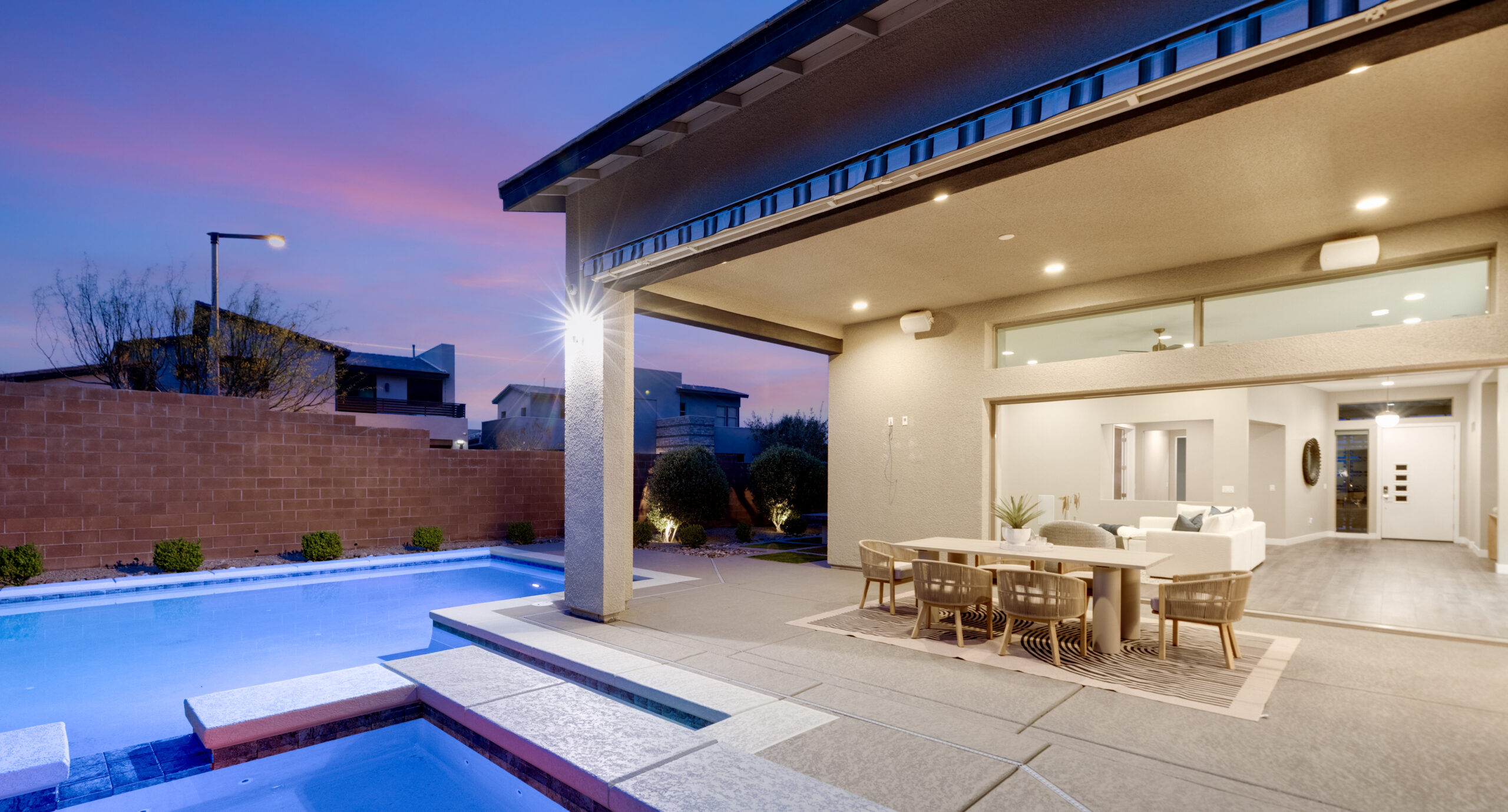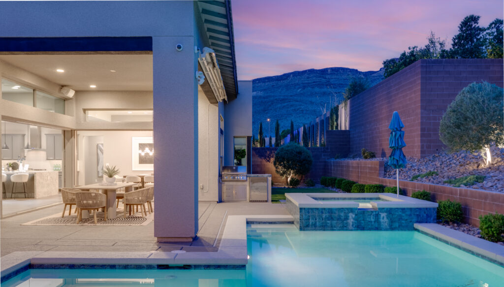 As the sun sets, the backyard takes on a different rhythm. The pool and spa become the focal point, surrounded by intentional design and open sky, while the covered patio offers a place to gather, unwind, and extend the day just a little longer. It is a setting that feels both private and expansive, designed for quiet moments and memorable evenings alike.