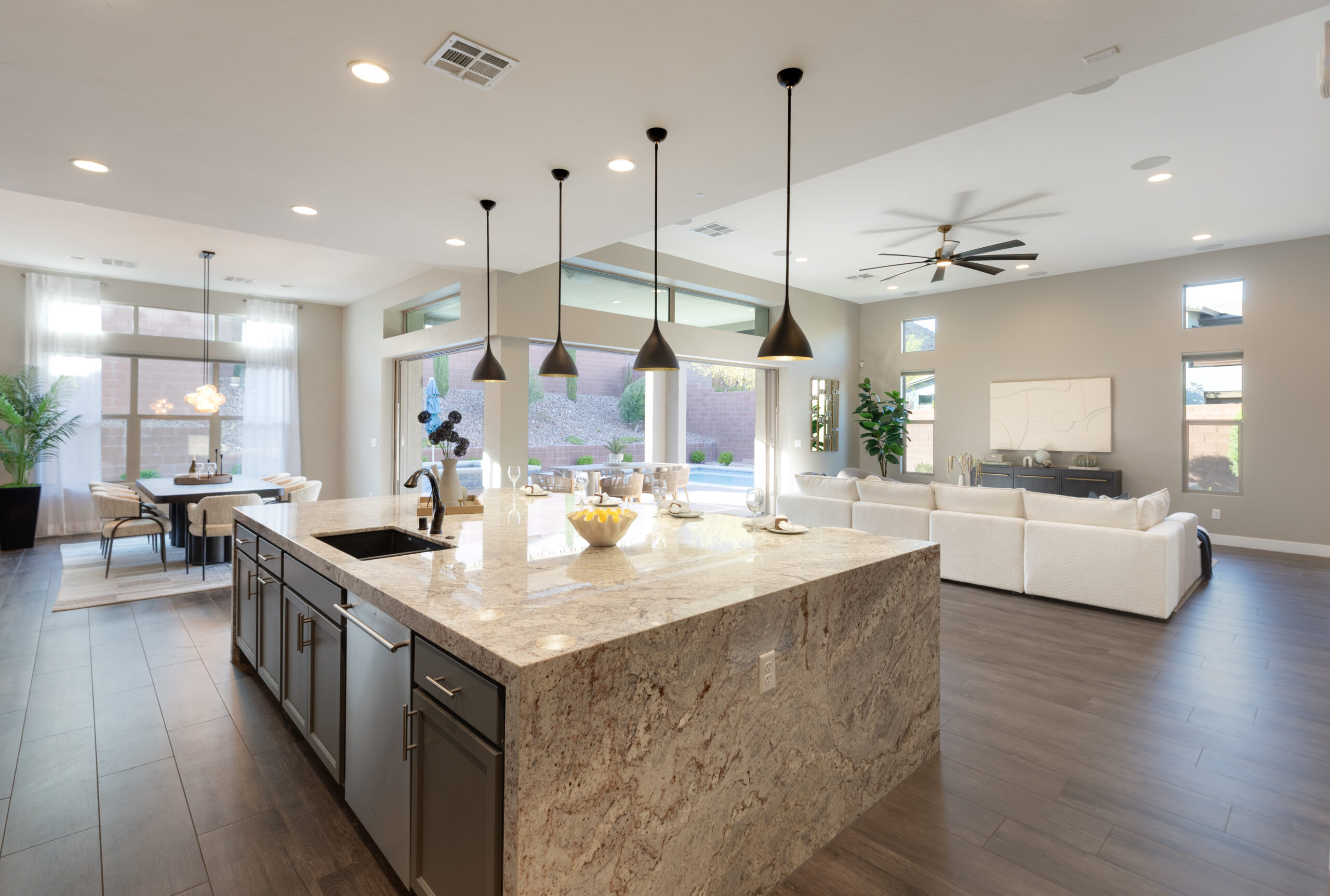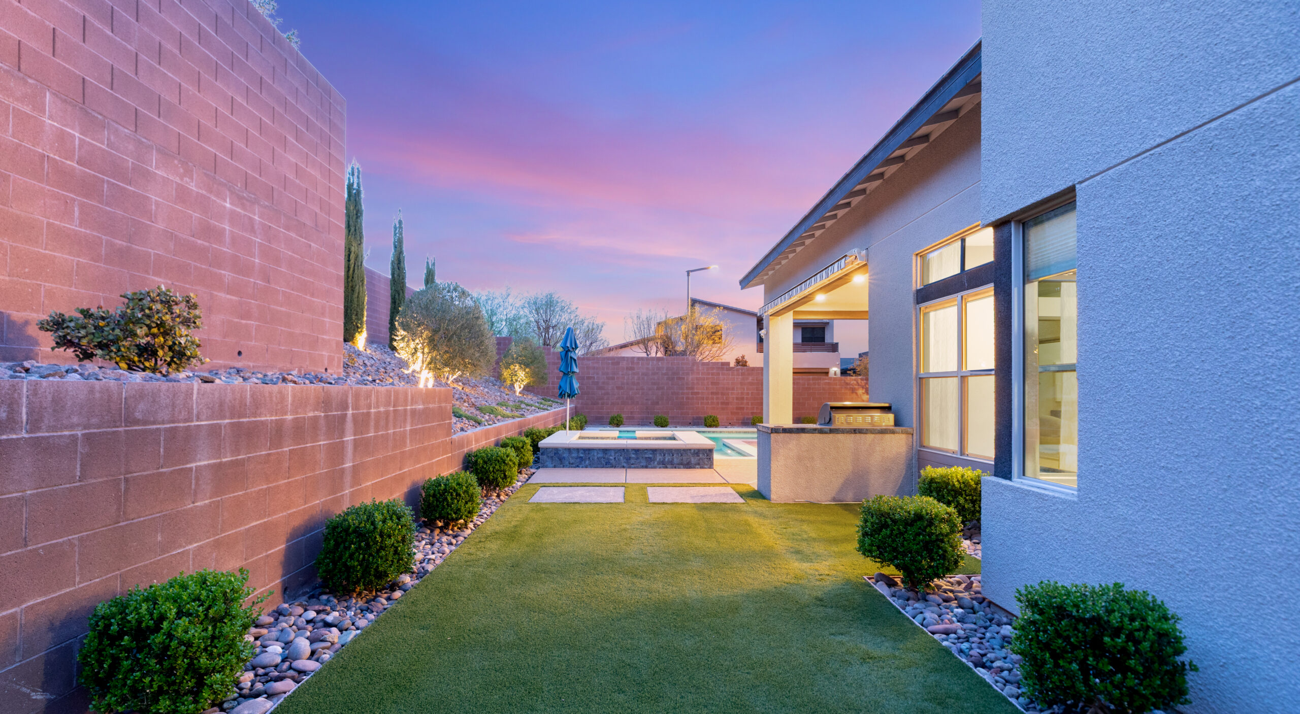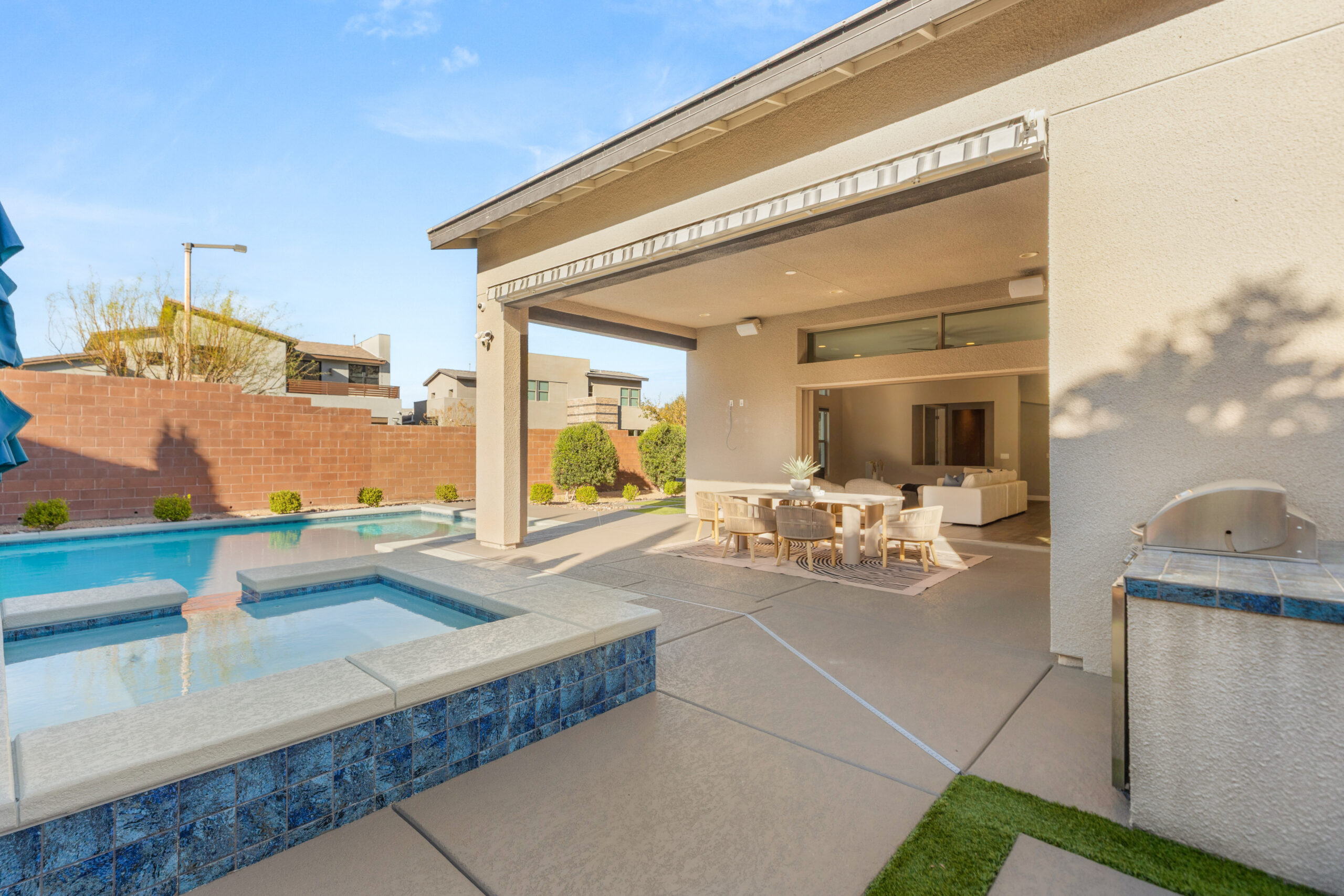 As the sun sets, the backyard takes on a different rhythm. The pool and spa become the focal point, surrounded by intentional design and open sky, while the covered patio offers a place to gather, unwind, and extend the day just a little longer. It is a setting that feels both private and expansive, designed for quiet moments and memorable evenings alike.