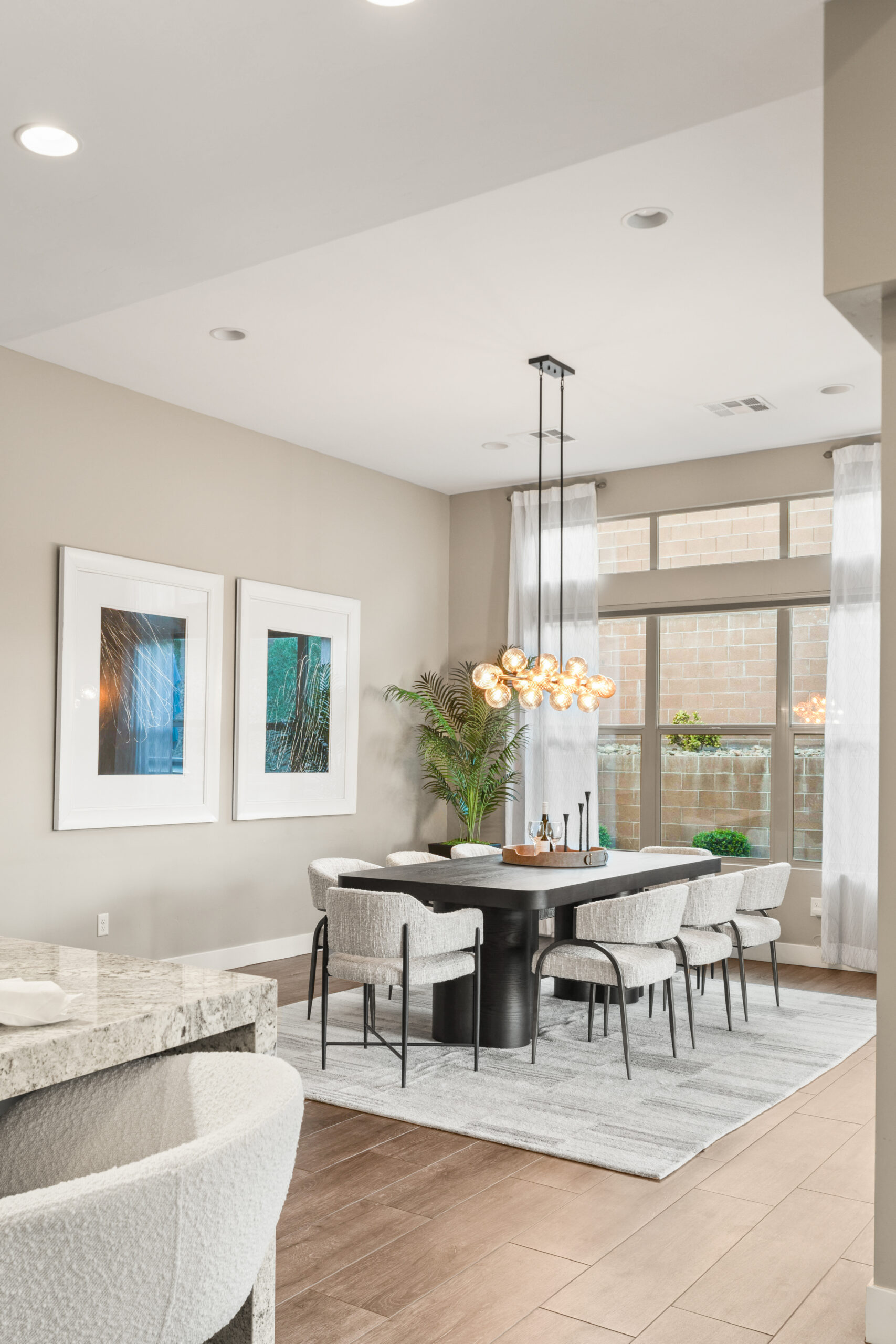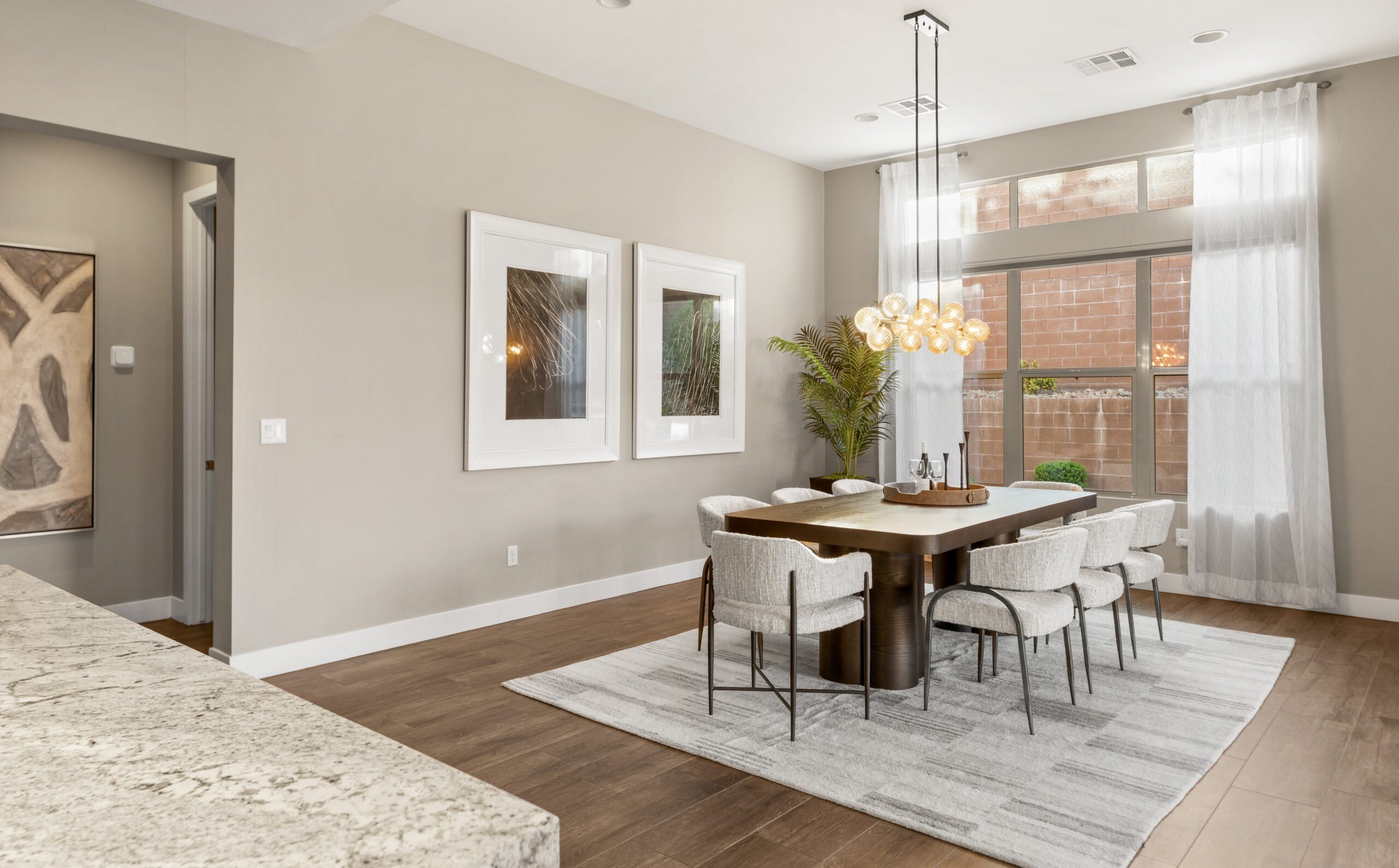 Just beyond the kitchen, the dining area is framed by natural light and direct access to the outdoors, creating an inviting setting for both everyday meals and special gatherings. The connection to the patio allows conversations to carry easily between spaces, reinforcing the home’s effortless flow.