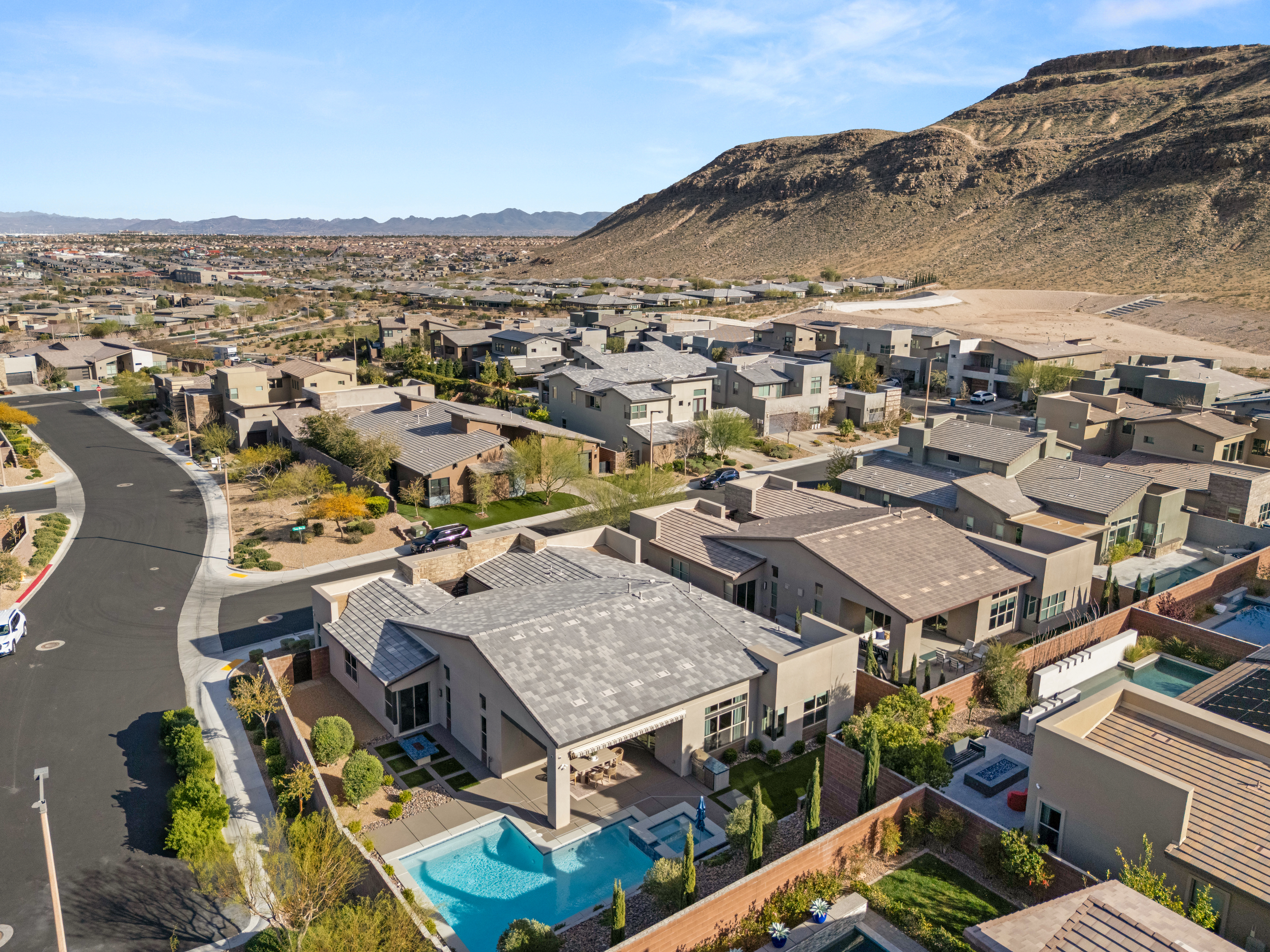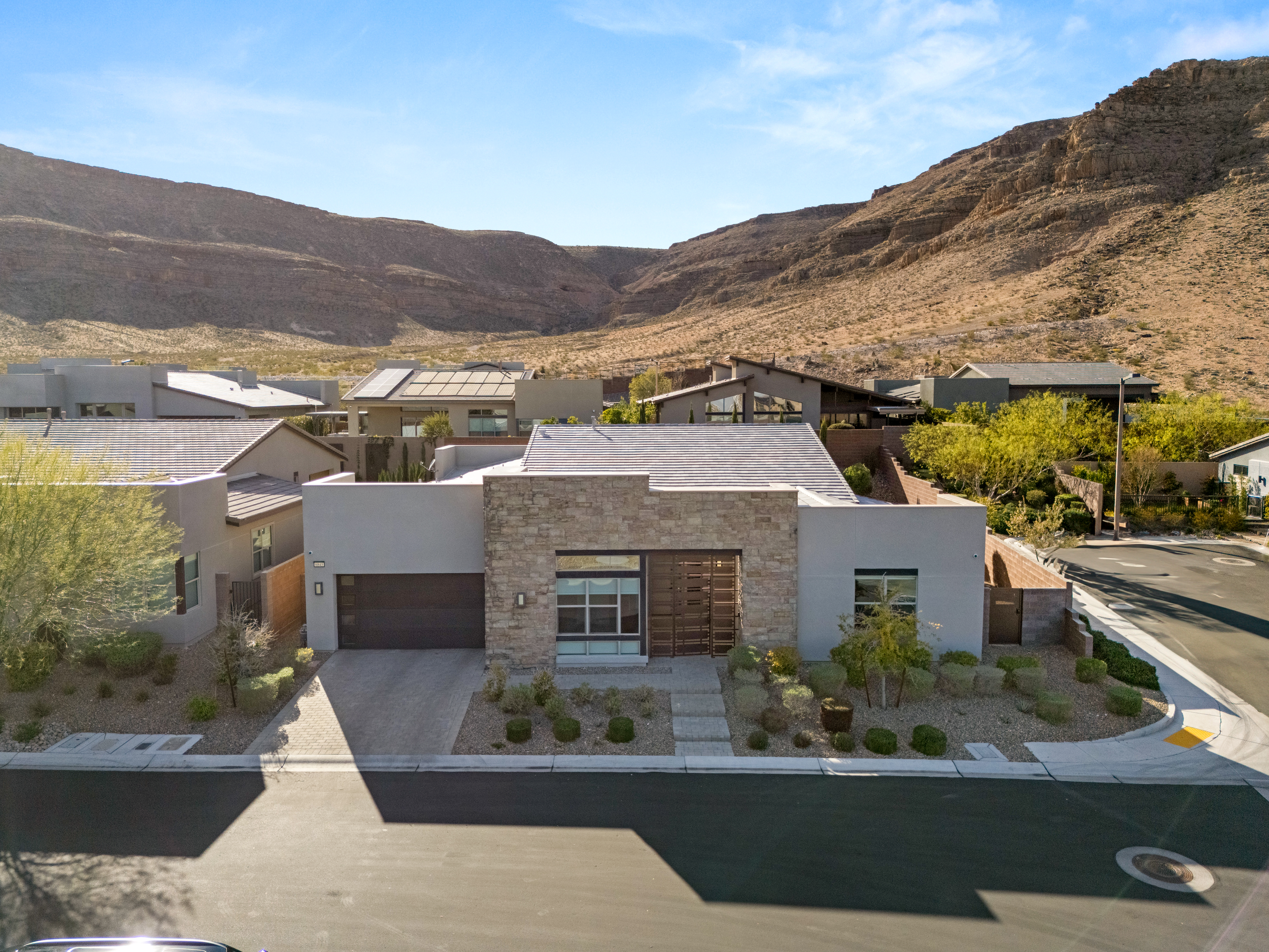 Set on a premium corner lot behind a gated courtyard entry, this single-story residence offers refined living with seamless indoor-outdoor flow. Vaulted ceilings, recessed lighting, and rolling glass walls open to a private backyard retreat complete with a pool, spa, BBQ, and fire pit. The open-concept design centers around a spacious kitchen with abundant cabinetry, modern appliances, and an oversized granite island, all flowing effortlessly into the great room. Four bedrooms plus a den provide flexibility, while the primary suite features a spa-inspired bath. Complete with a three-car tandem garage, EV charging, and smart home features with indoor and outdoor speakers. Located in The Cliffs of Summerlin, where elevated desert living meets everyday convenience. Opportunities like this are rare.